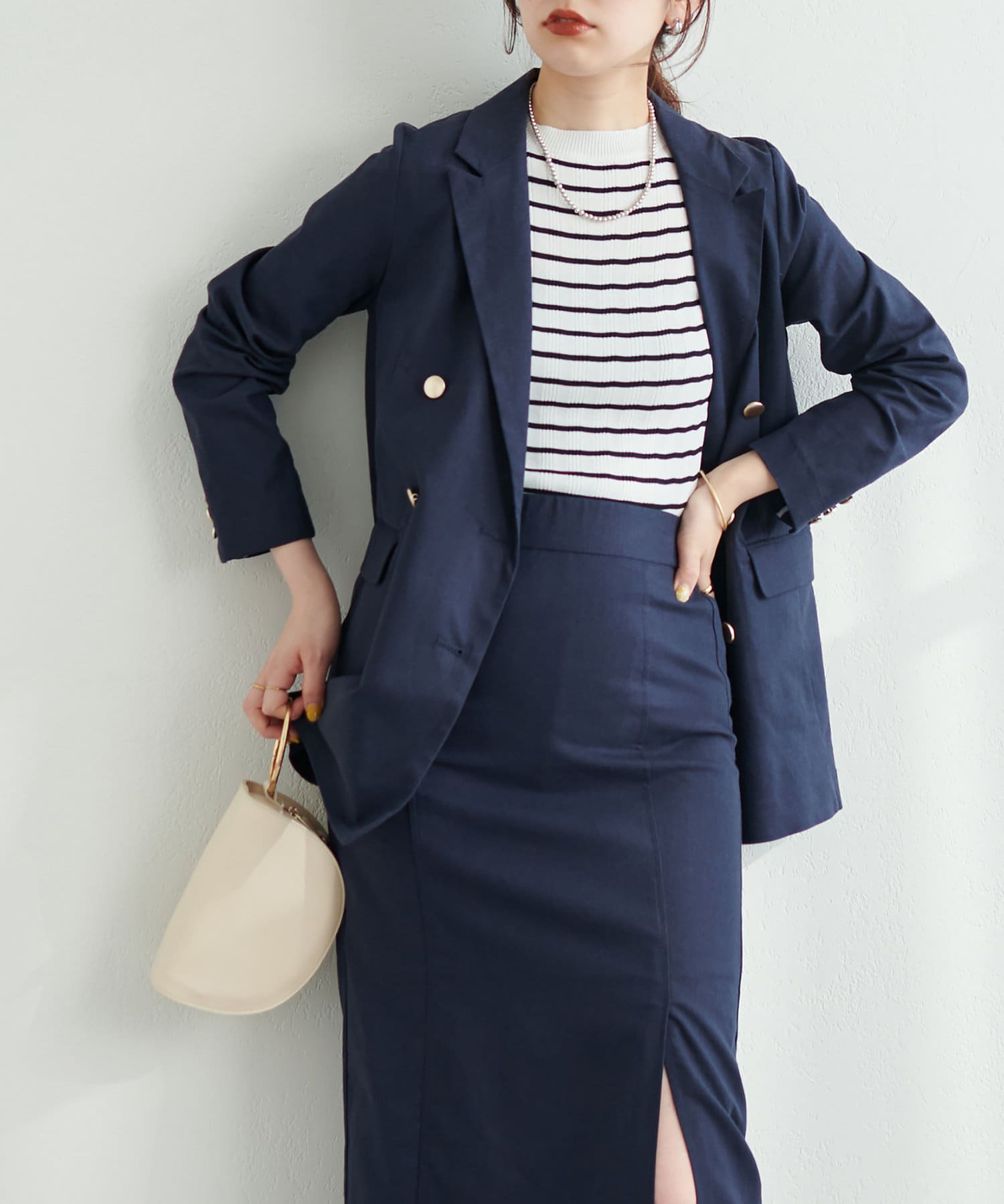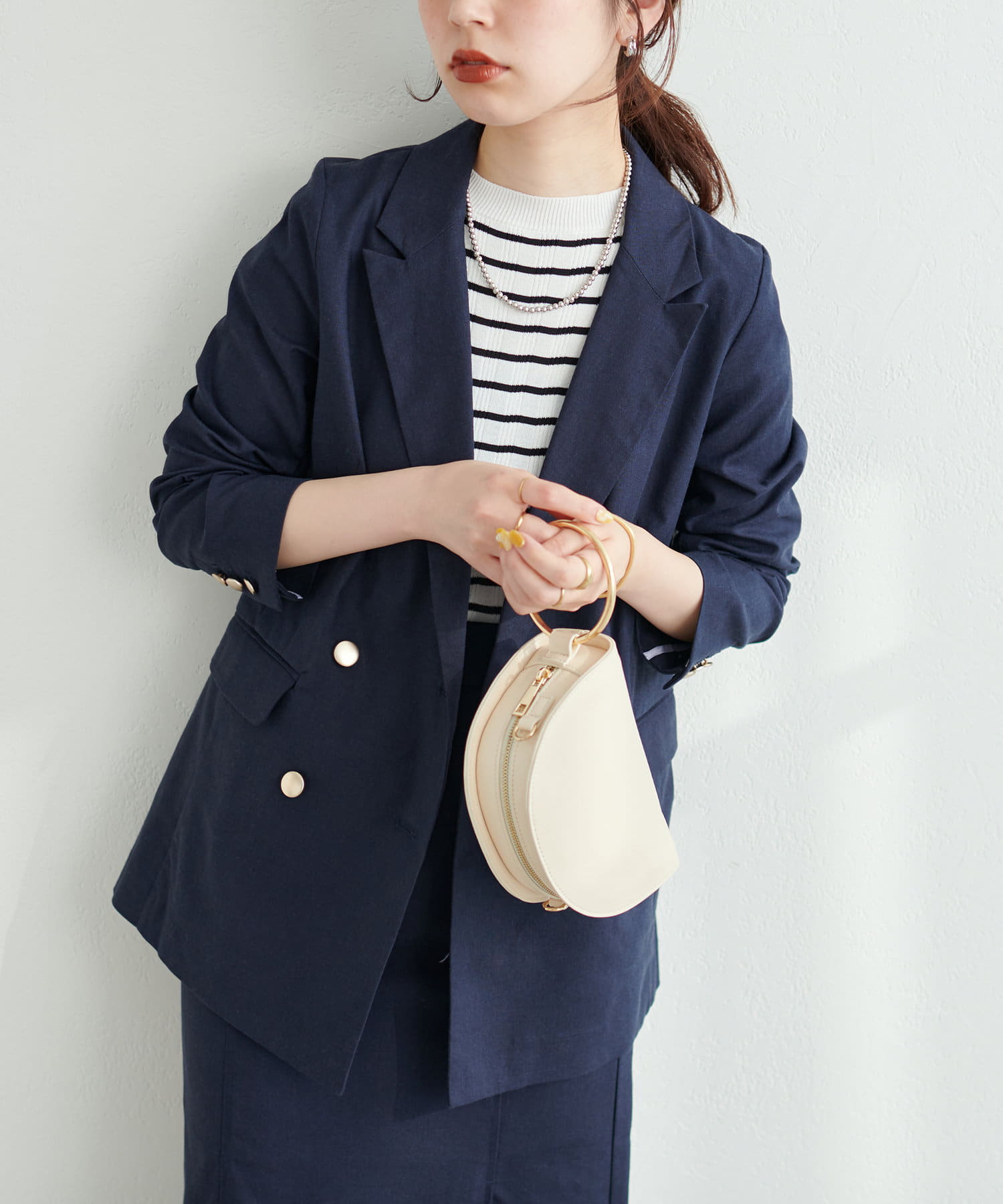 柔らかな質感の金釦を採用し、上品な印象と、幅広いテイストのコーデにマッチするデザインに仕立てました。