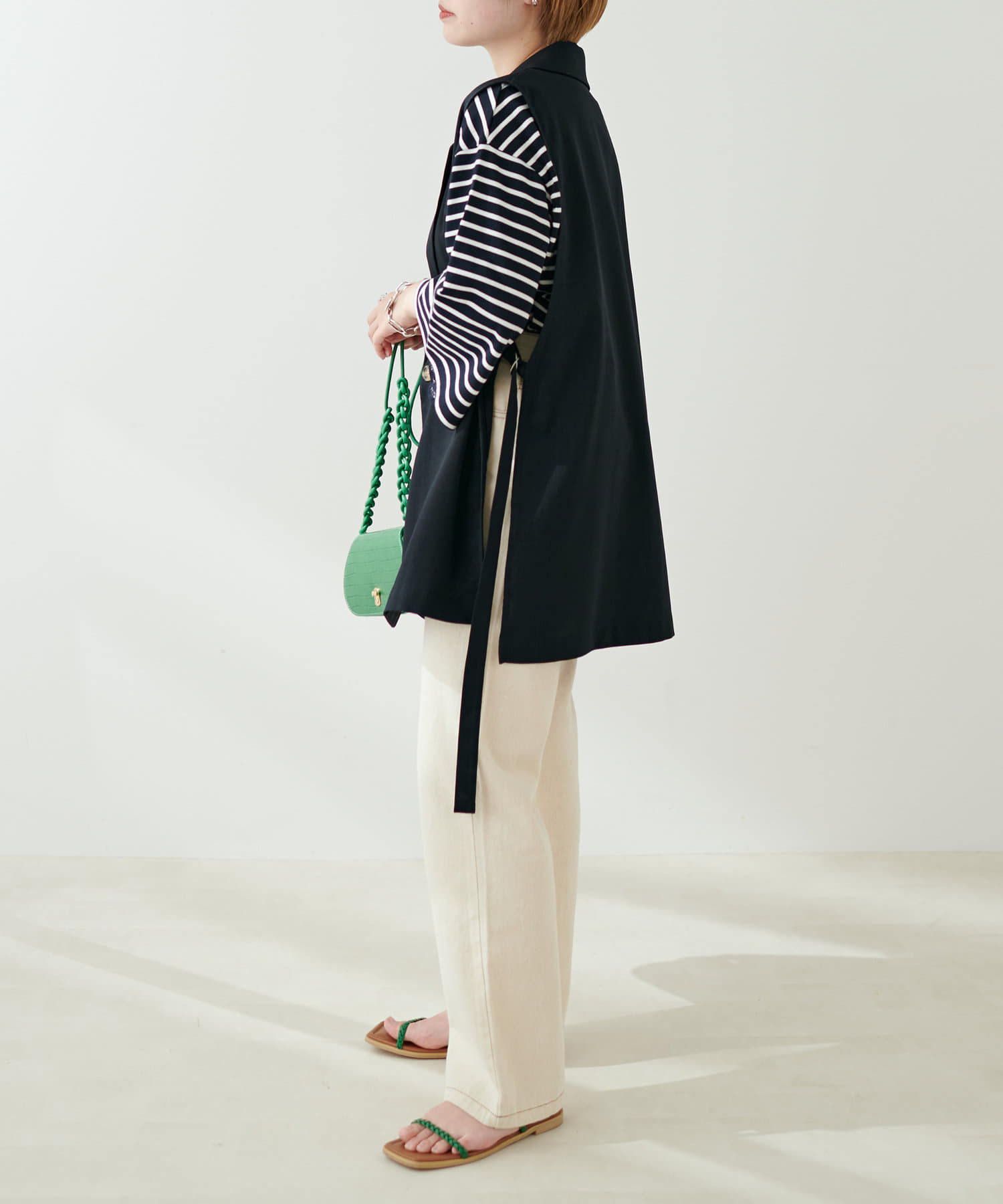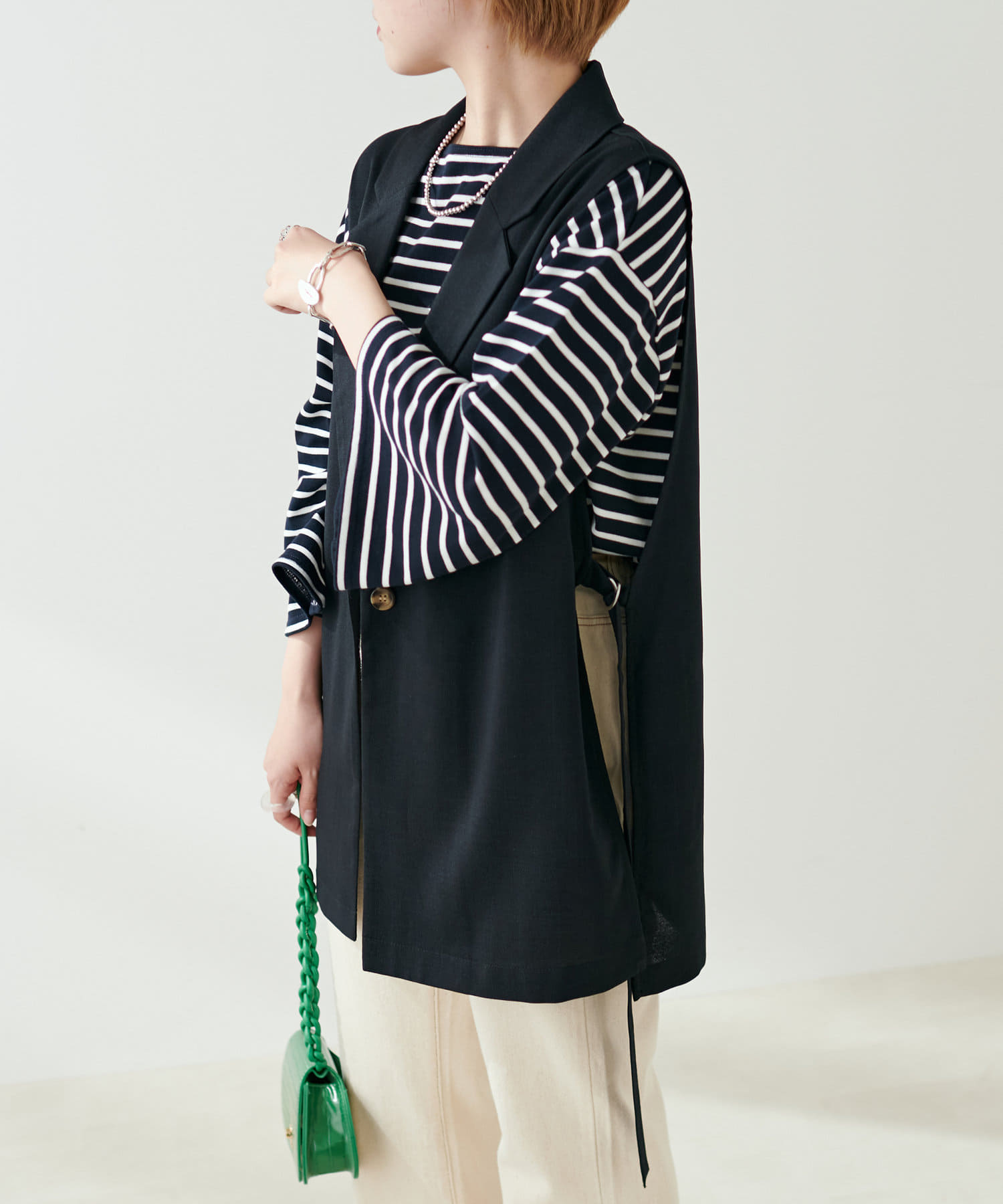 サイドには調整可能なベルトをポイント使いで施し、ワンピースやシャツなど、