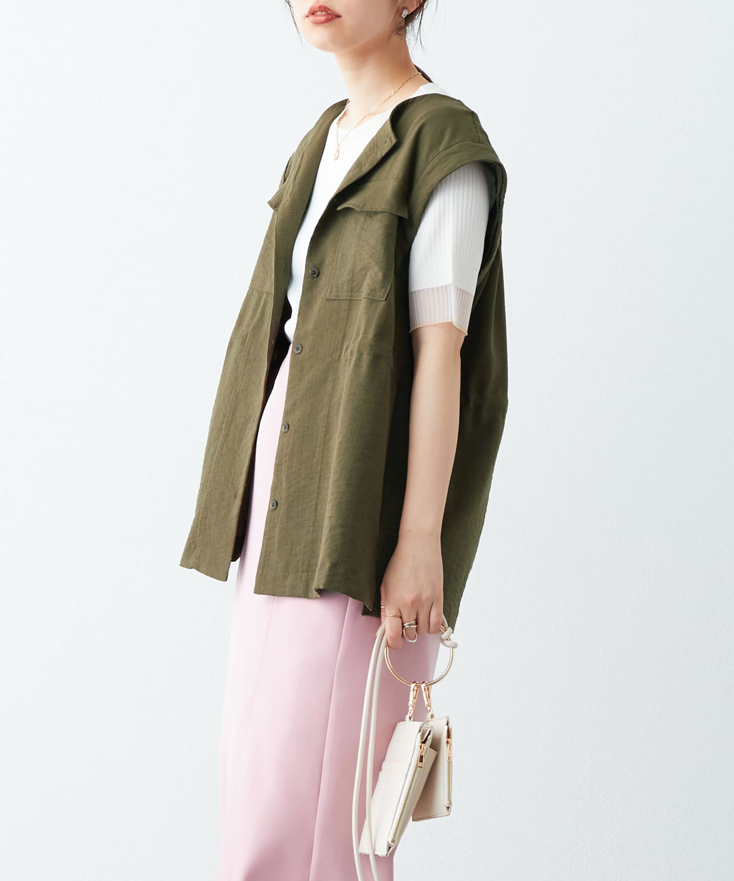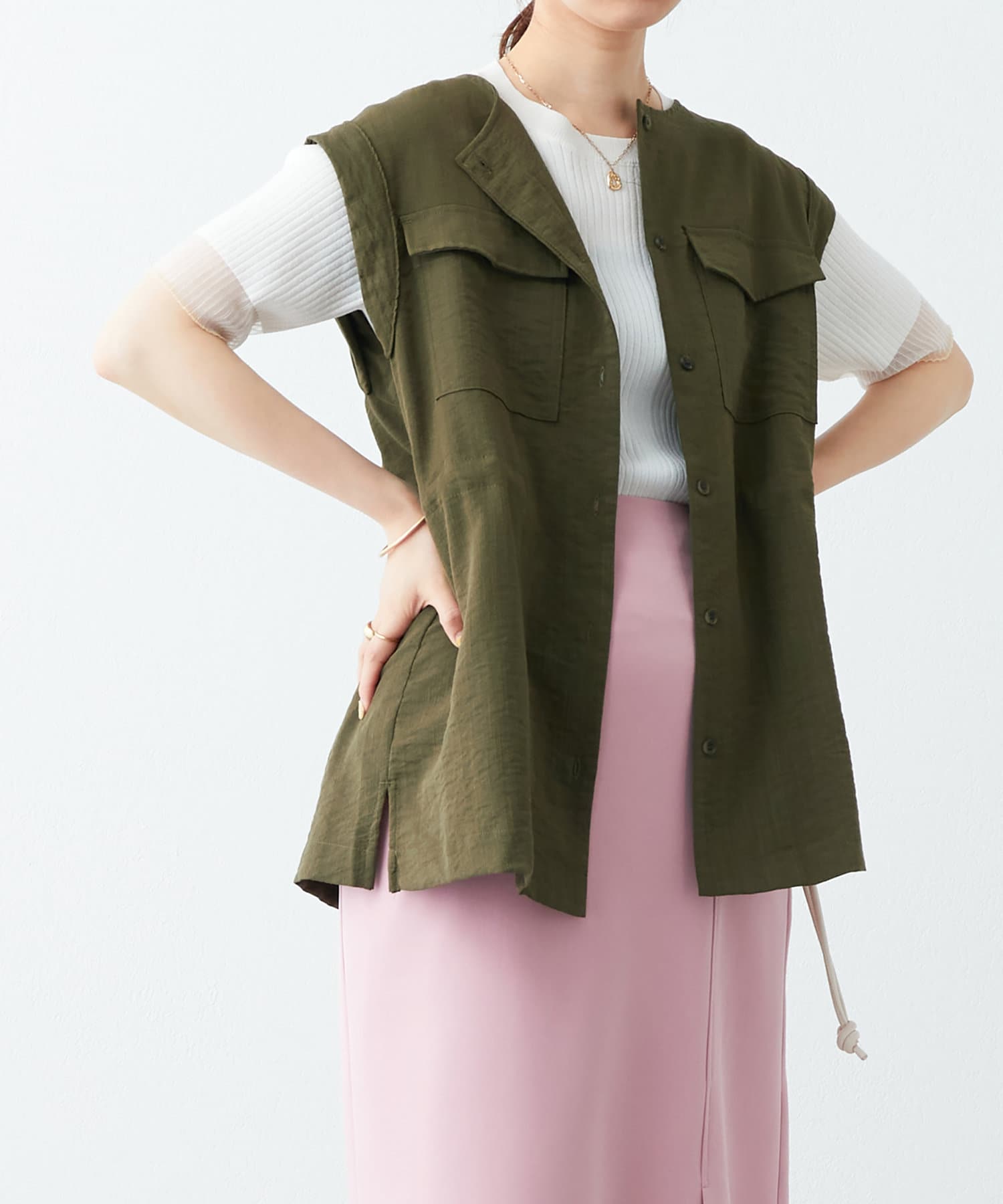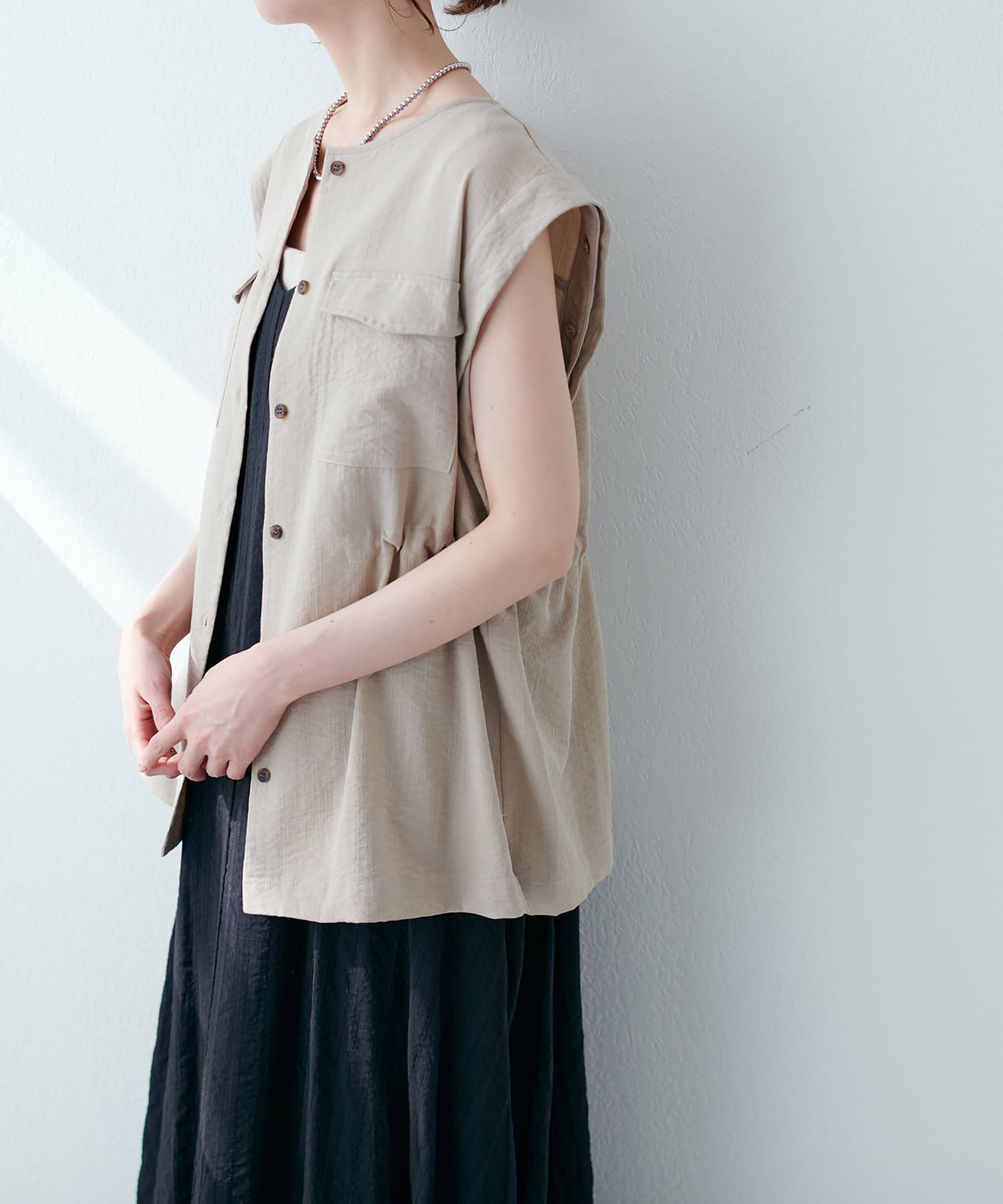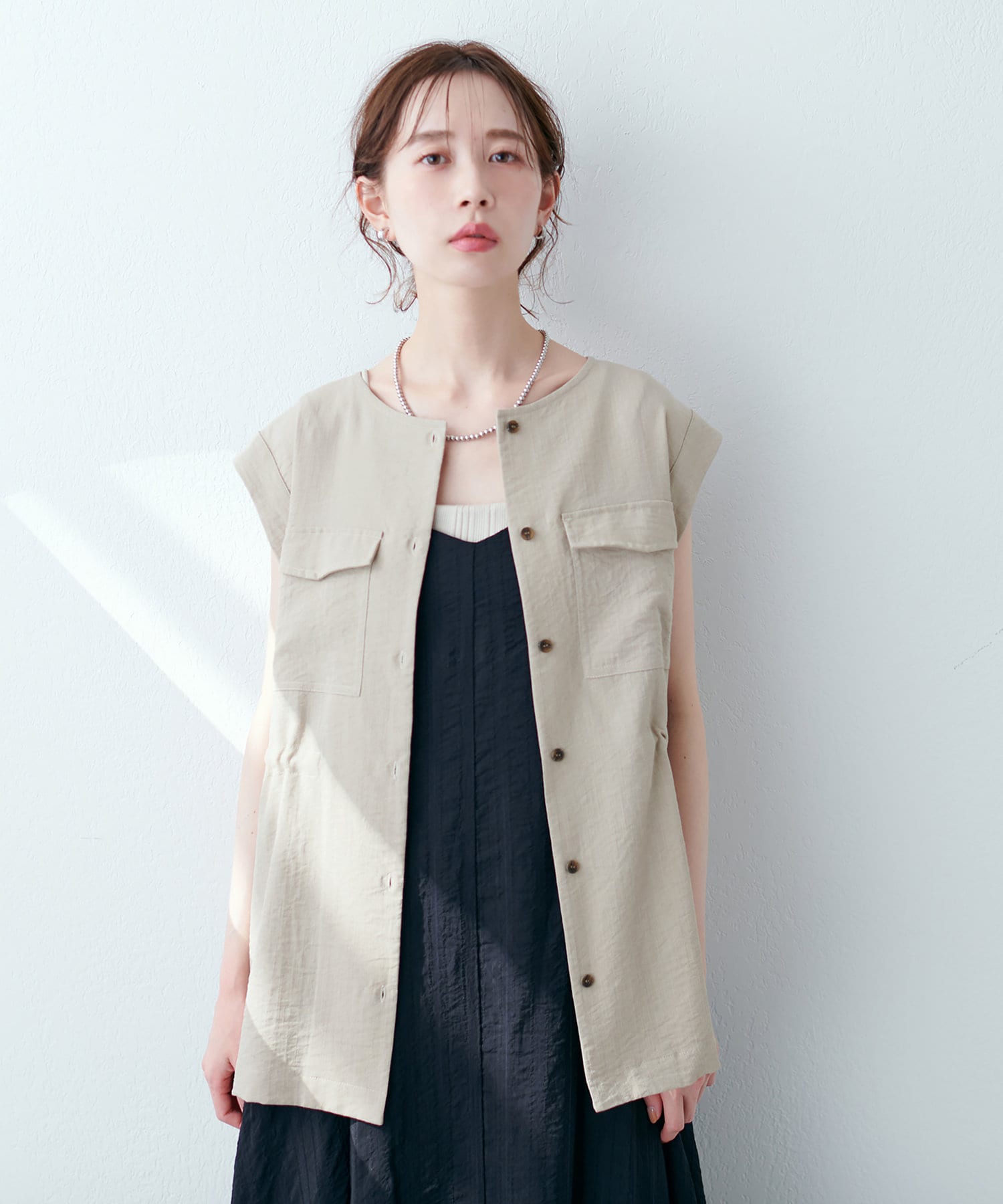 袖を取り外しカジュアルなボーダーシャツや襟付きシャツに羽織ってベストのようにするも良し、