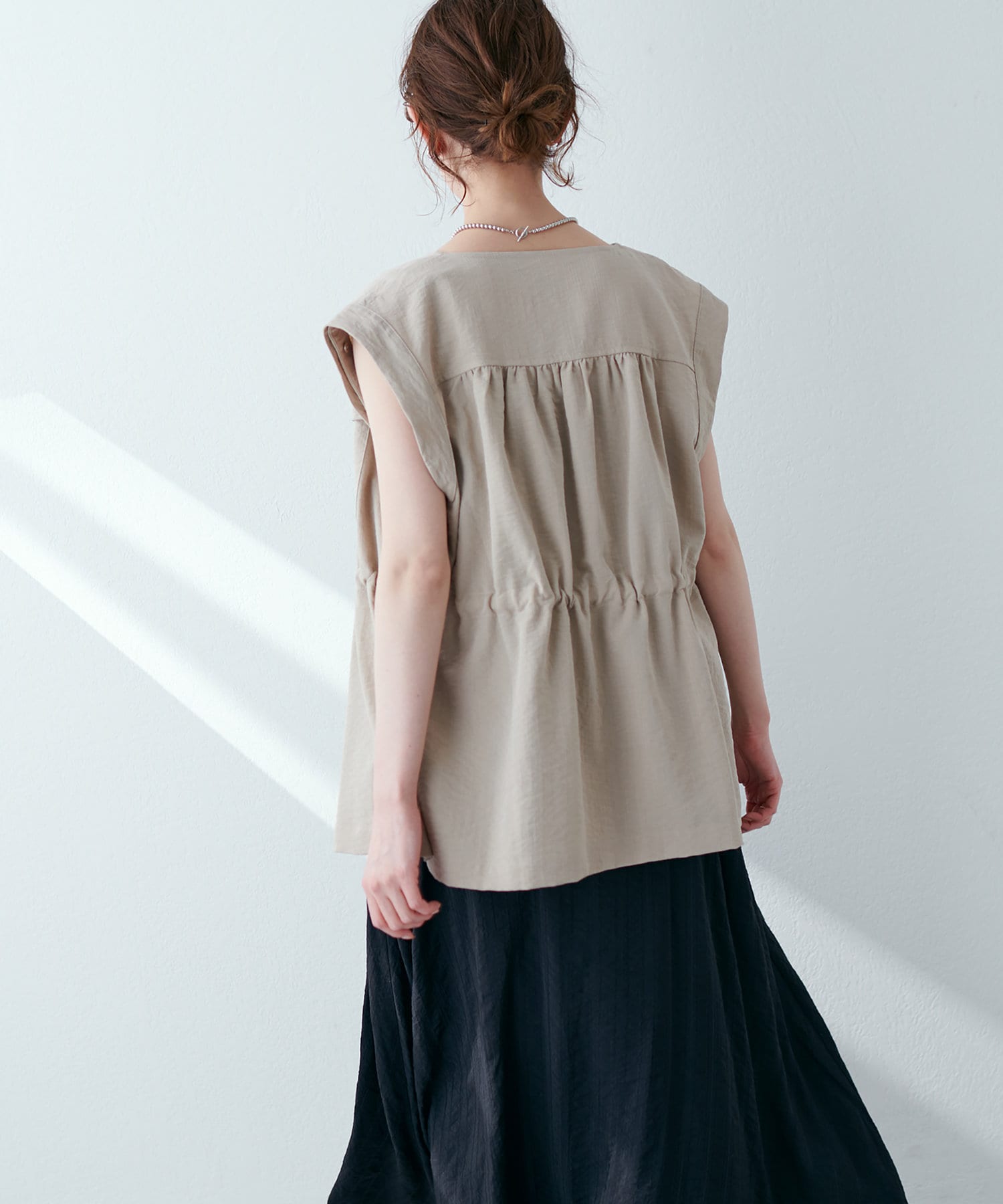 お届け状態は平らですが、ウエストの絞りを調整してクシュっと感を作り立体感あるラインもお楽しみ頂けます。