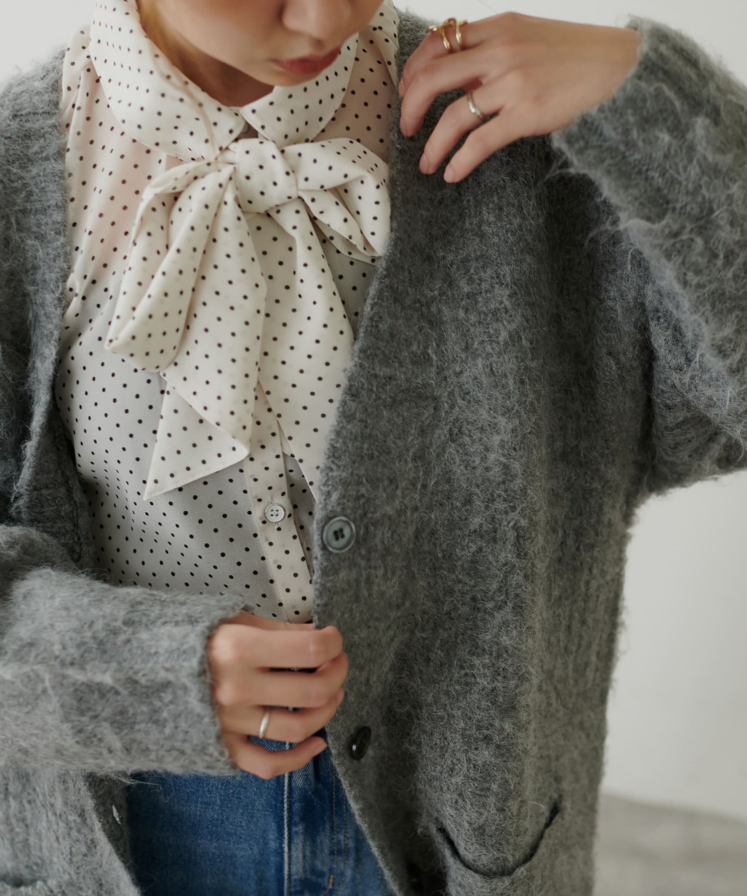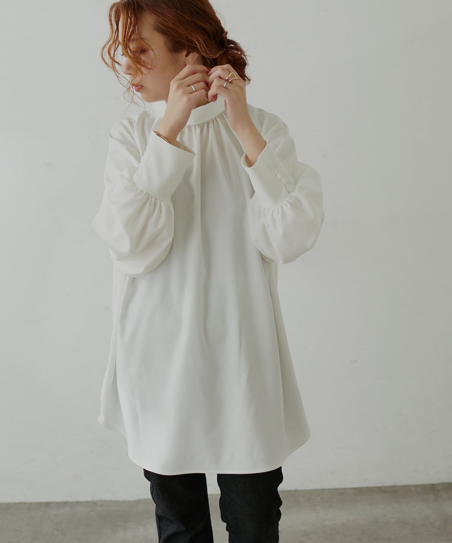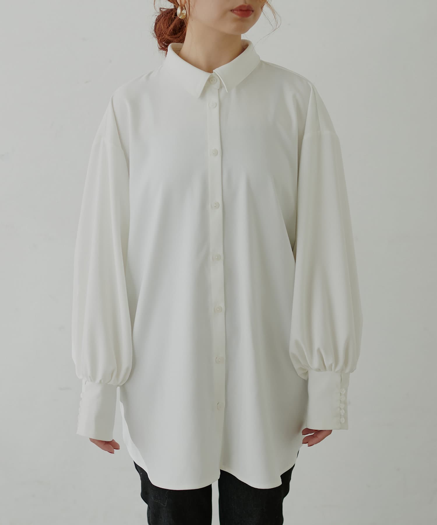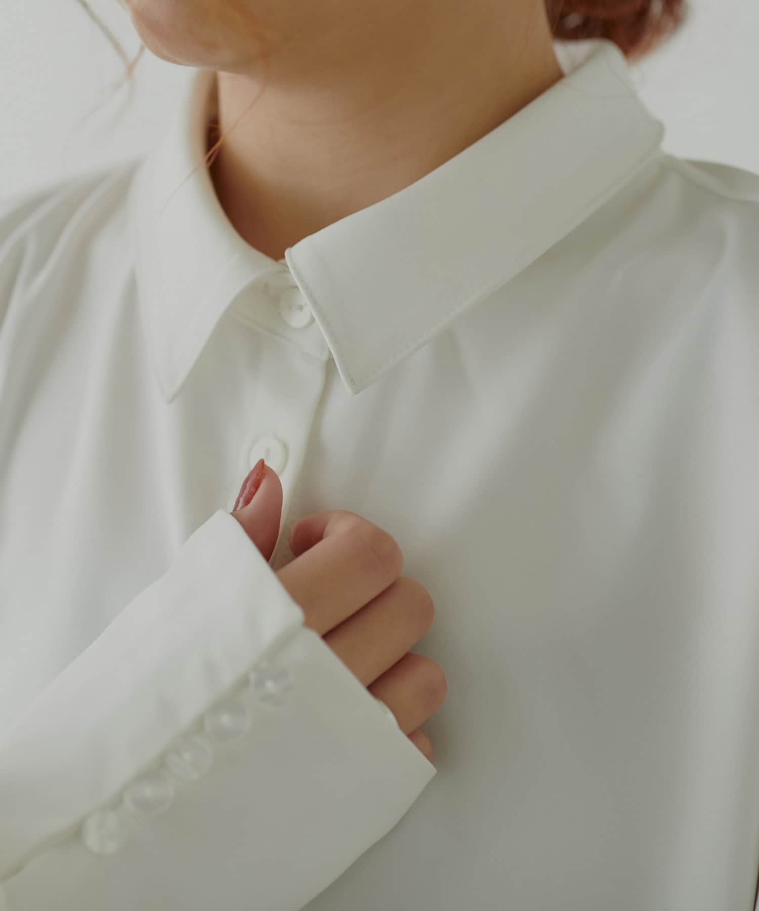 袖口の長めカフスに多ボタンがクラシカルで女性らしい印象に。