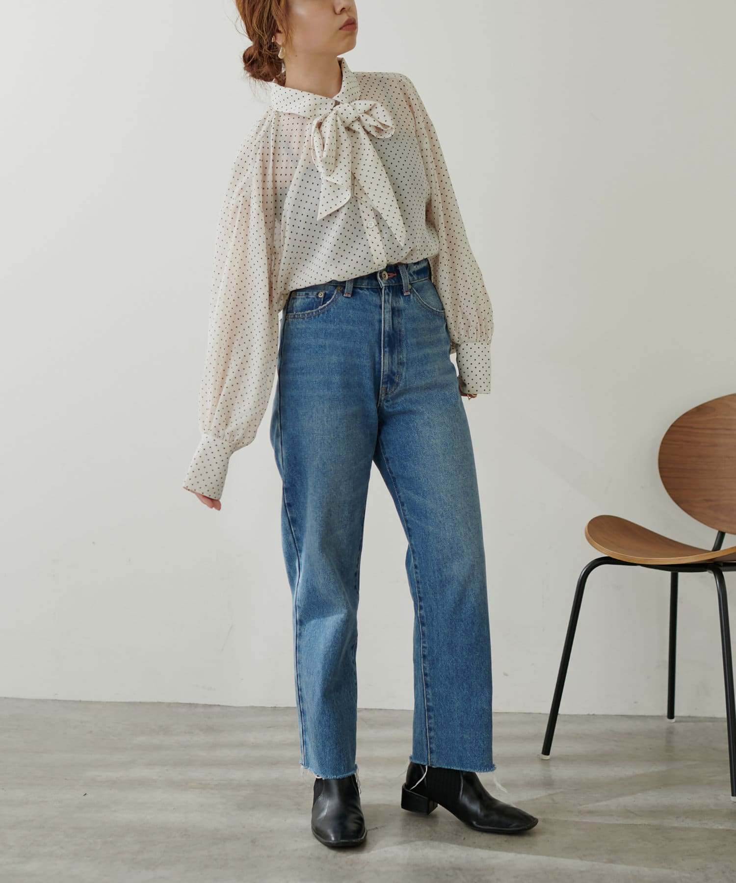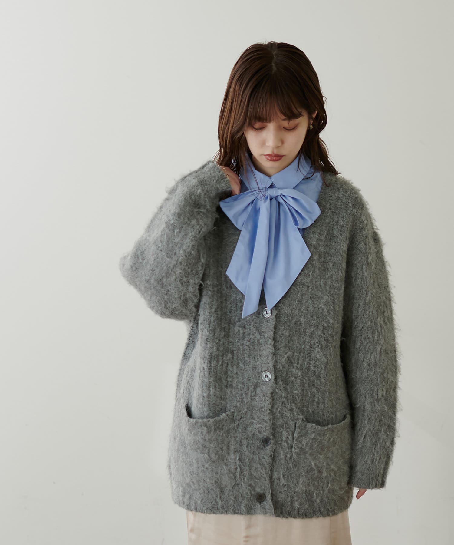 何通りも着用できるリボンブラウス。