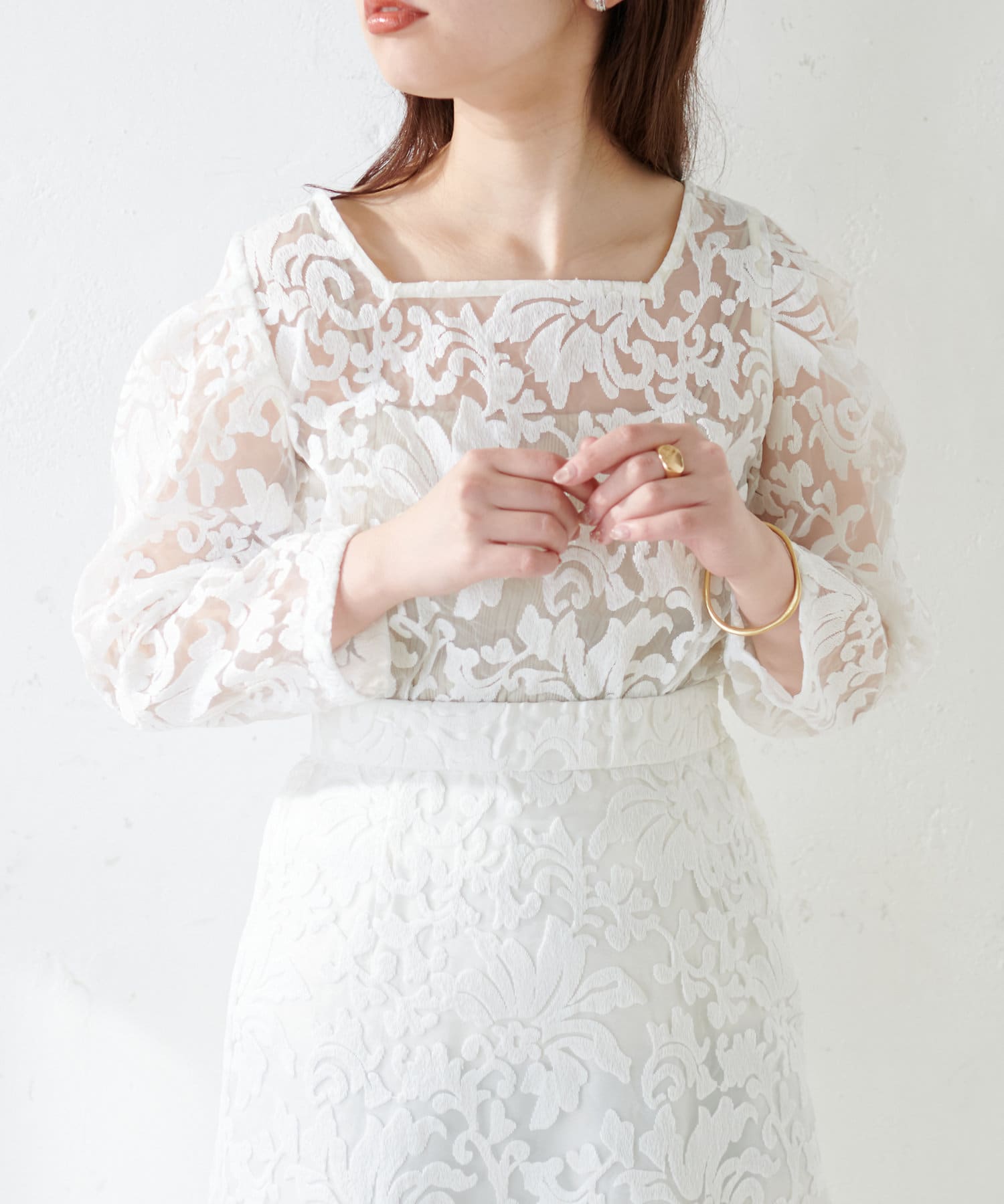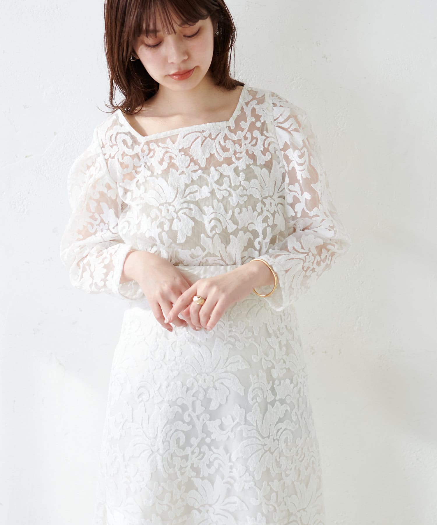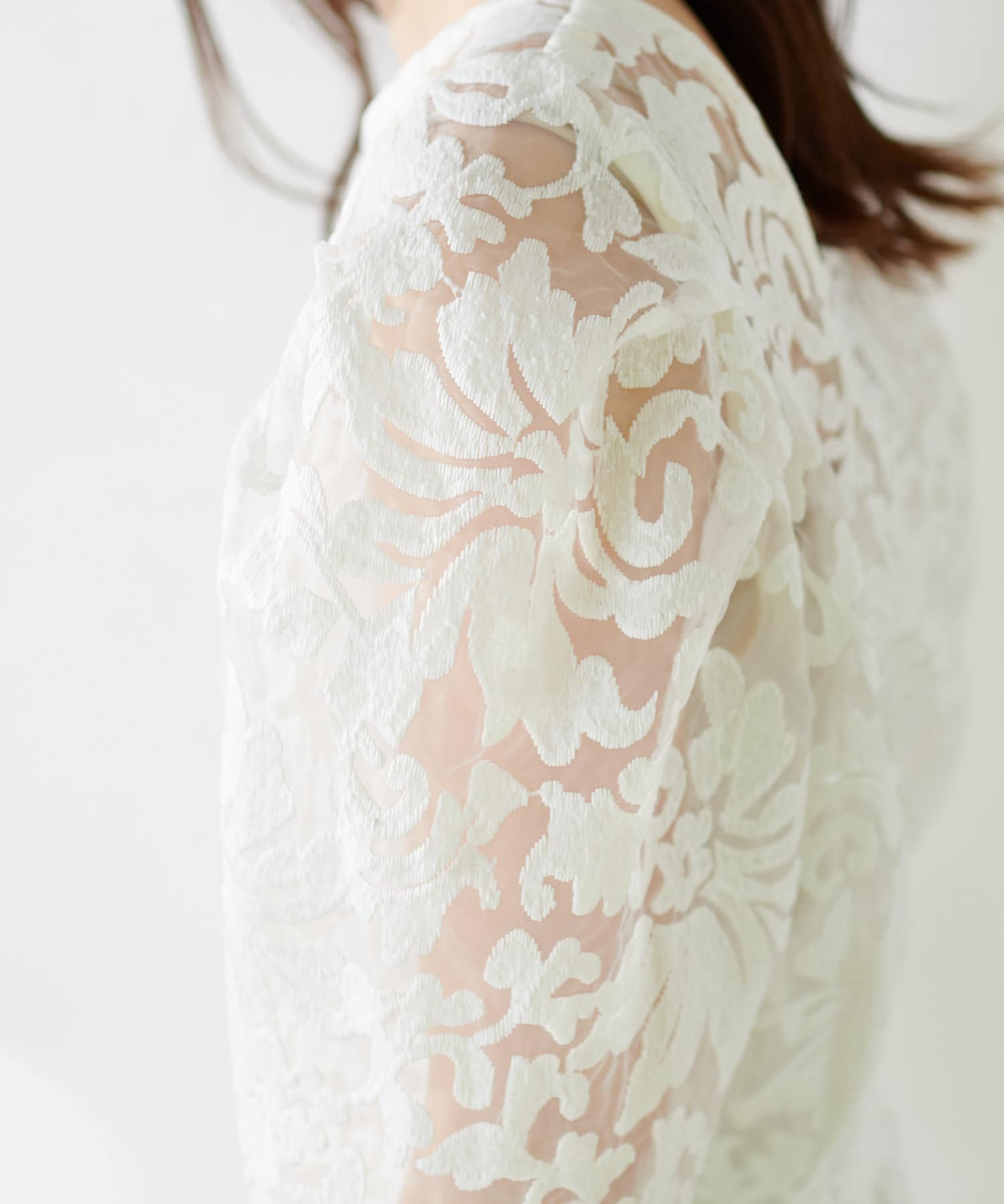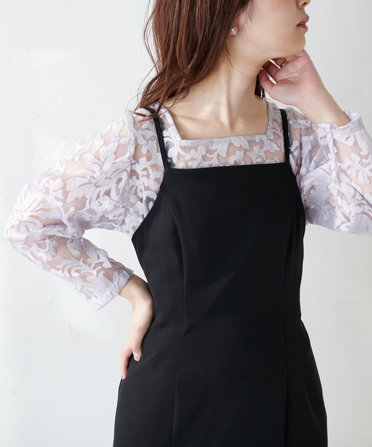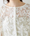 ほんのりシアー感のある生地に、上品にデザインされた刺繍使いが目を惹く1着。