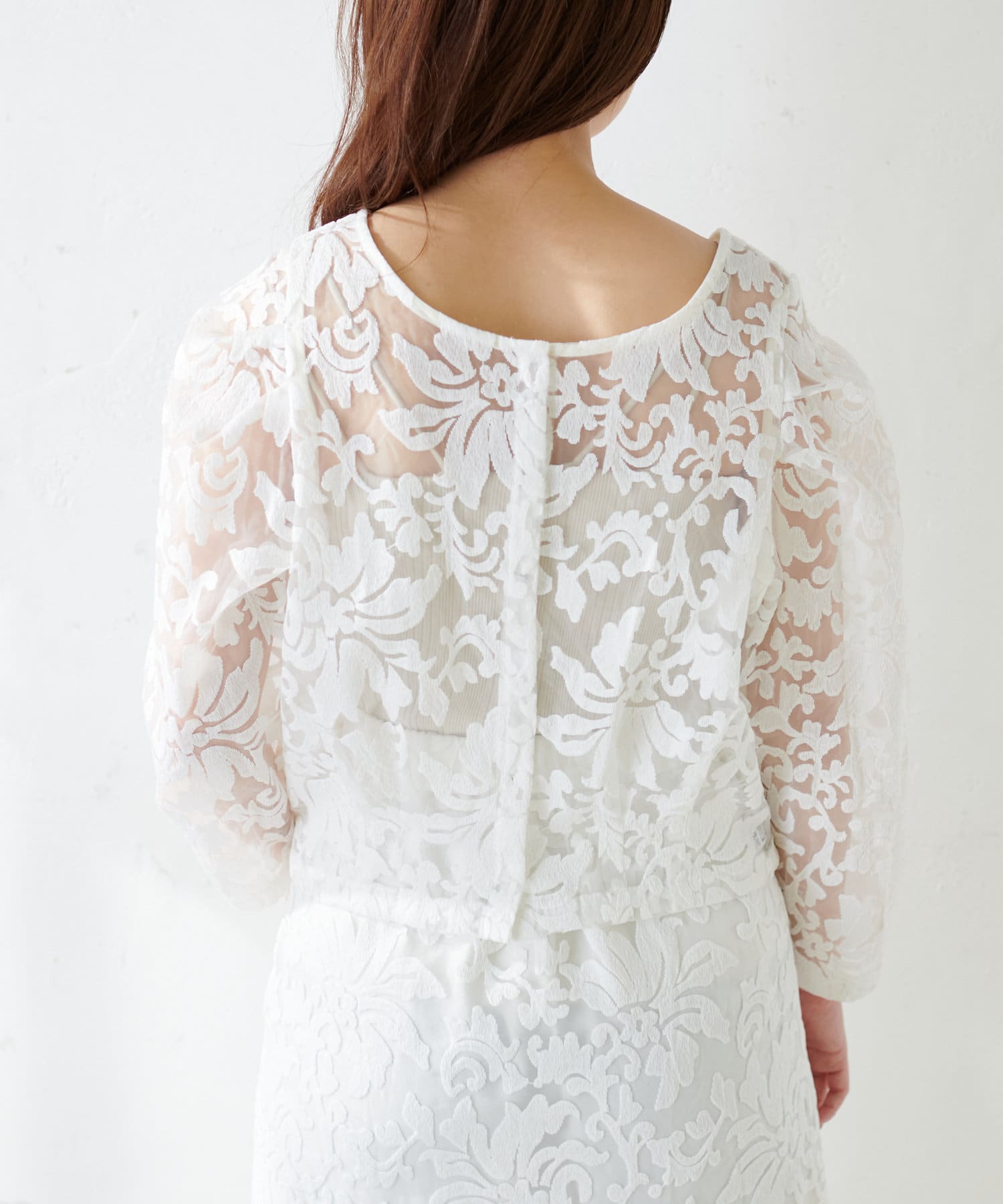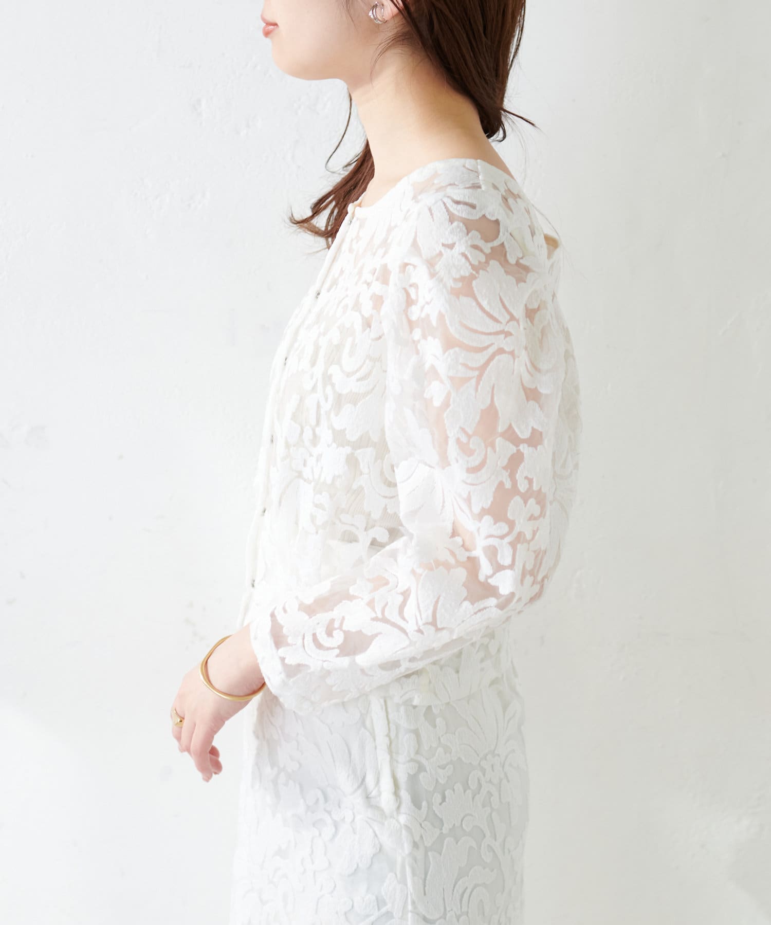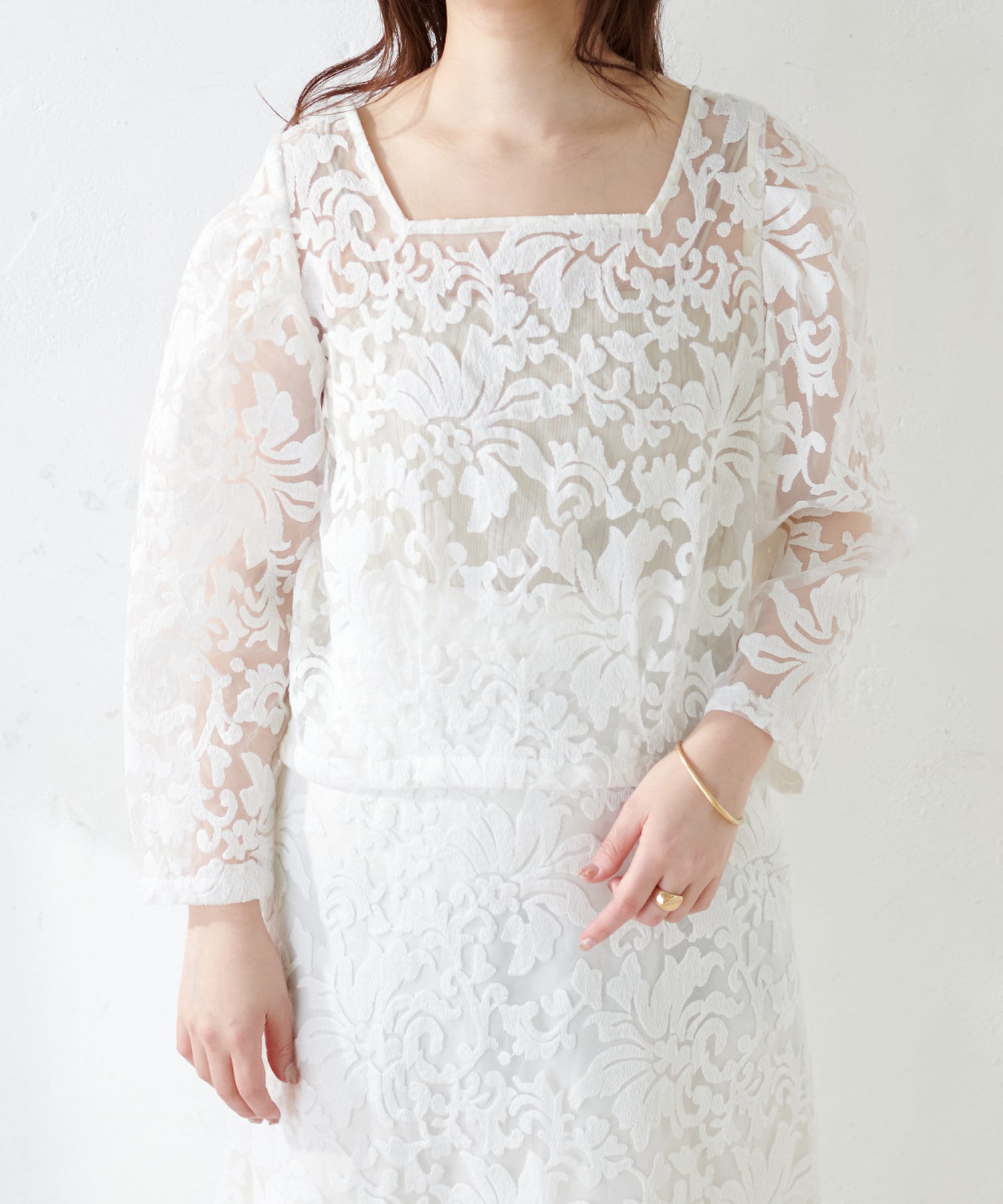 ほんのりシアー感のある生地に、上品にデザインされた刺繍使いが目を惹く1着。