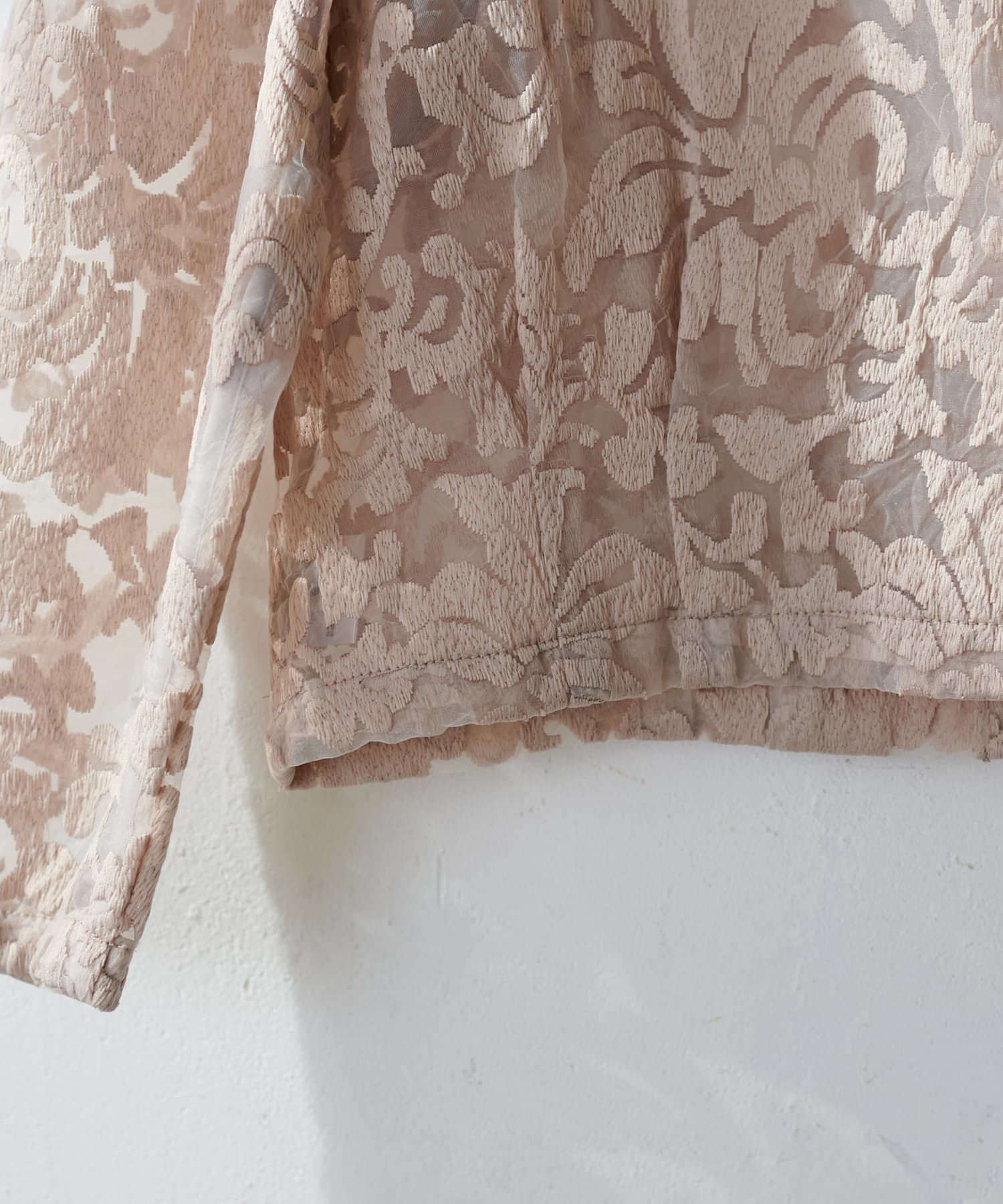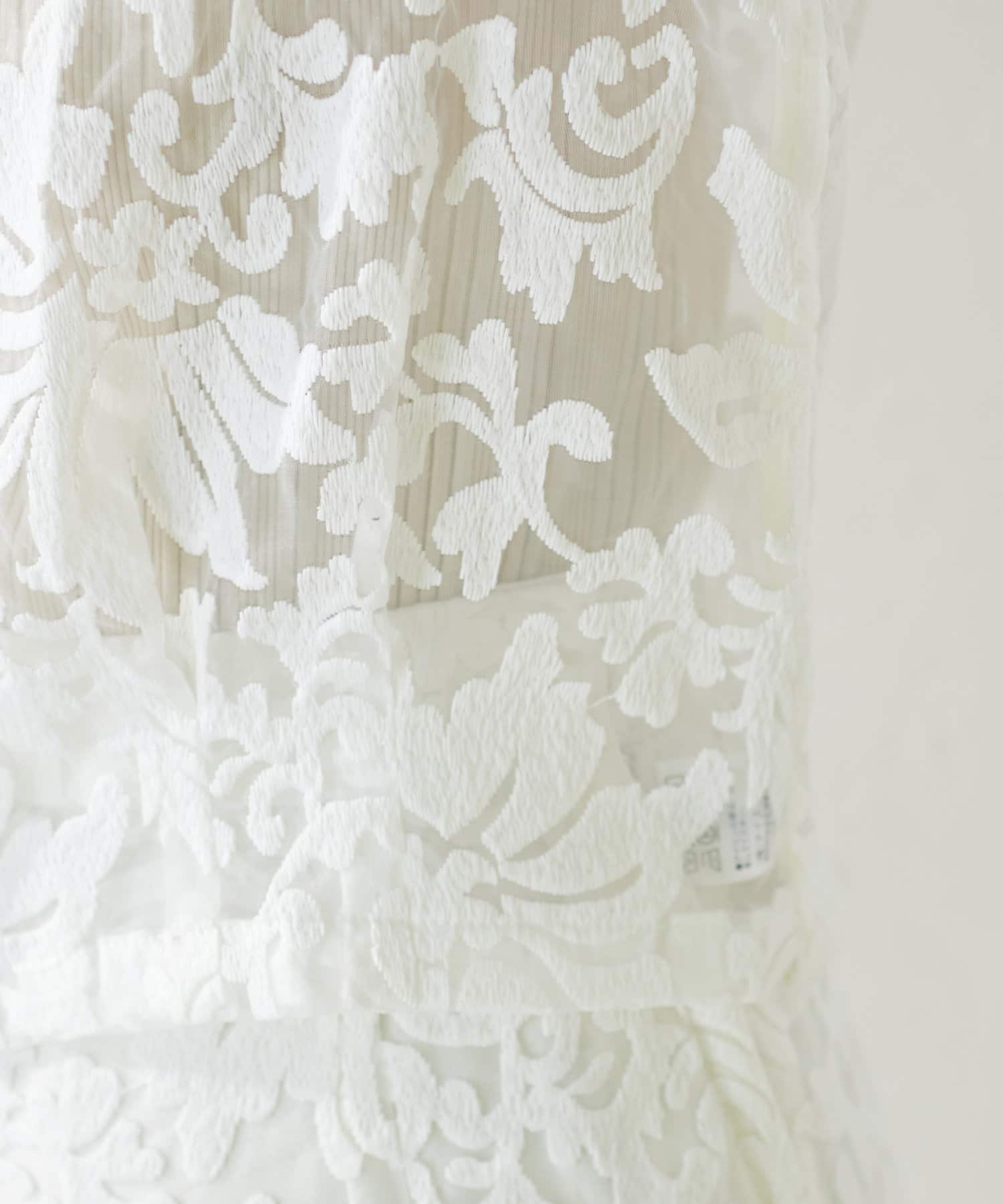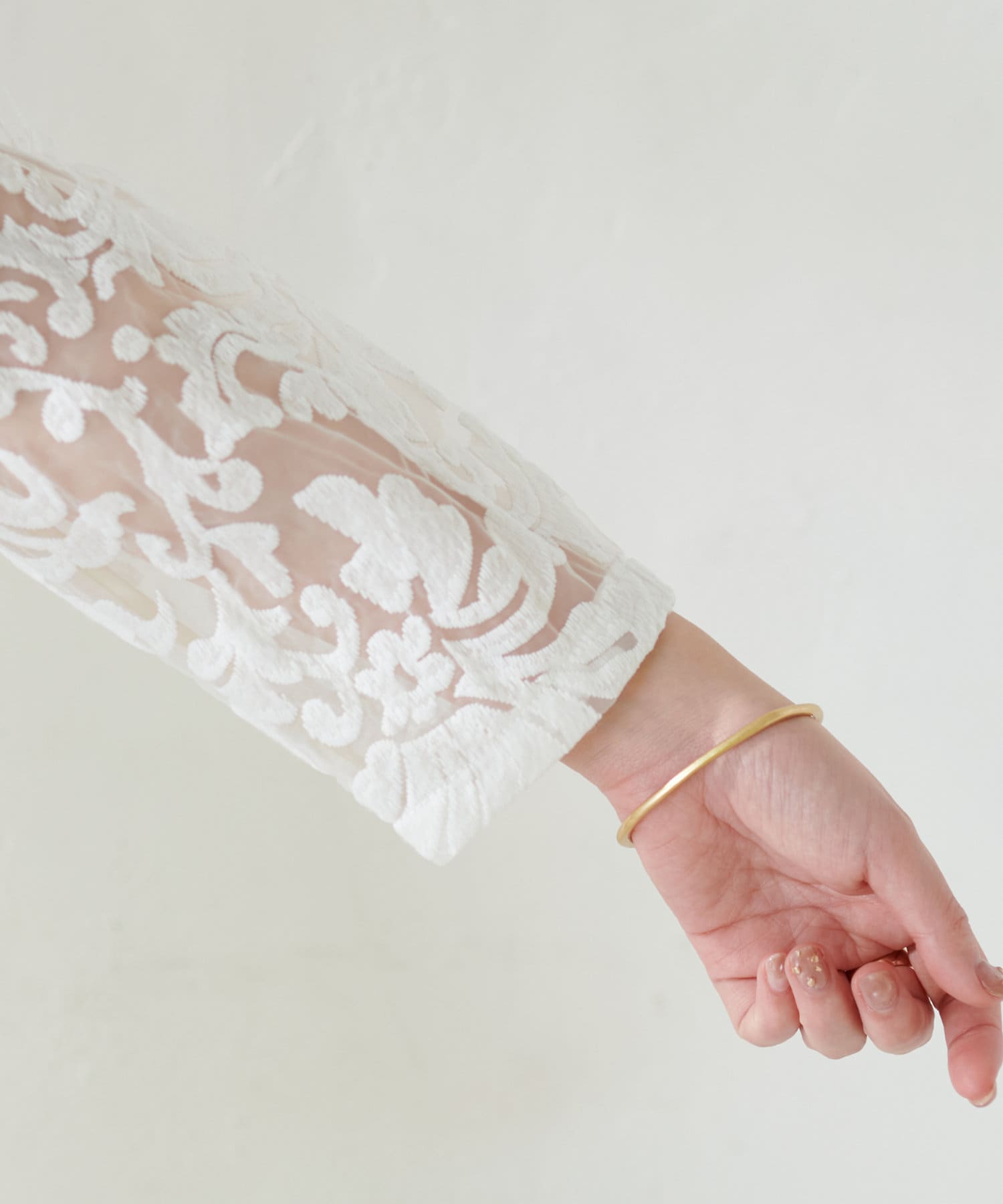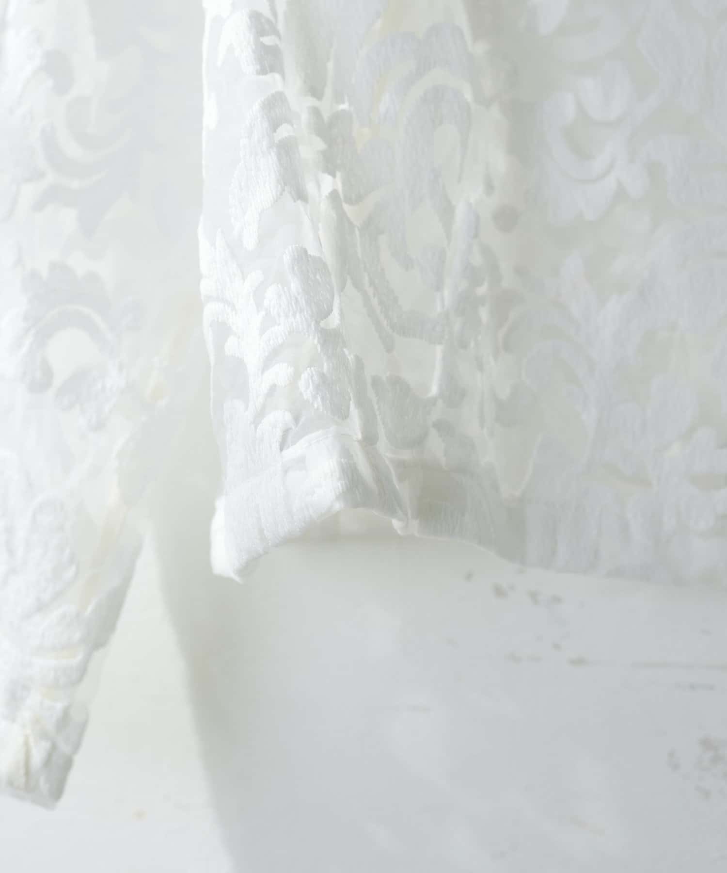 ほんのりシアー感のある生地に、上品にデザインされた刺繍使いが目を惹く1着。