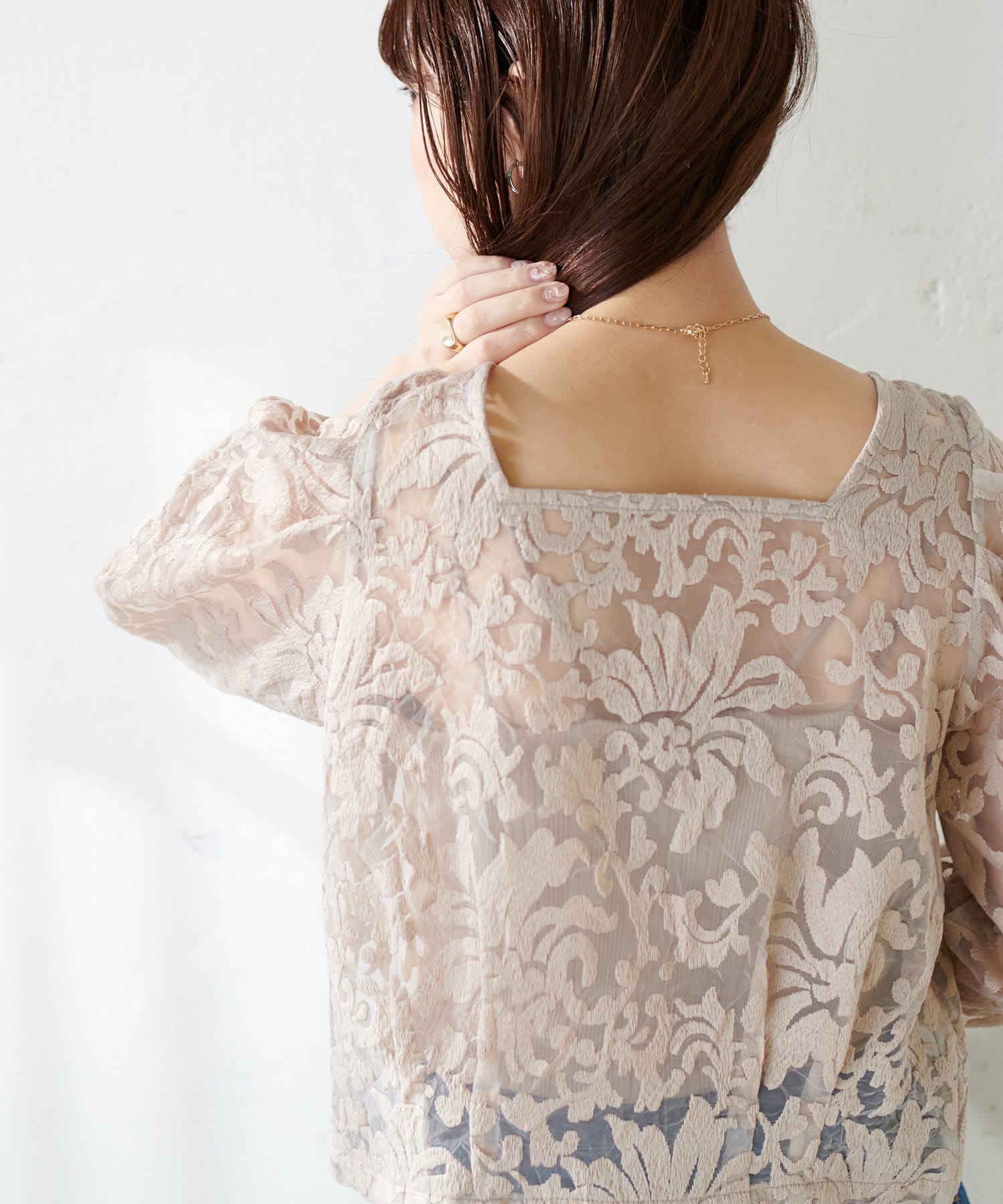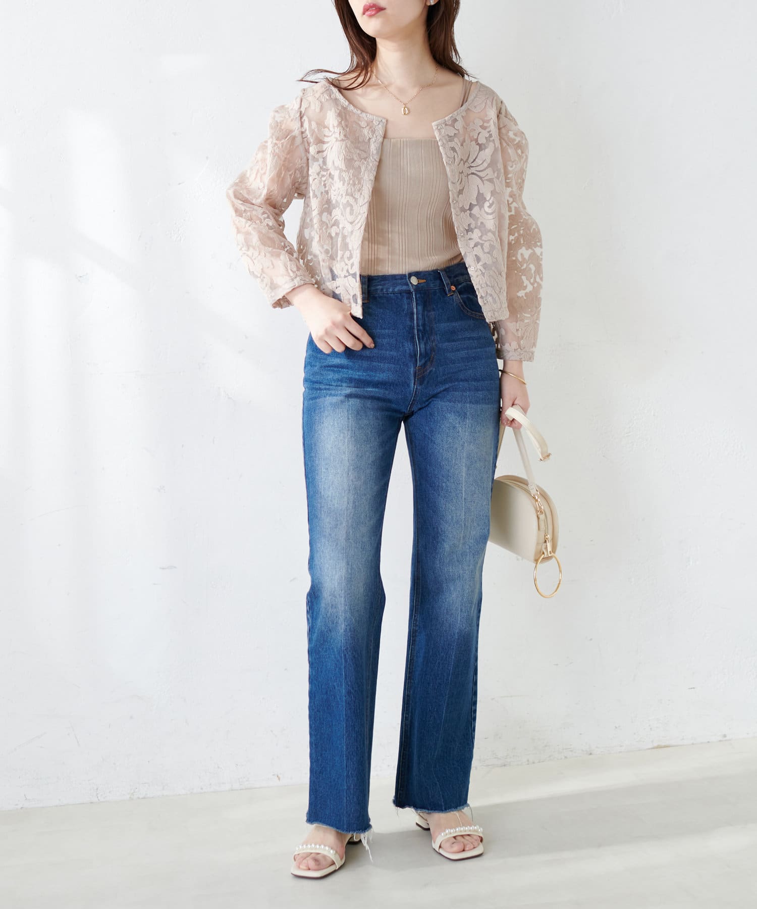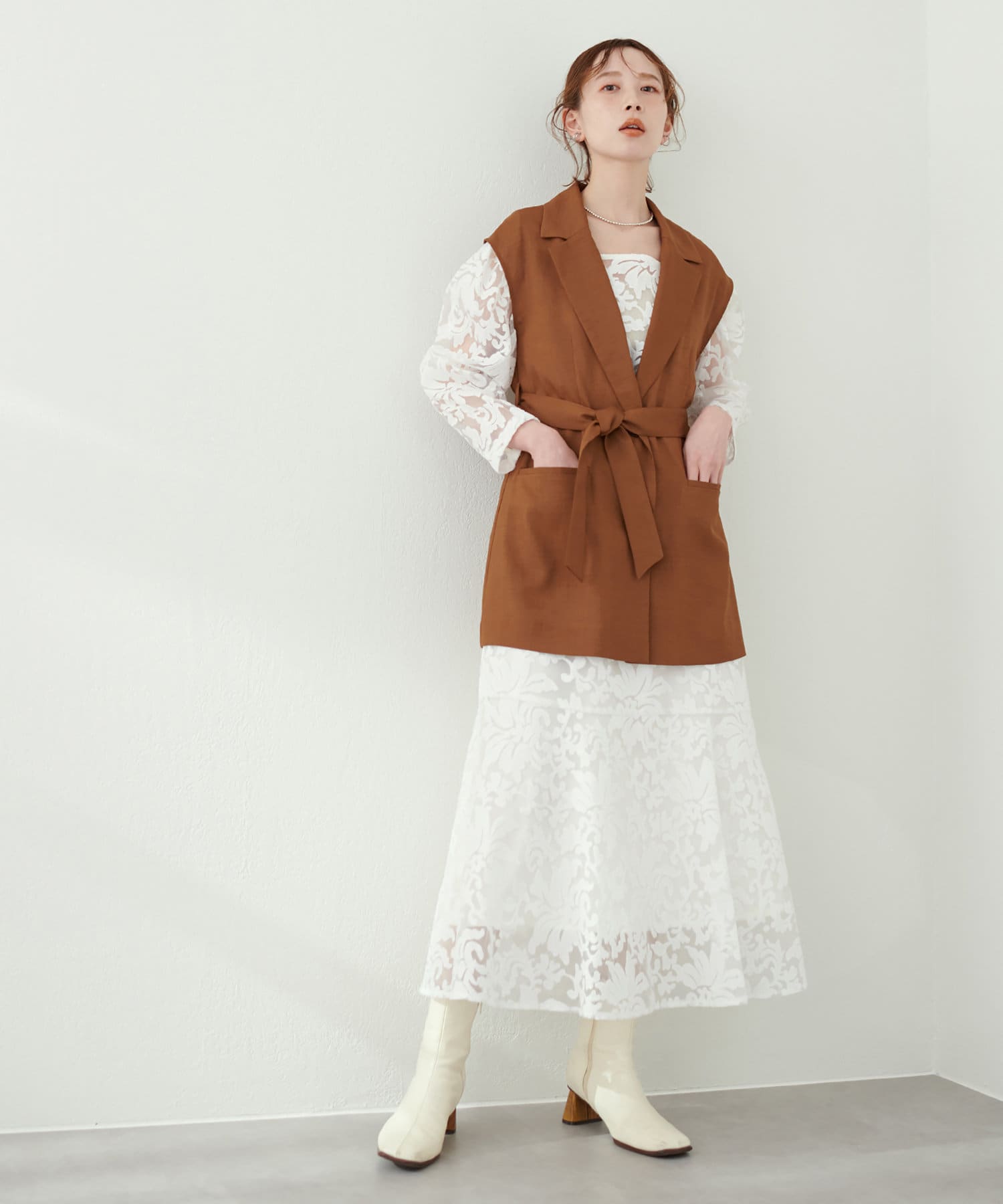 暖かい時期はお手持ちのキャミソールやタンクトップをインナーに合わせて軽やかな印象を楽しんで頂いても◎