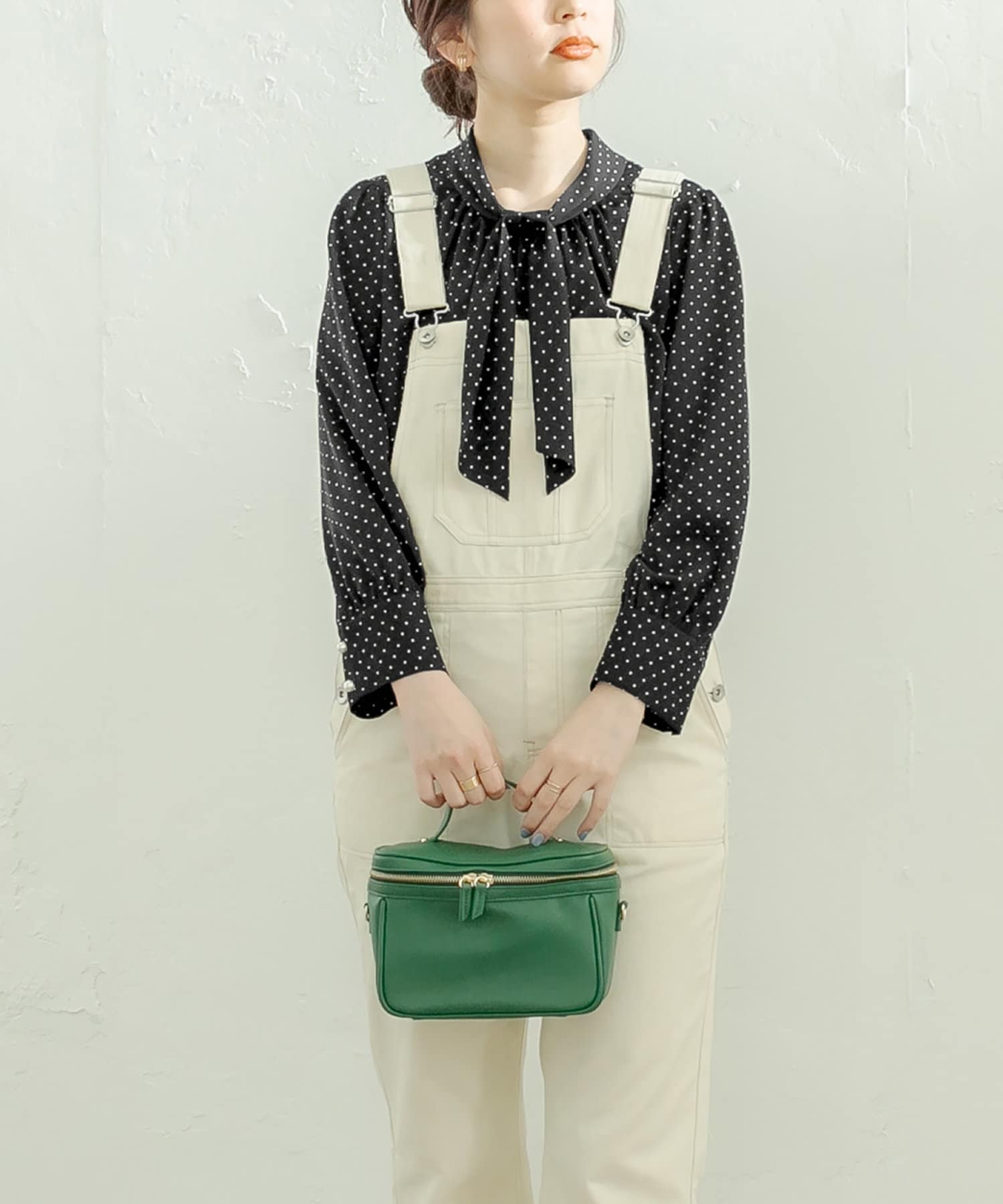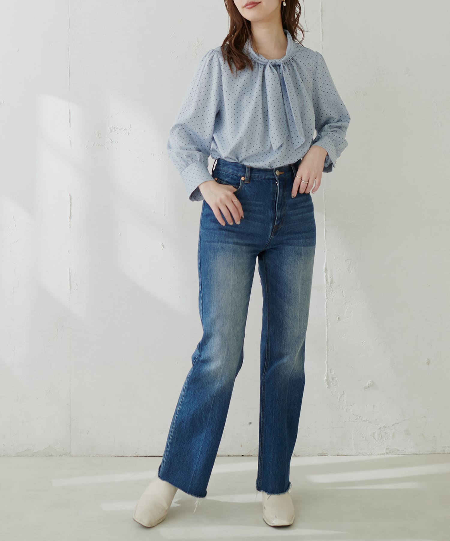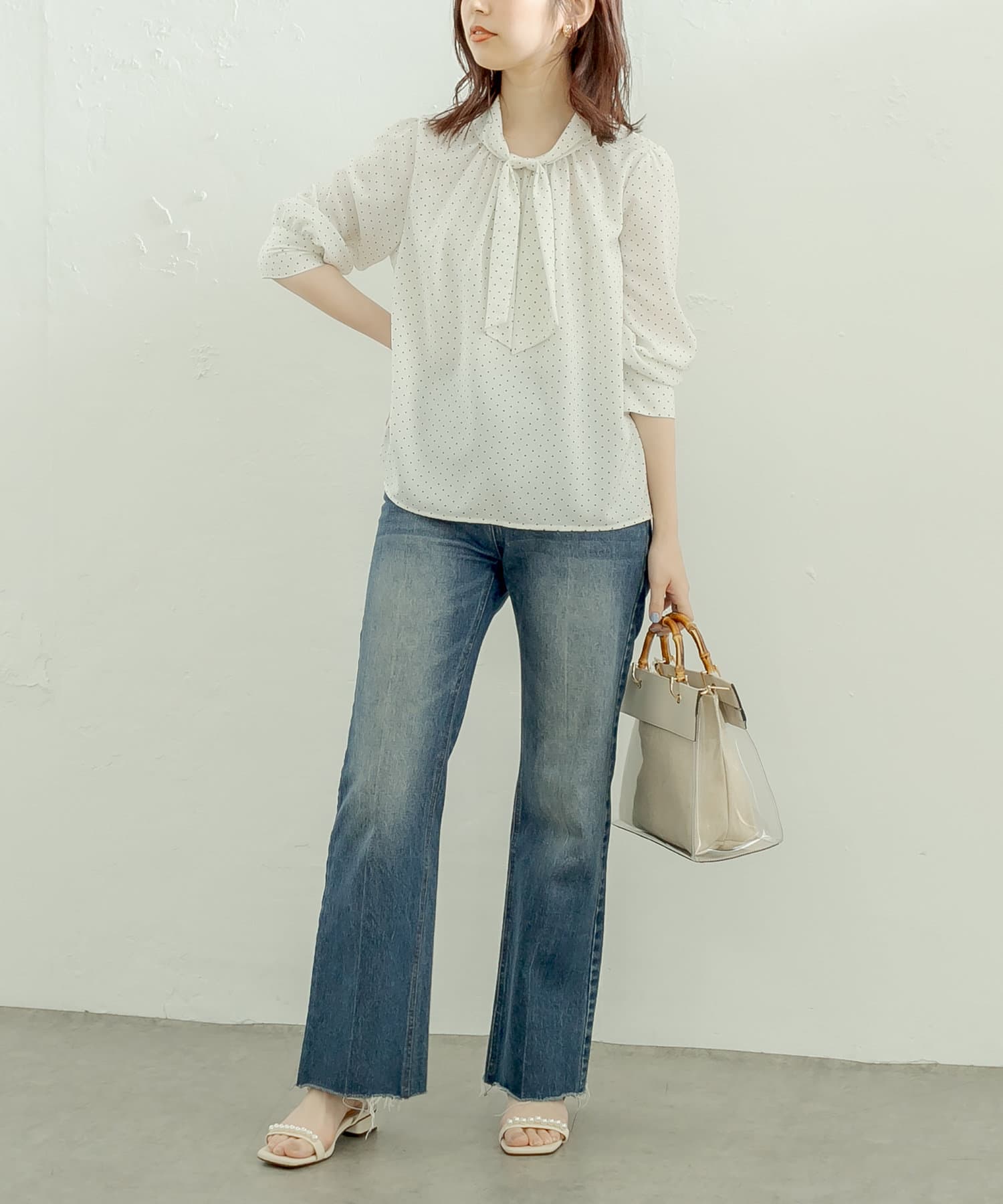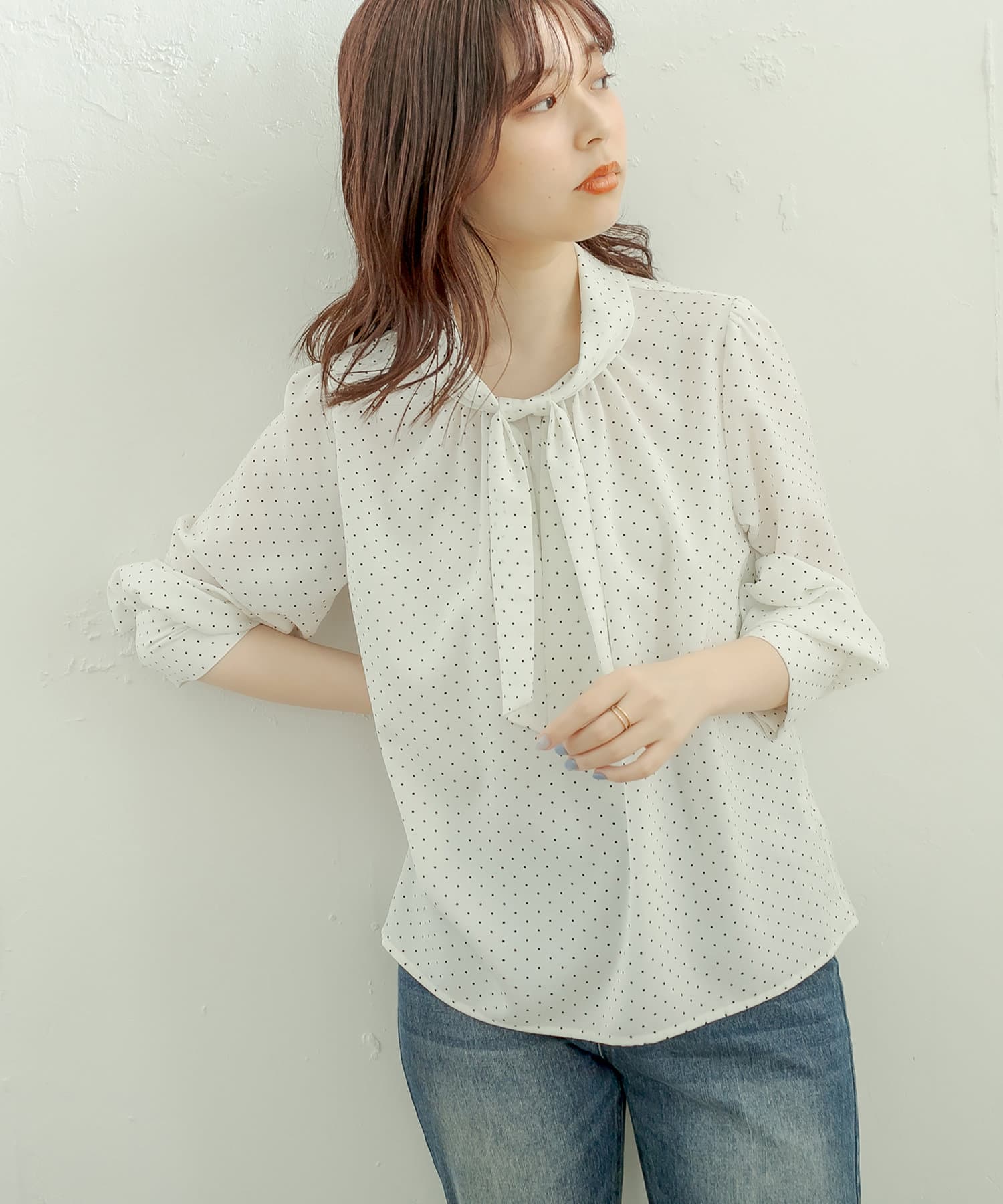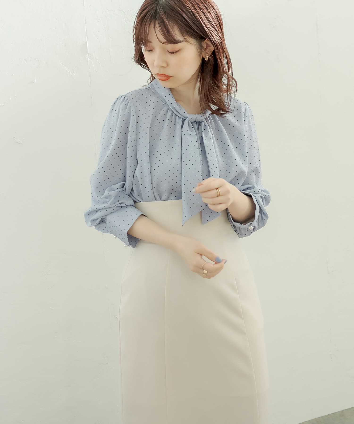 袖口パールノット結びボータイブラウス