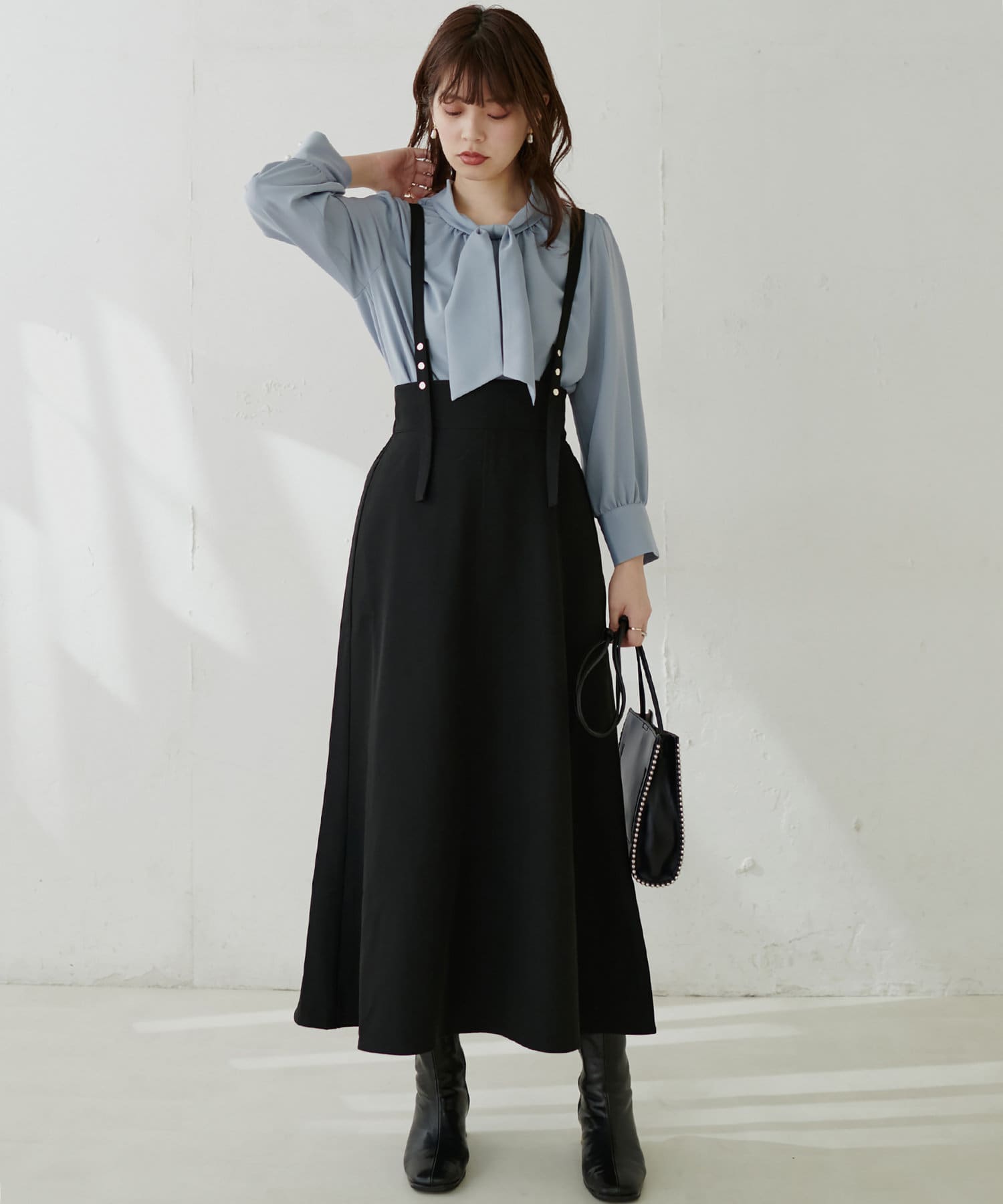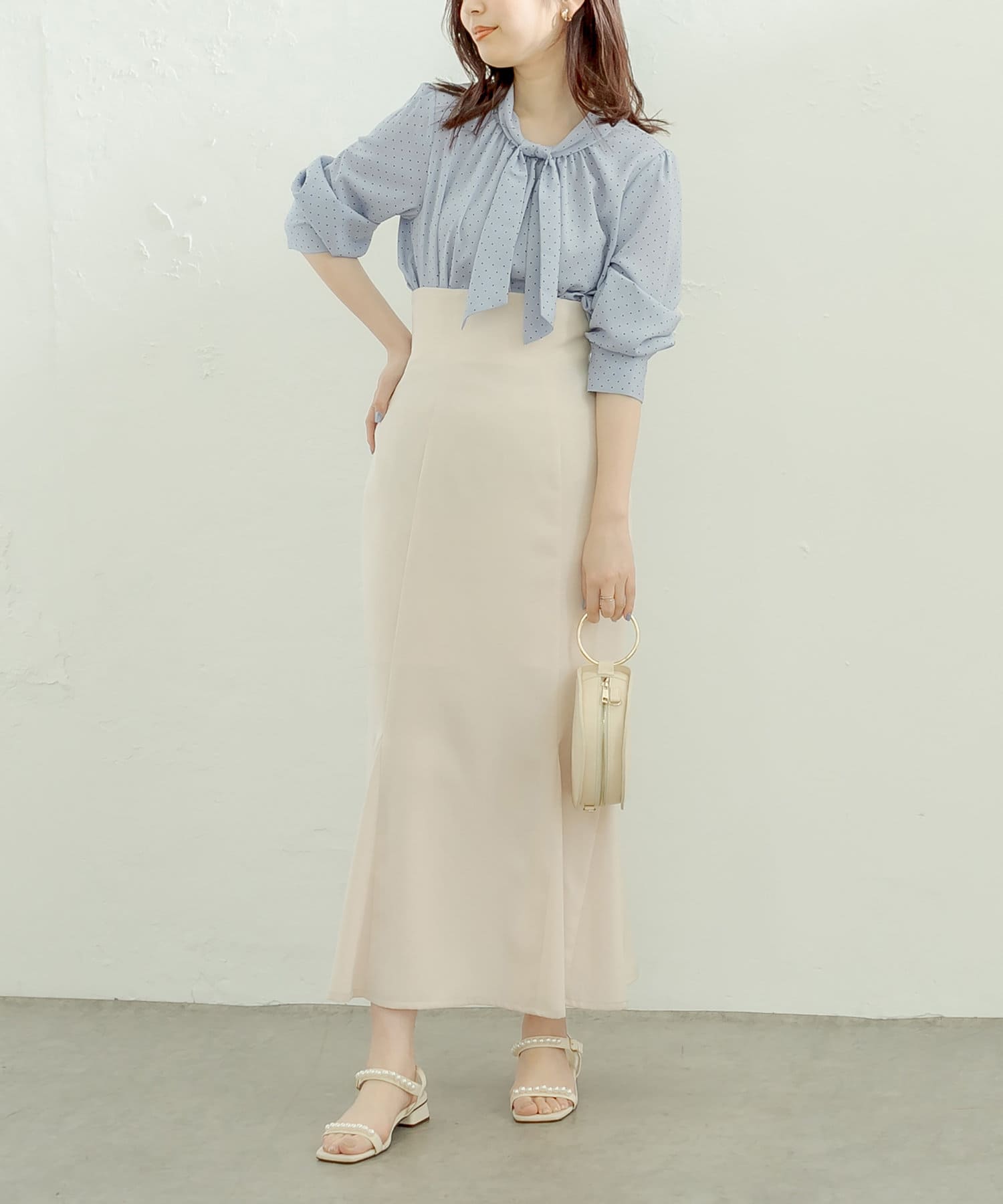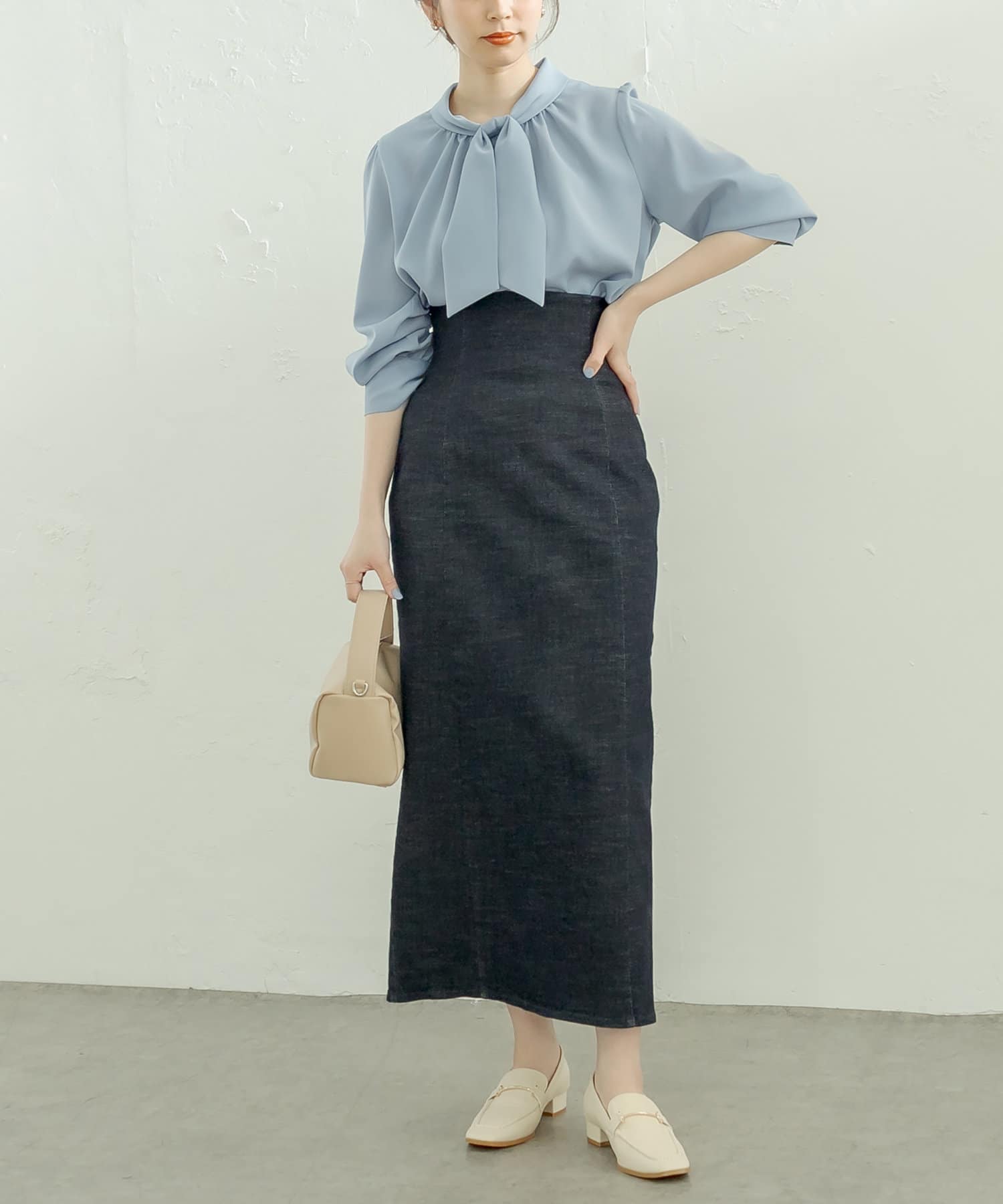 マーメイドシルエットやフレアラインのスカートにウエストインして頂くと、