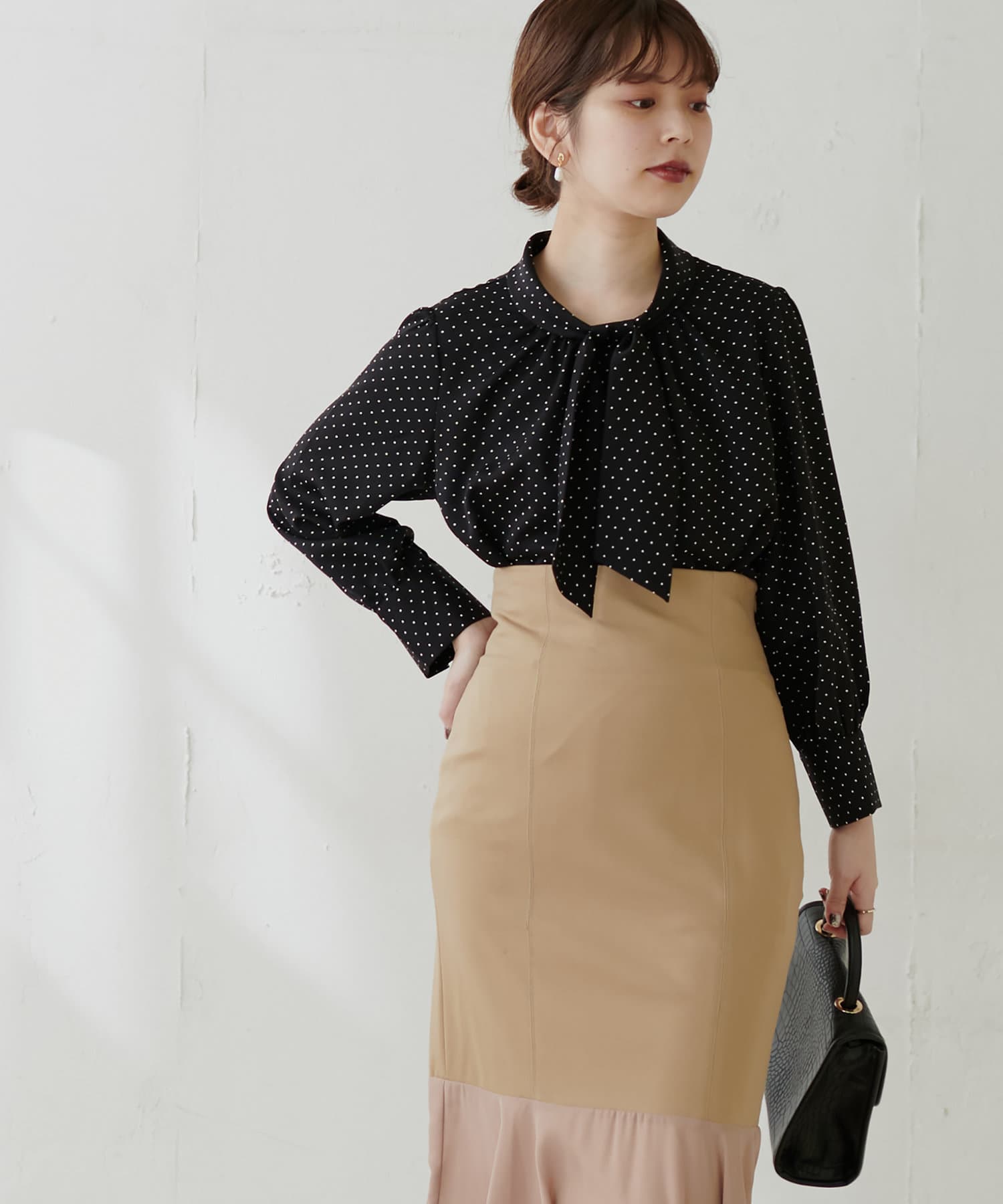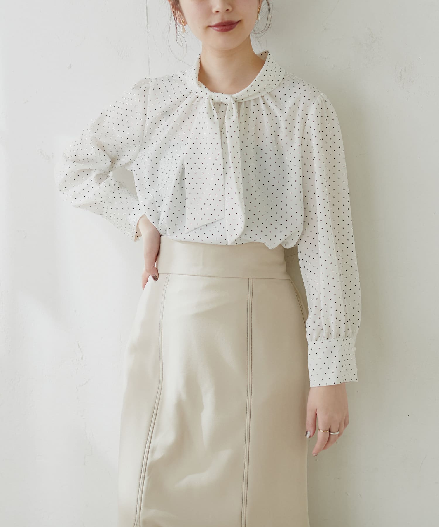 341310500 袖口パールノット結びボータイブラウス