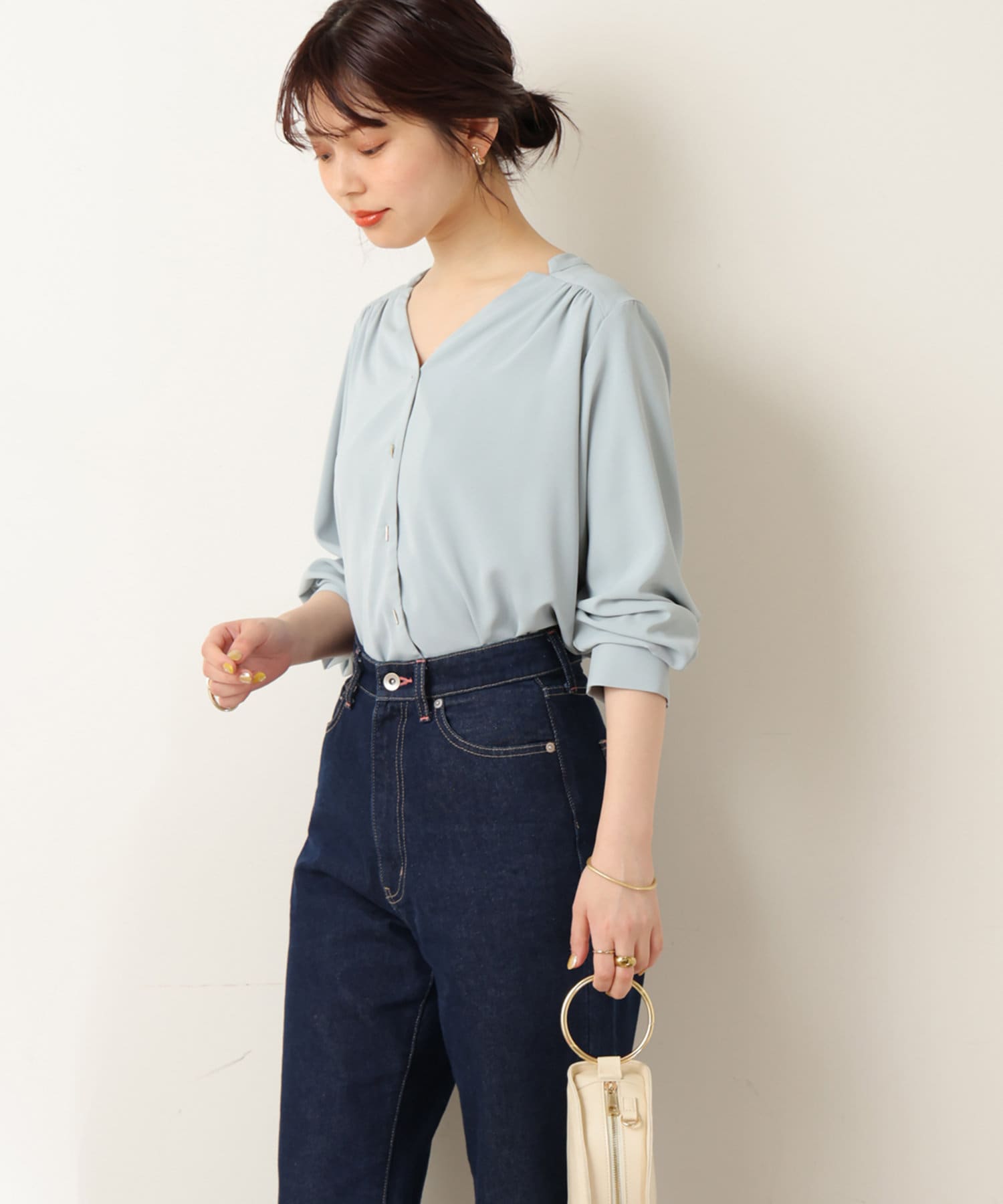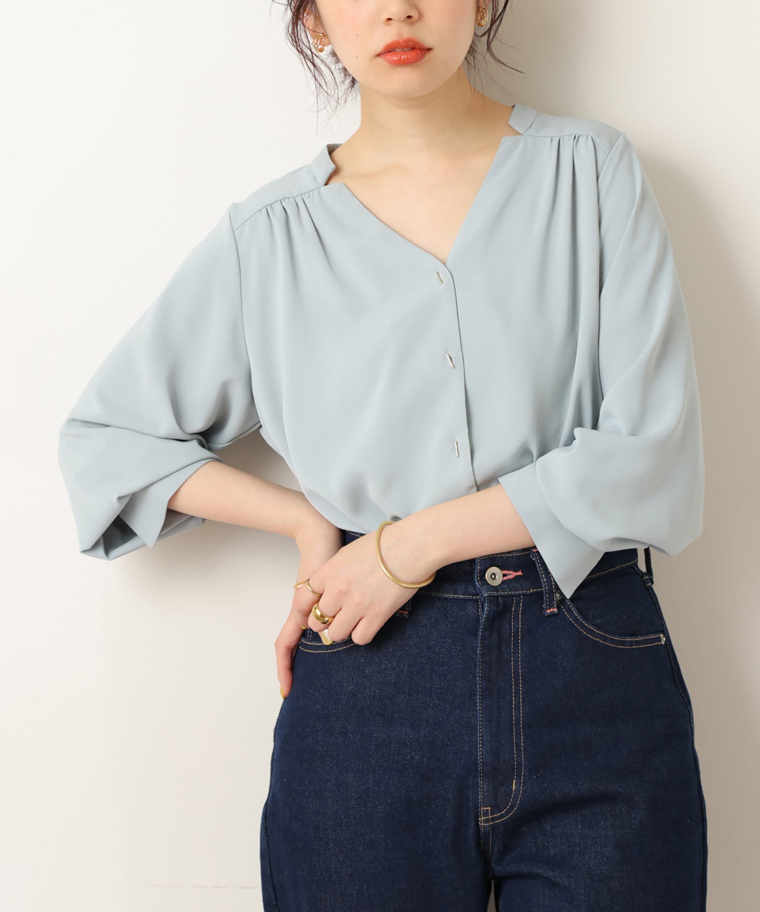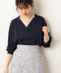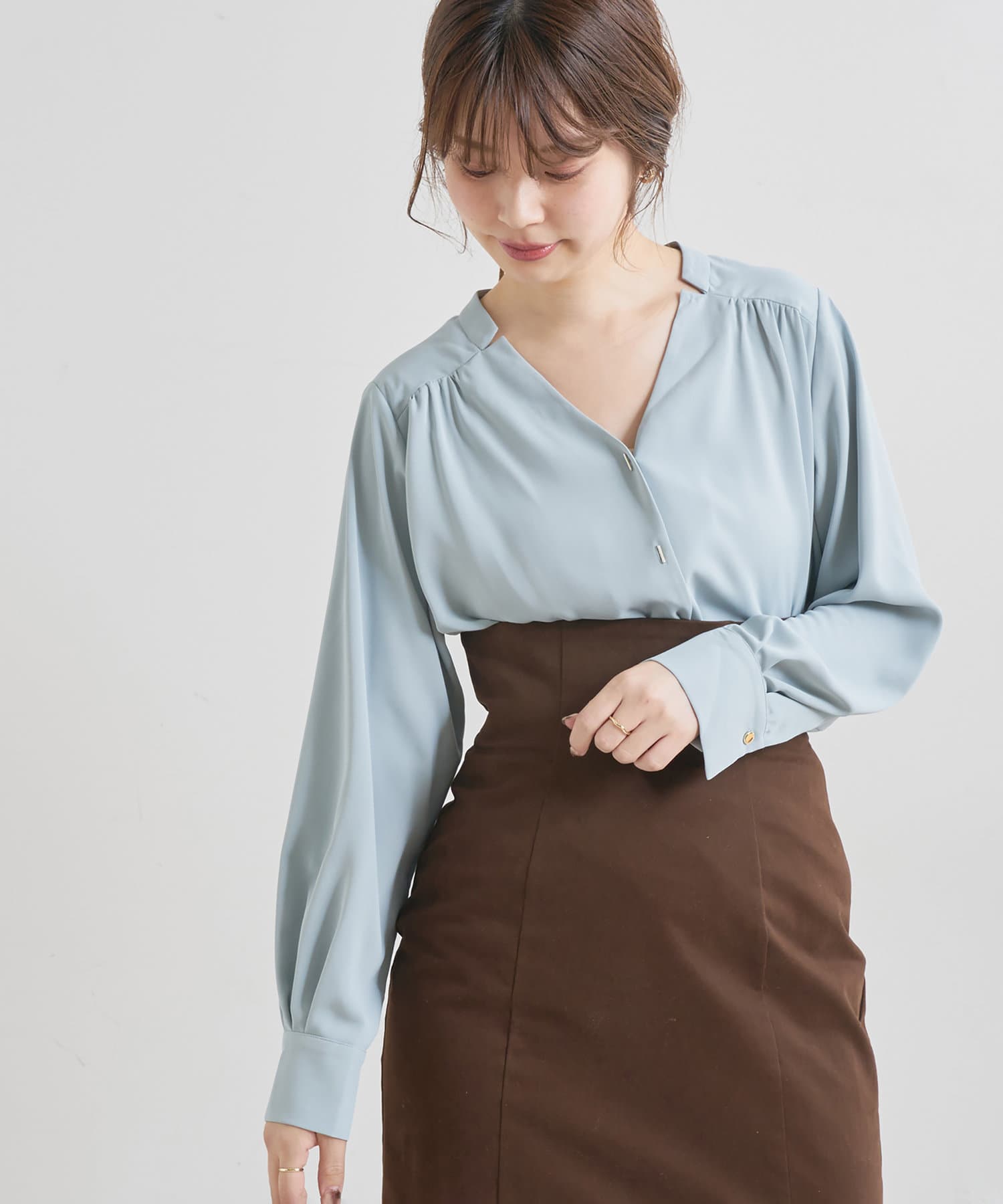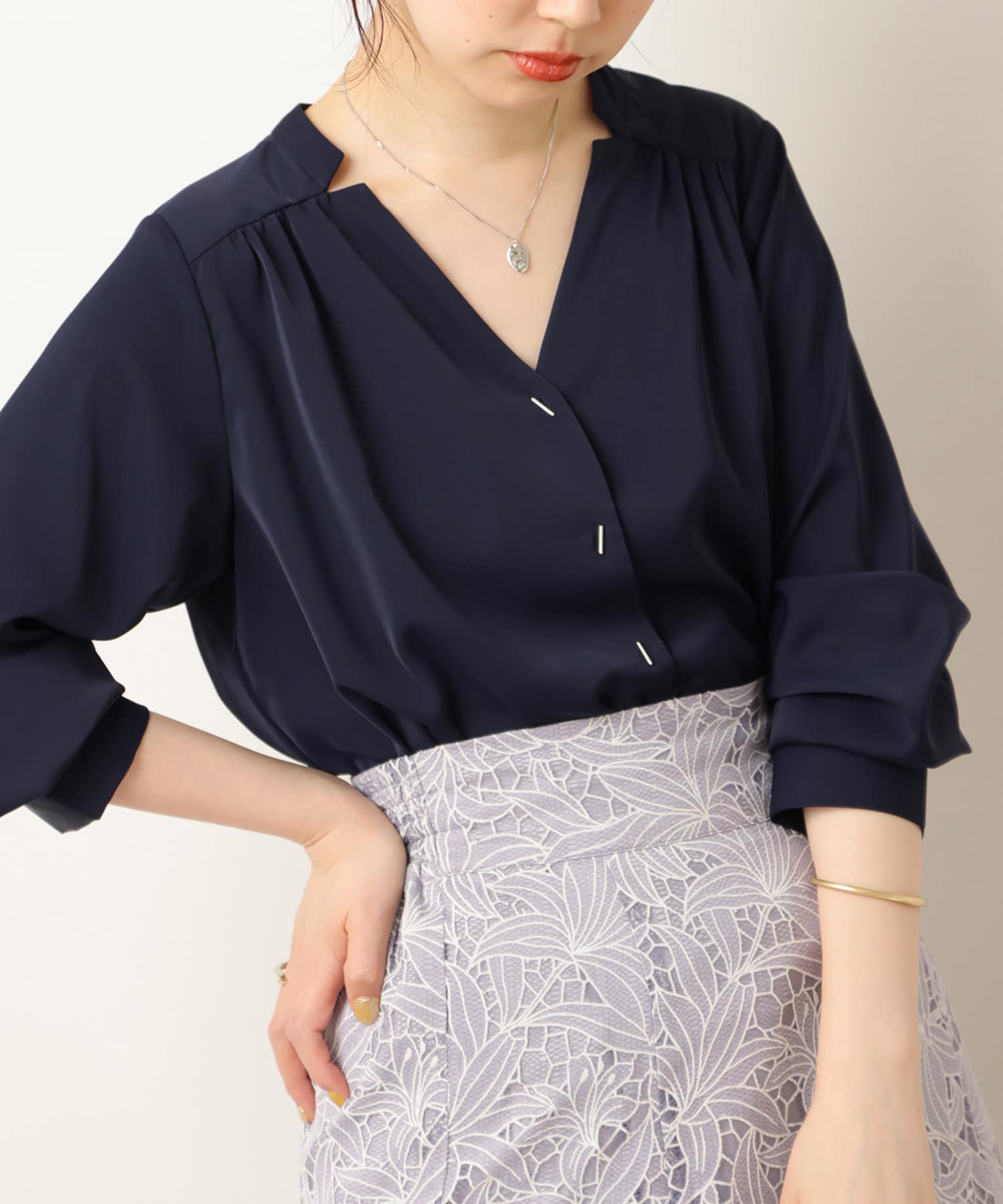 フロントにあしらったゴールドのバーボタンがポイントのお上品ブラウス。