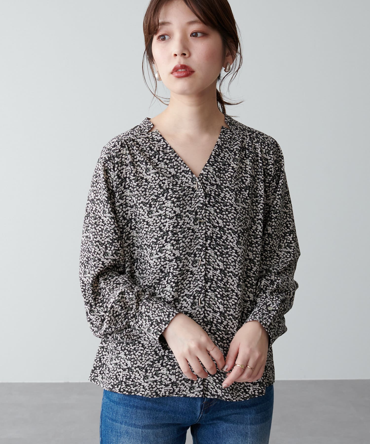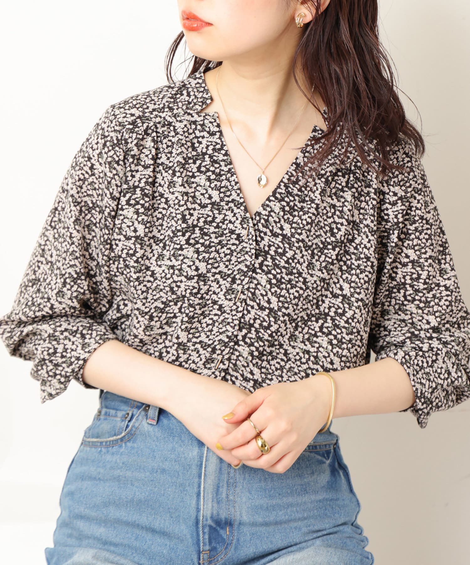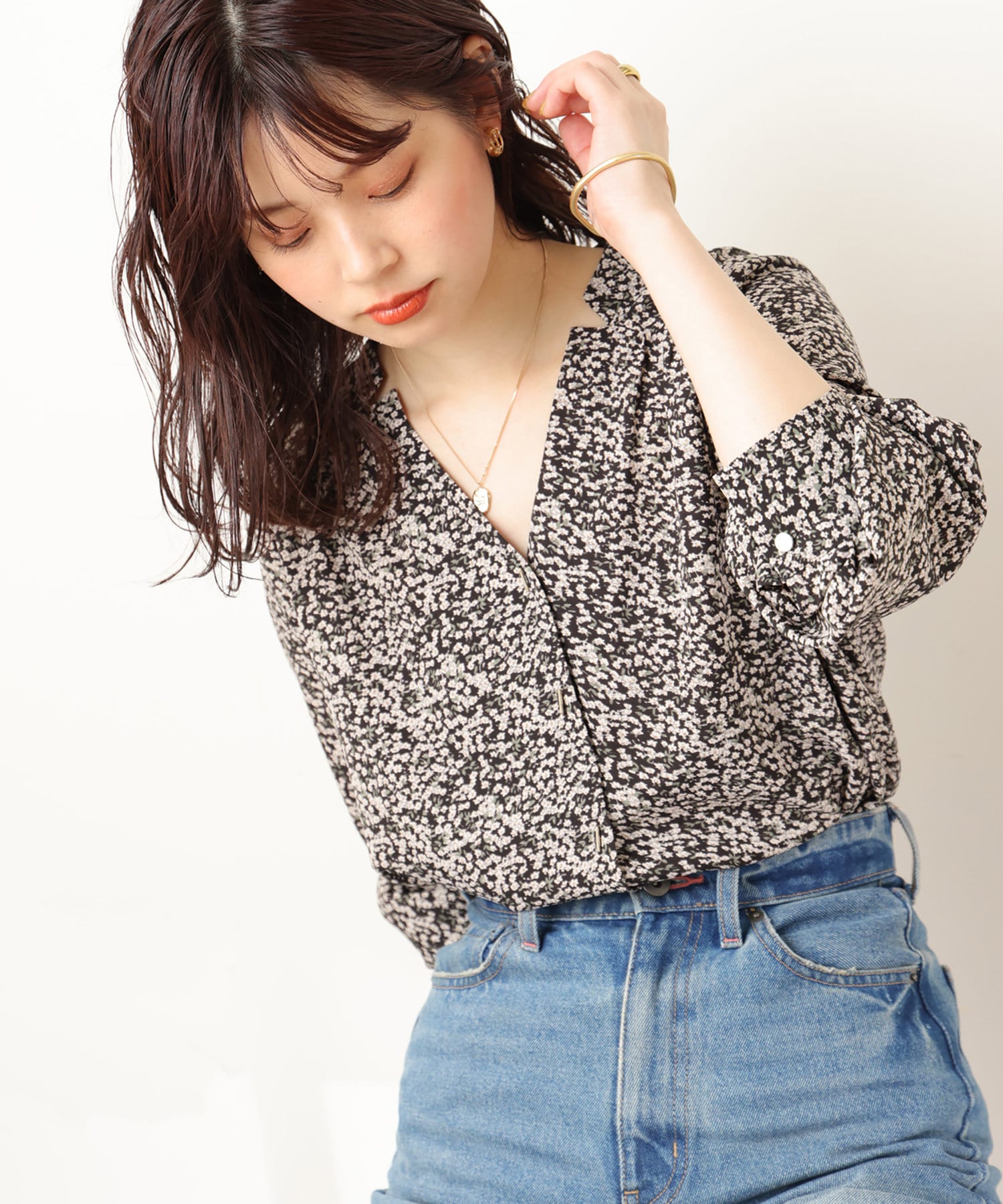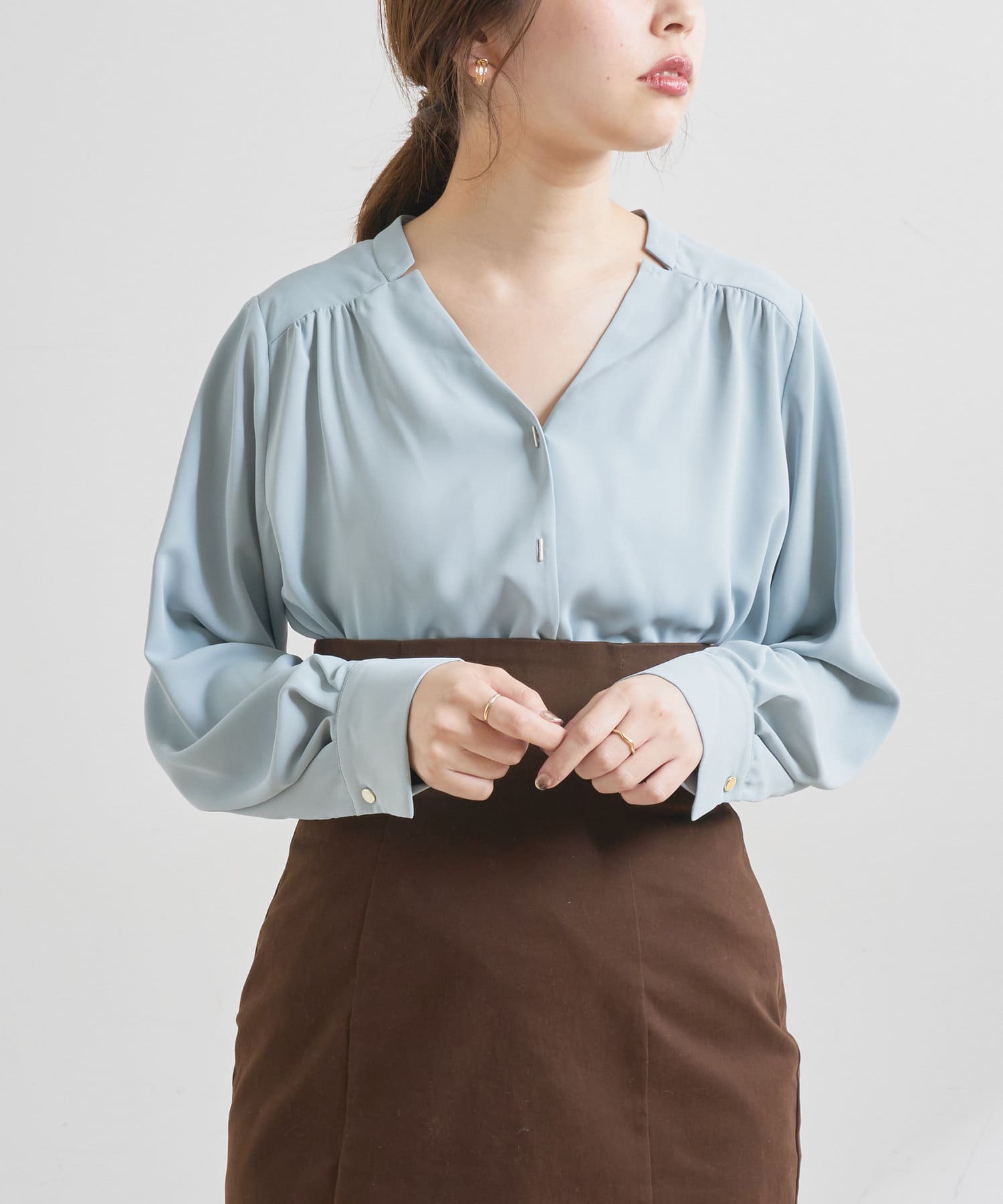 フロントにあしらったゴールドのバーボタンがポイントのお上品ブラウス。