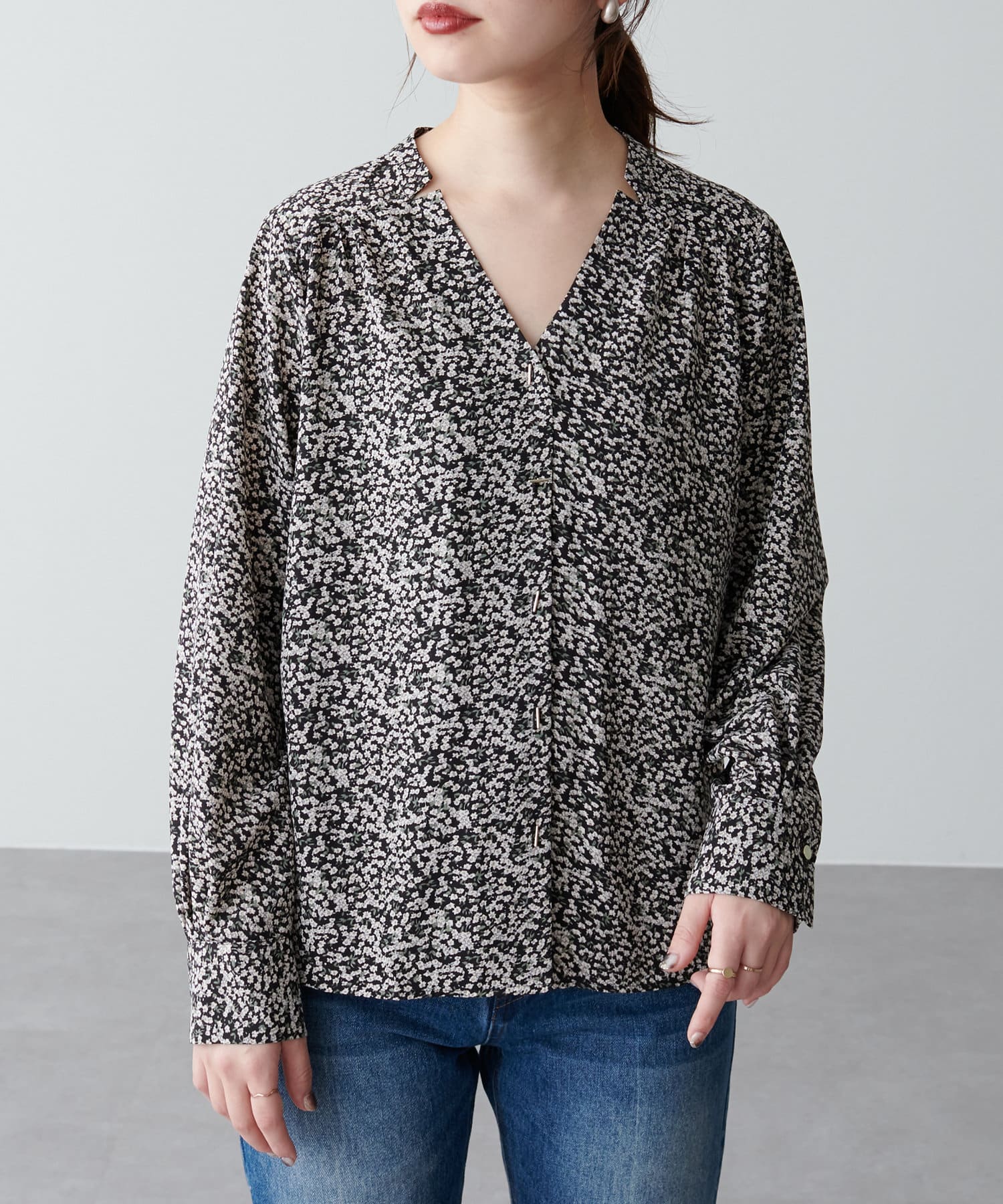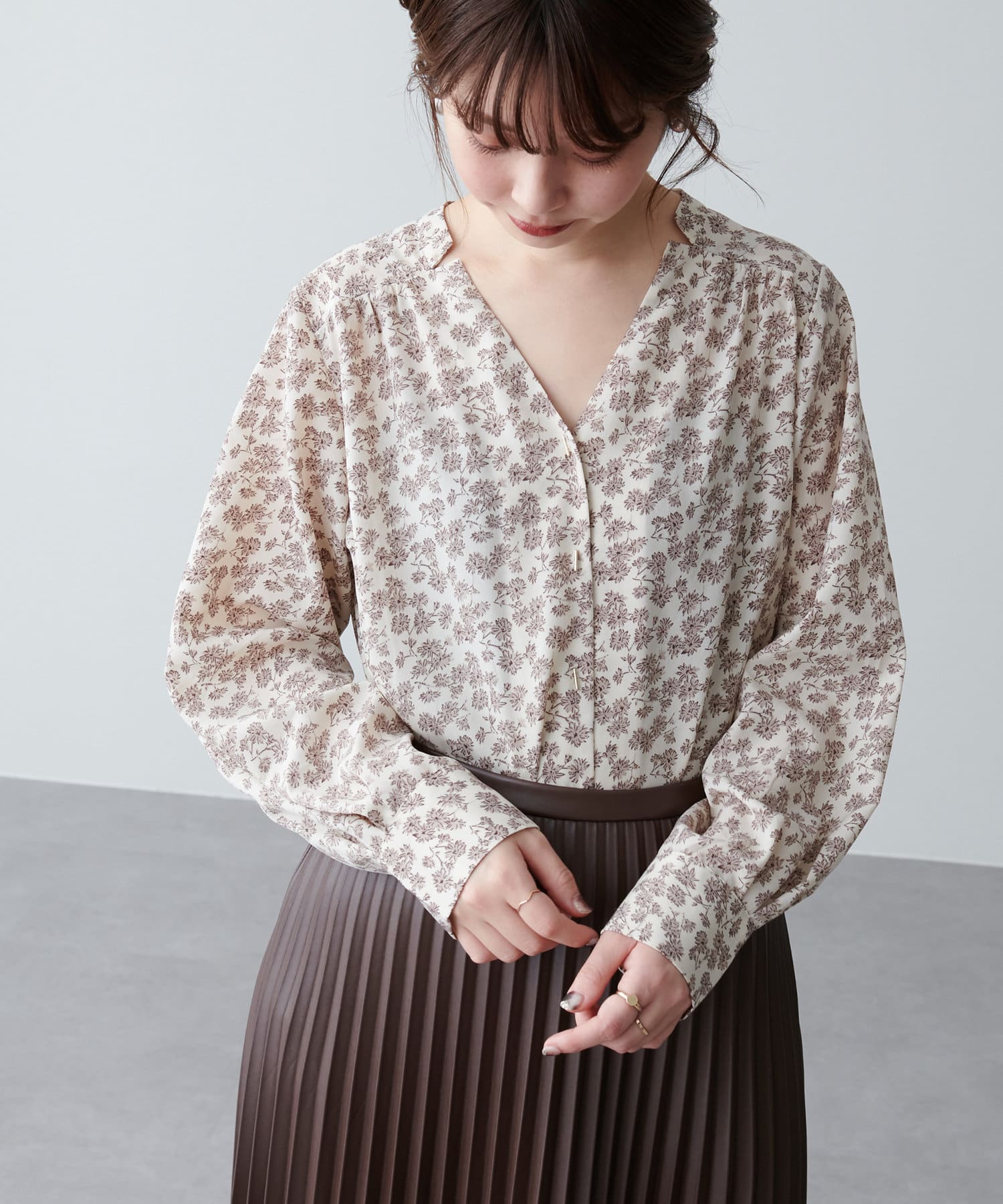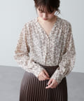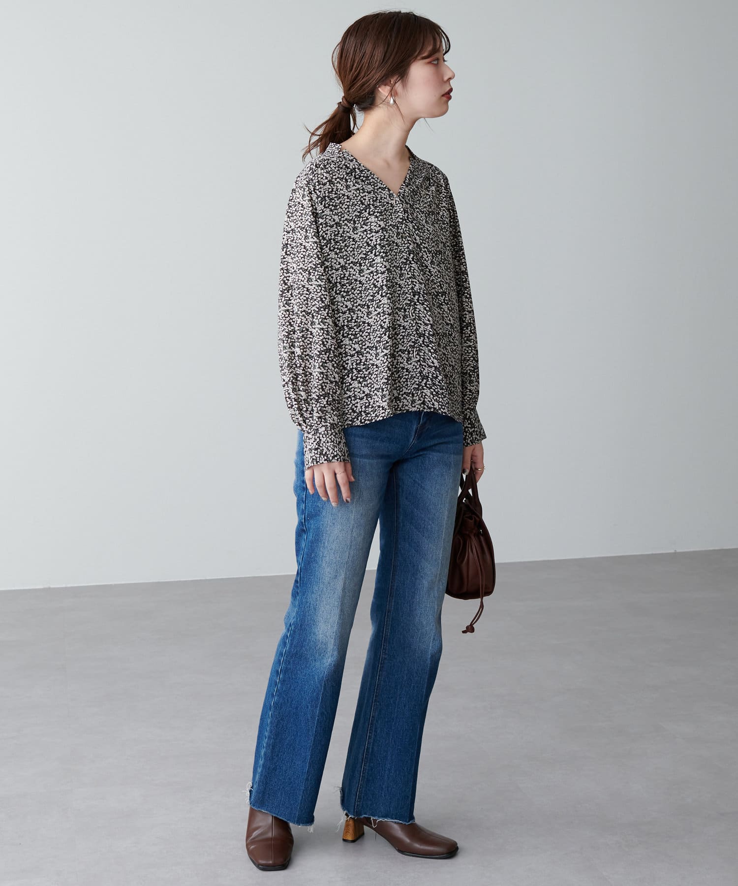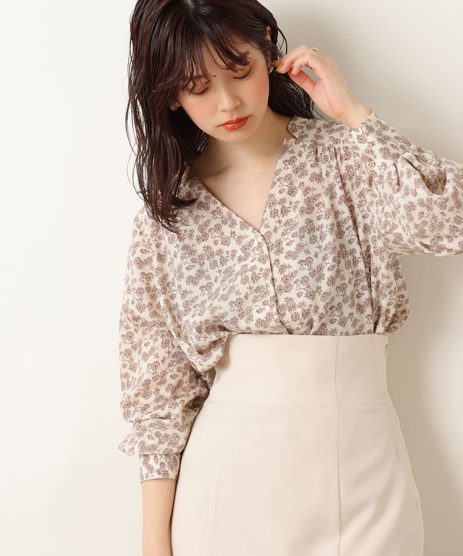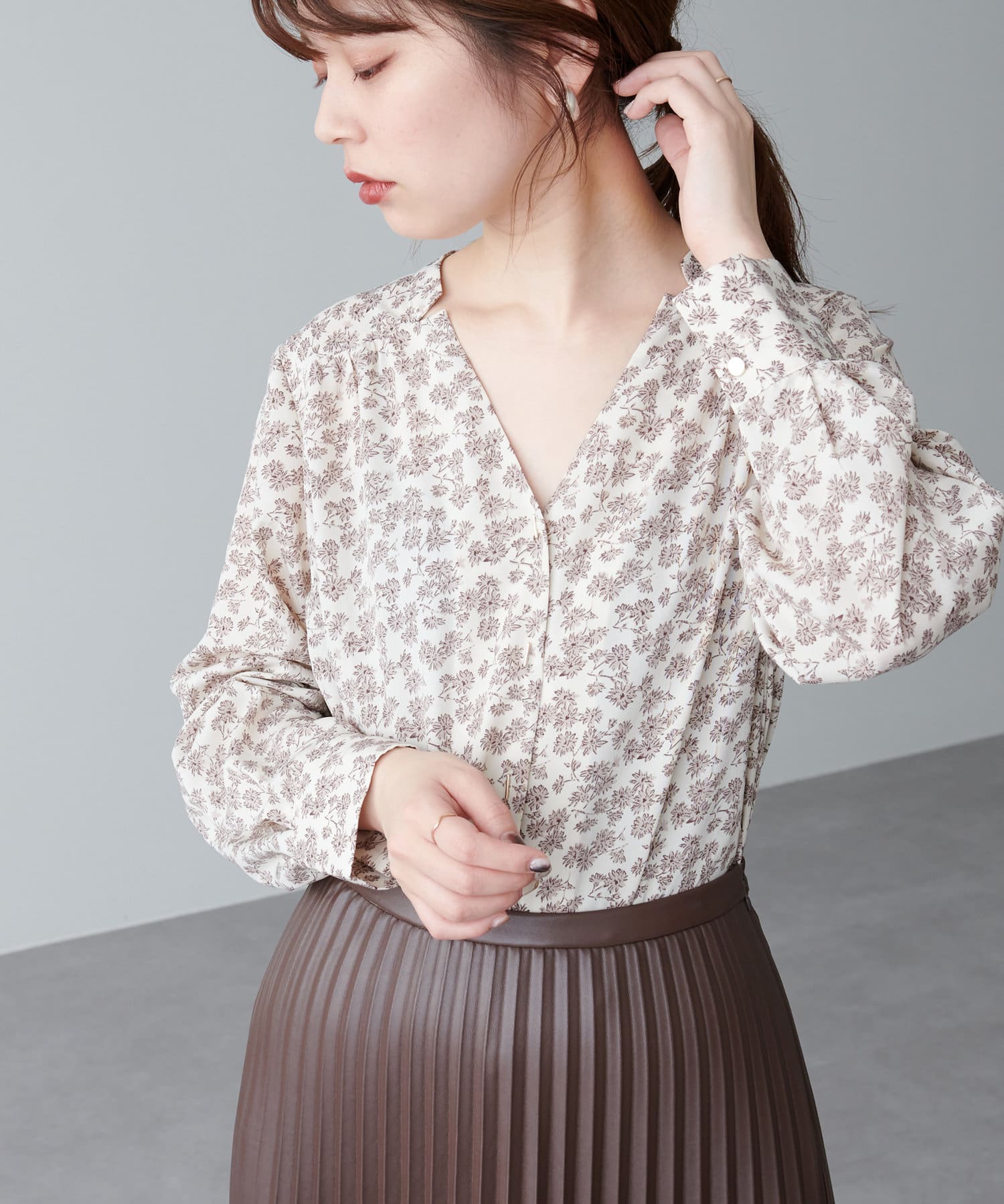 フロントにあしらったゴールドのバーボタンがポイントのお上品ブラウス。