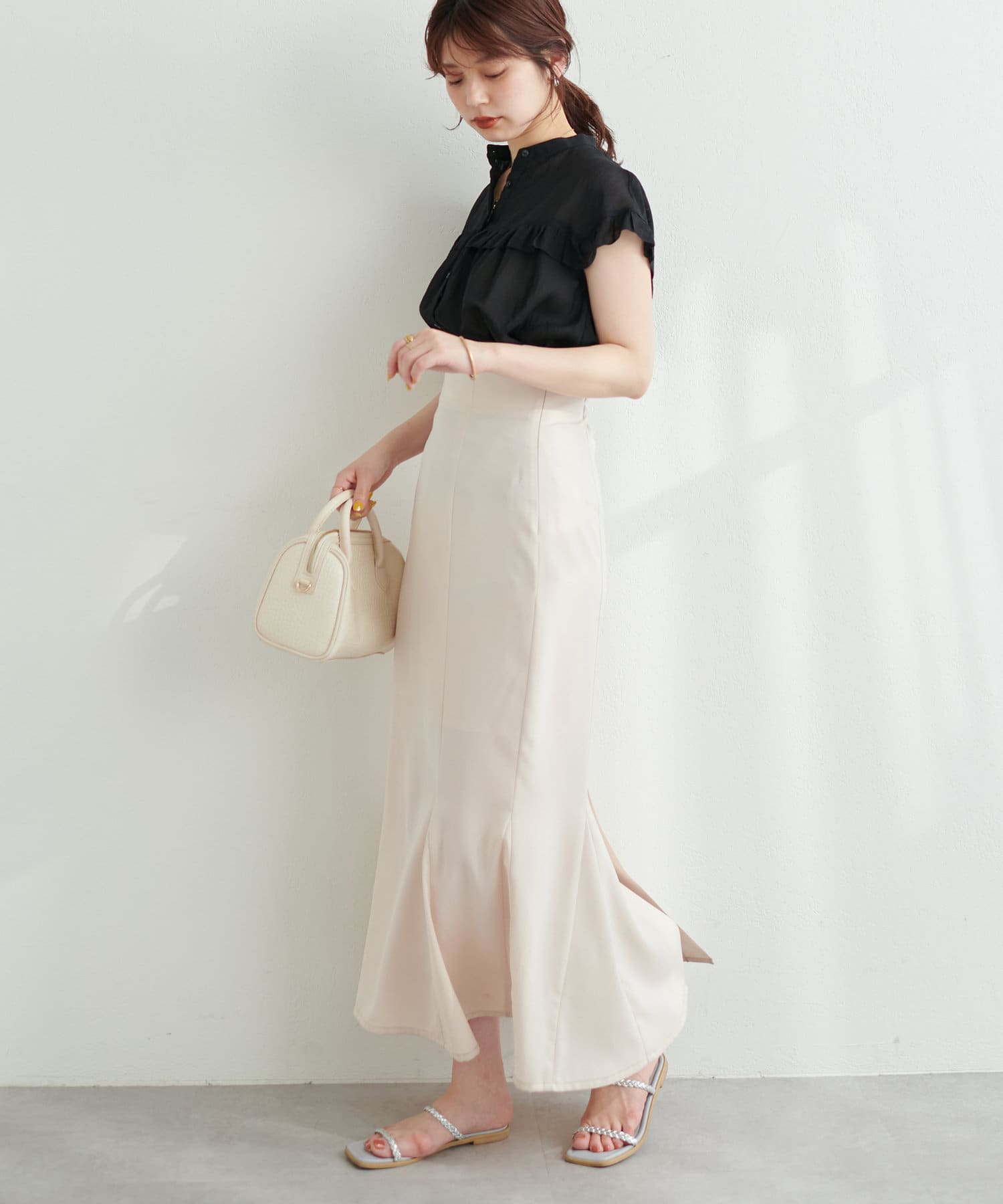 マーメイドシルエットやフレアラインのスカートにウエストインして頂くと、