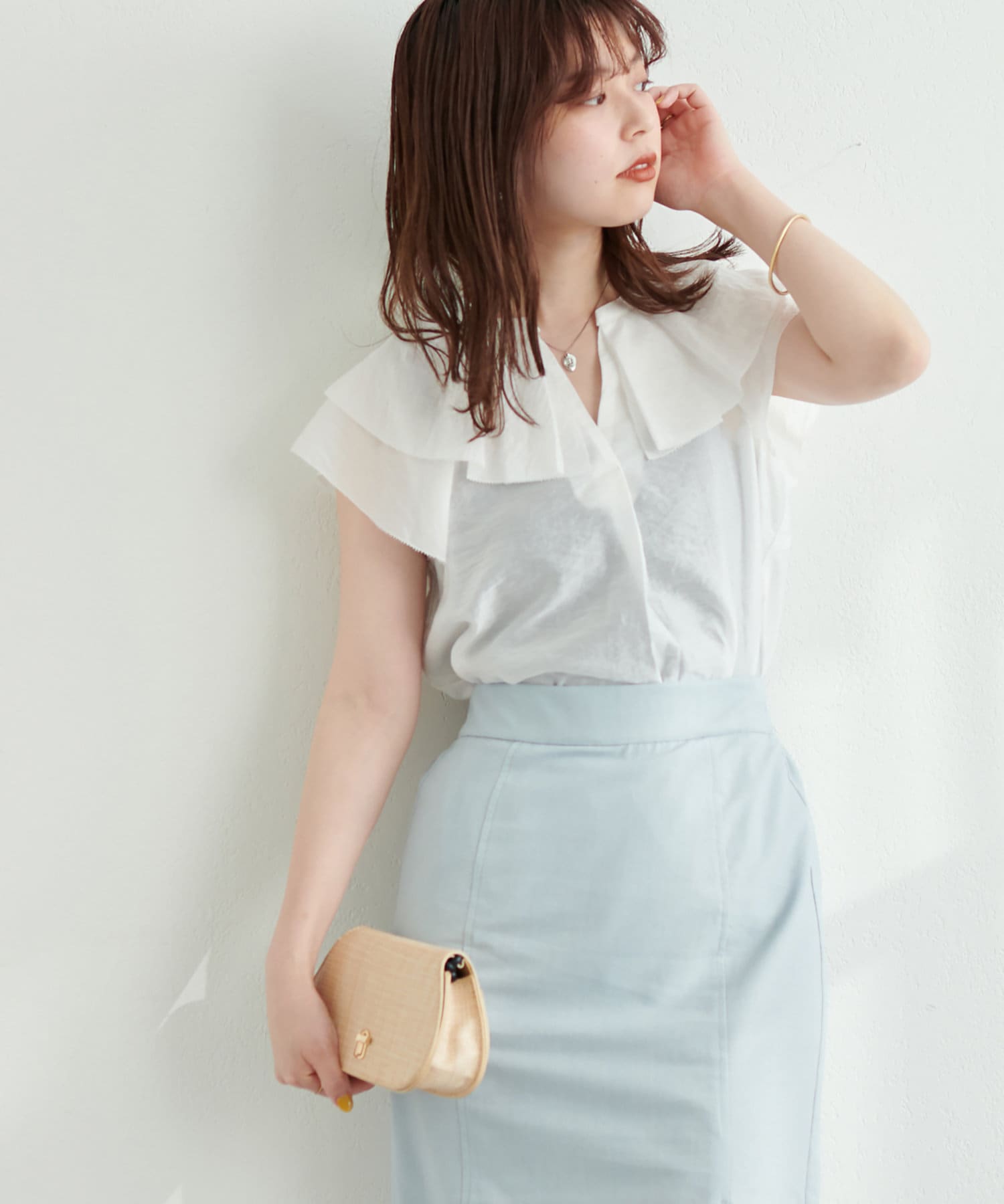 甘すぎない柔らかなフリル使いが、コーデにさりげないポイントをプラスしてくれます。