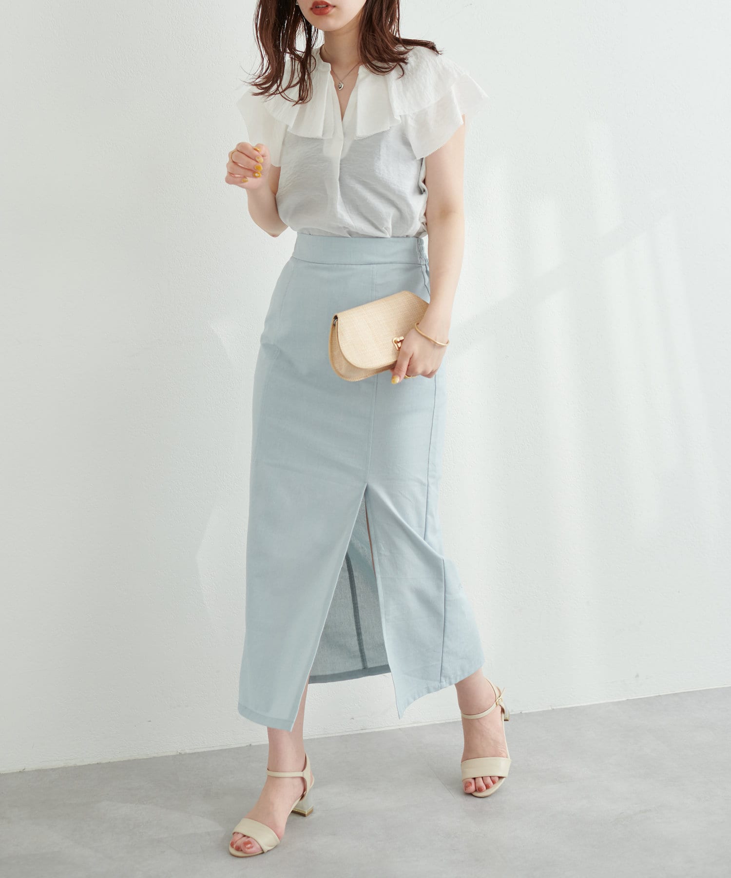 マーメイドシルエットやフレアラインのスカートにウエストインして頂くと、女性らしさが引き立つ上品スタイルに◎