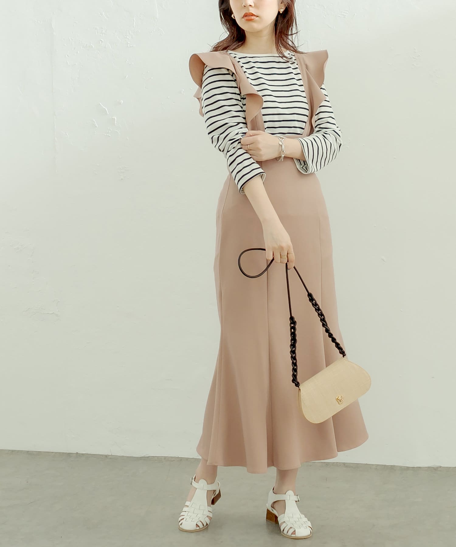 トレンドのマーメイドシルエットのスカートに、取り外し可能なラッフルフリル仕様の肩紐を施した、