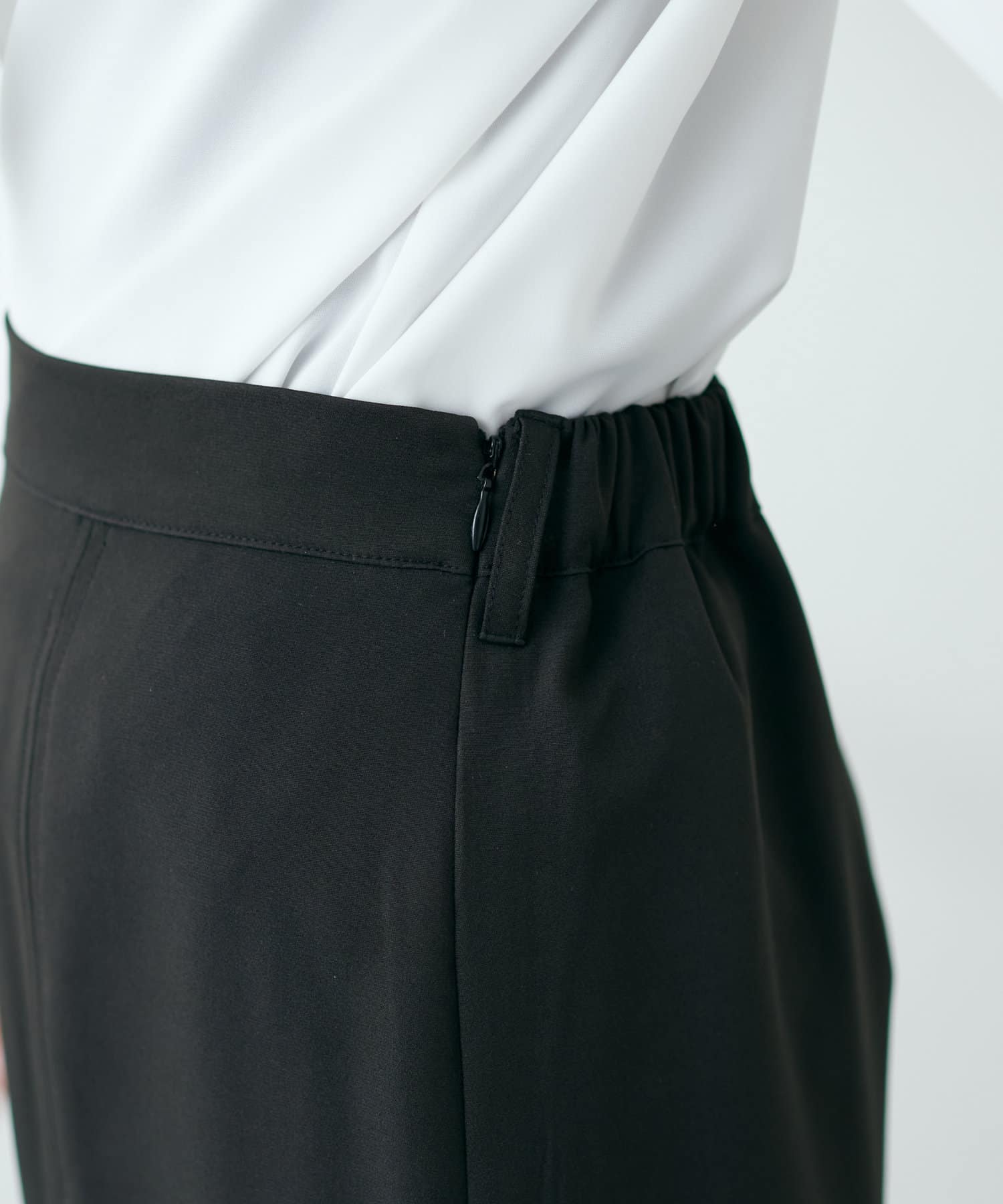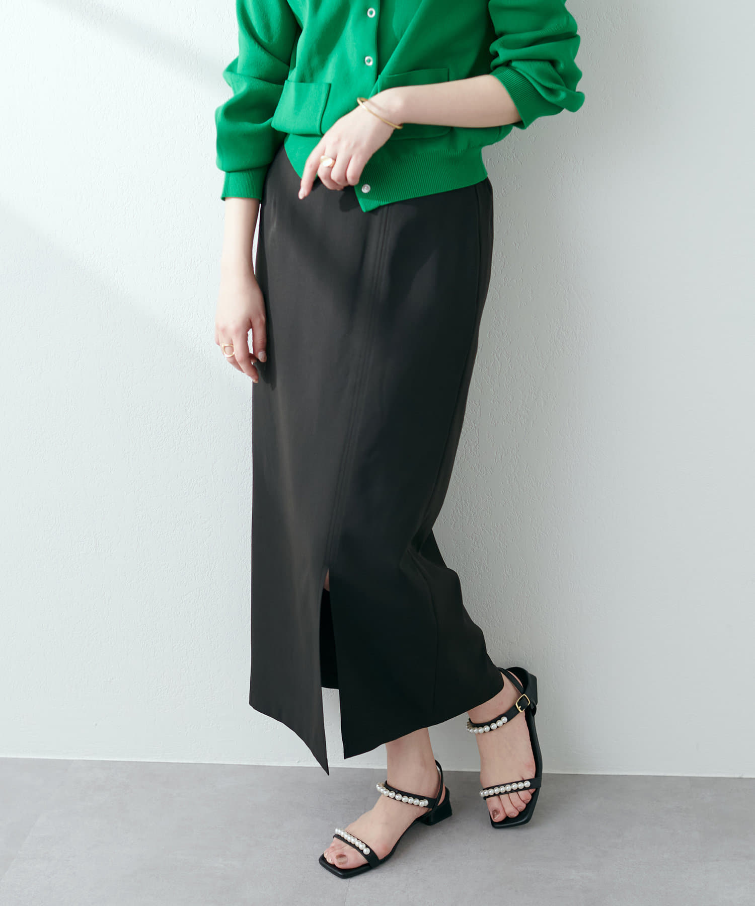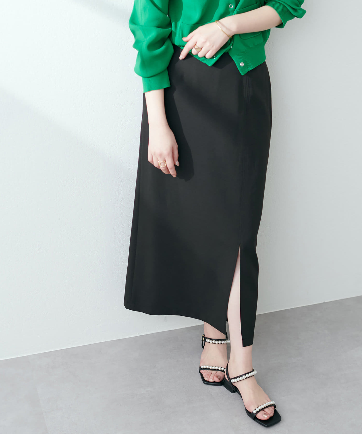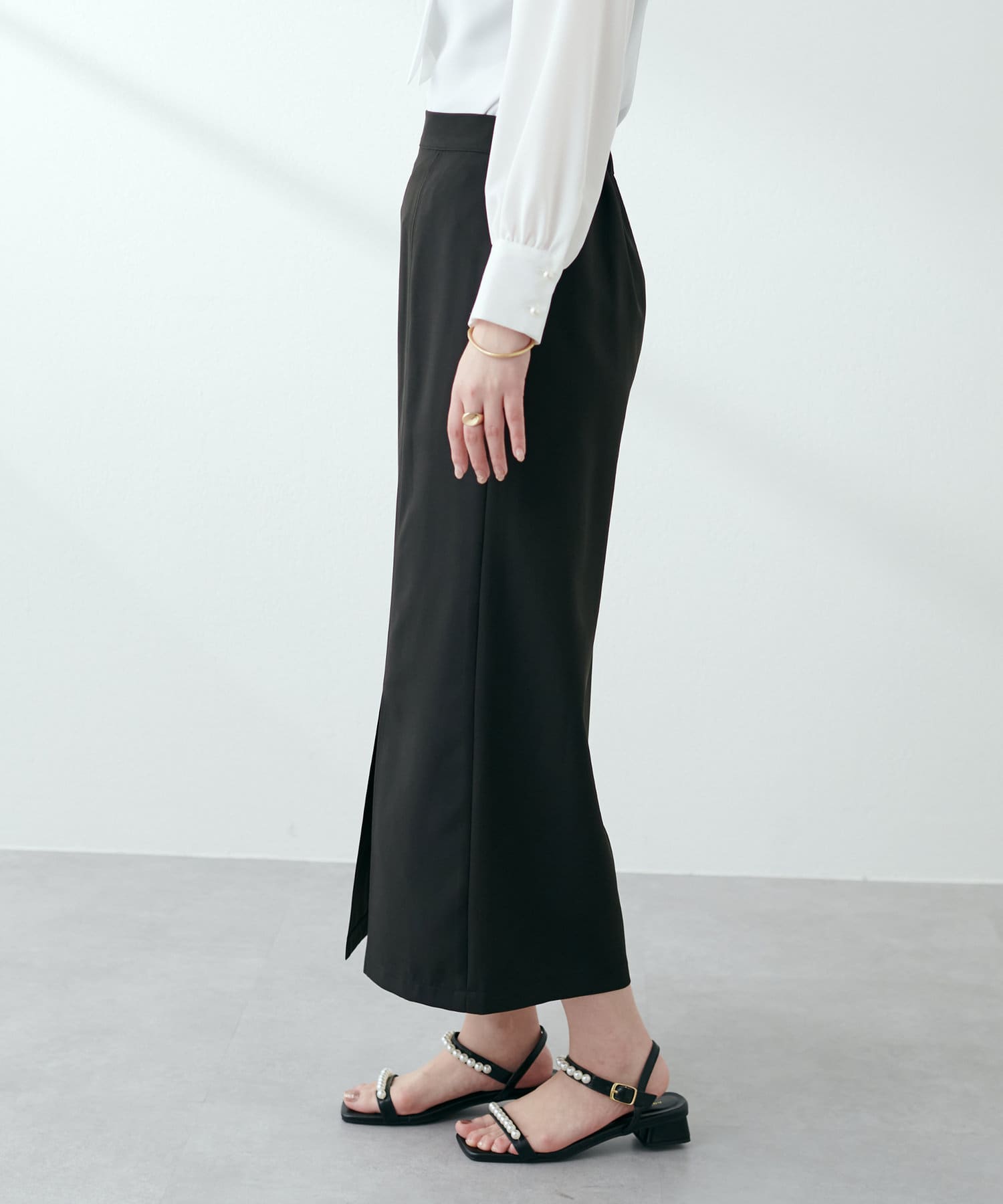 ゆとりのある丈感とややサイドに施したスリットデザインが、脚のラインを美しく見せてくれる1品。