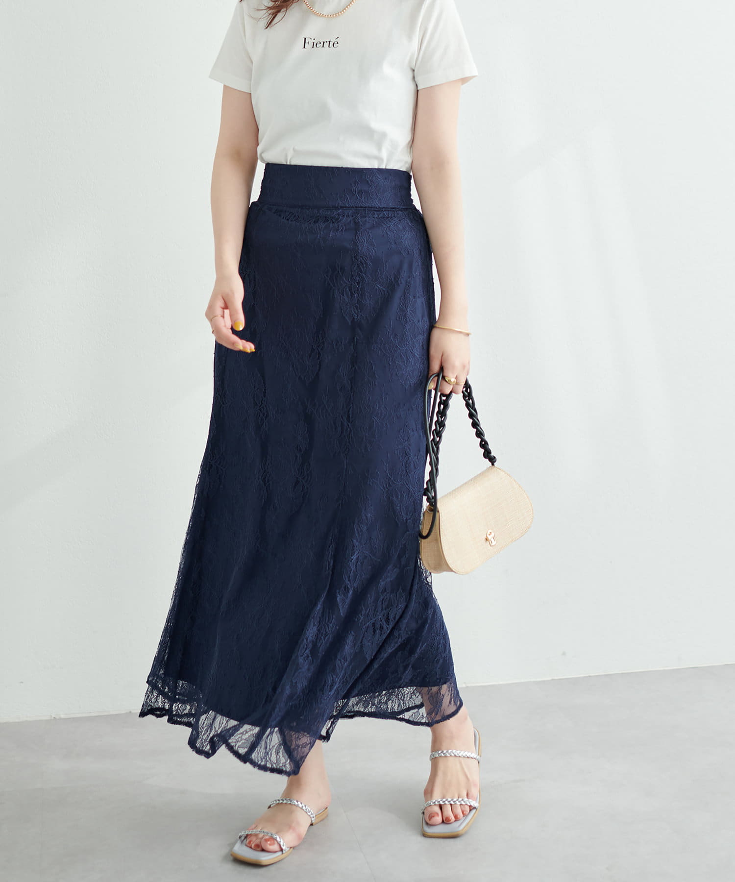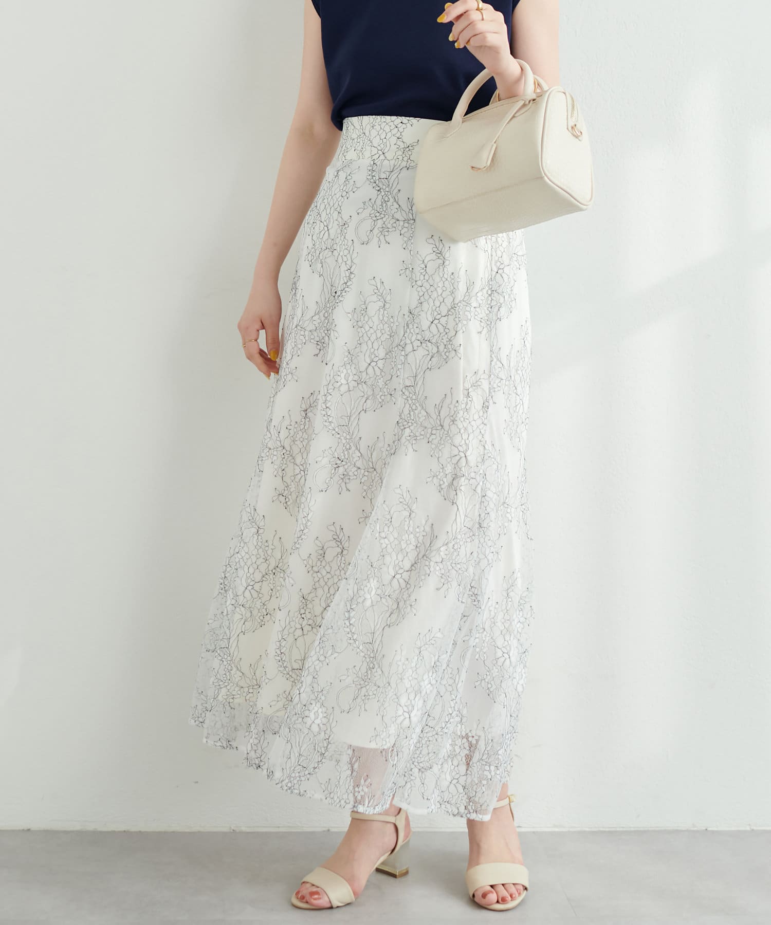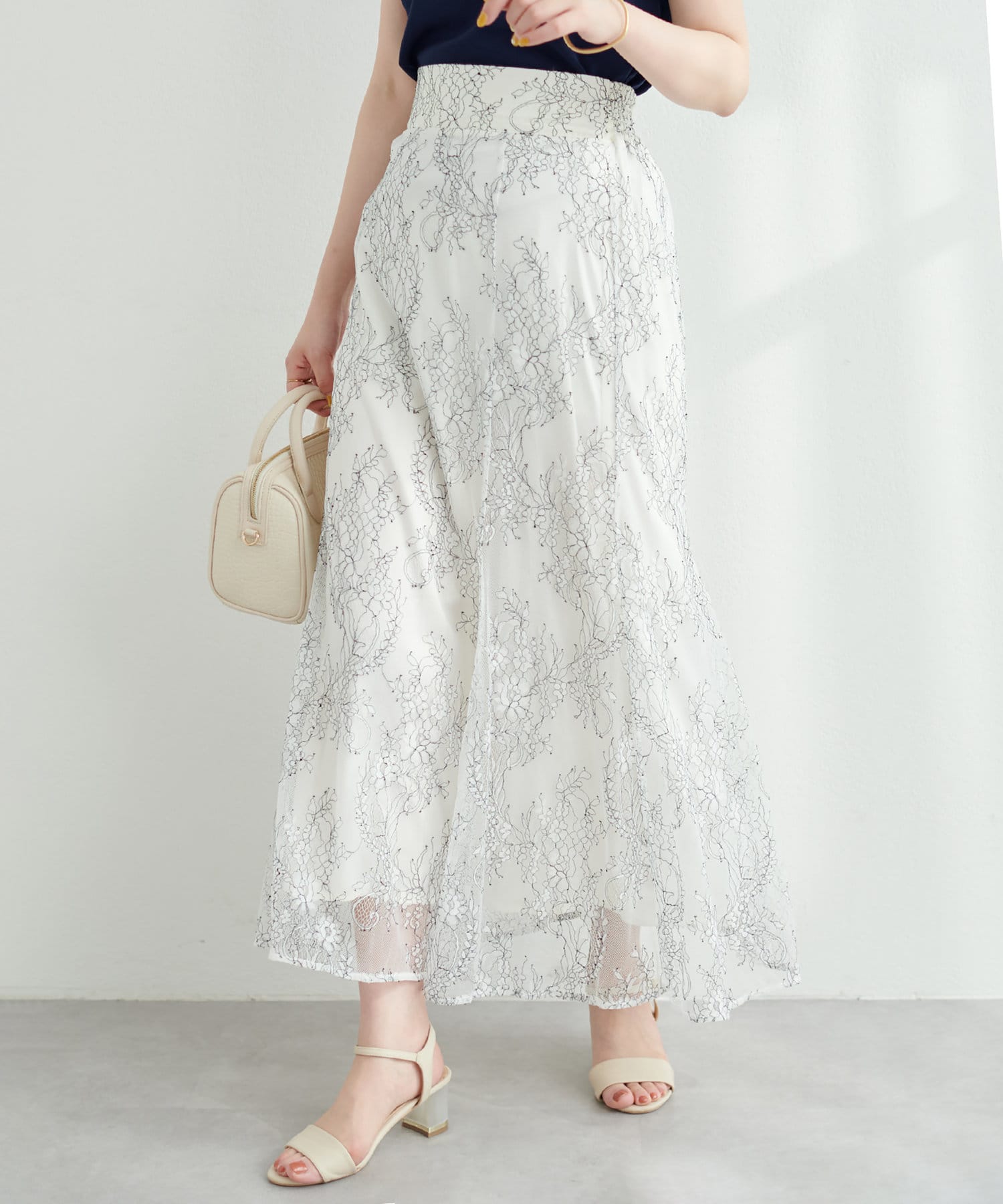 シーズン長く着れるレーススカートとなっており、ゆるめのプルオーバーなどと合わせてカジュアルコーデにも◎。