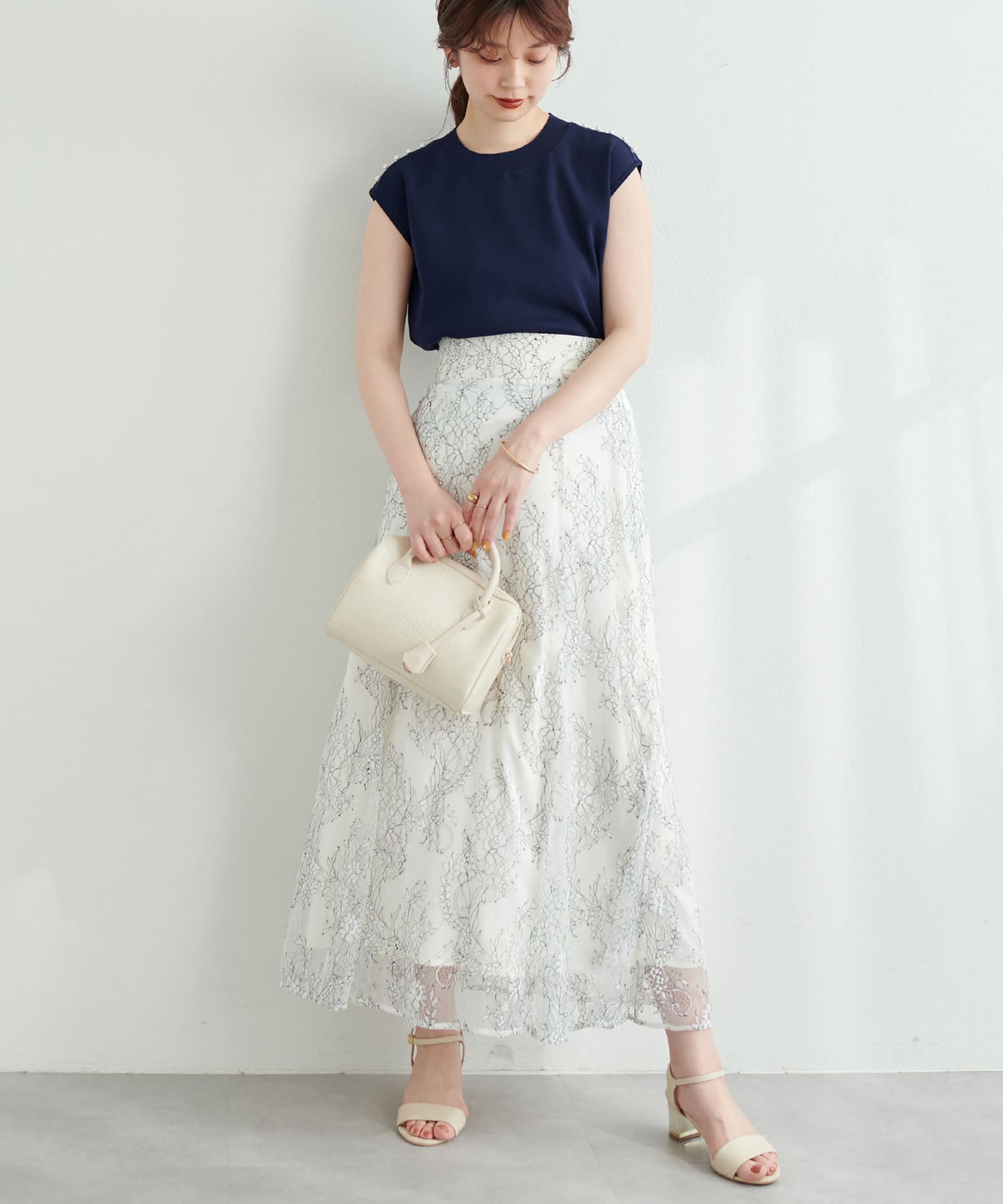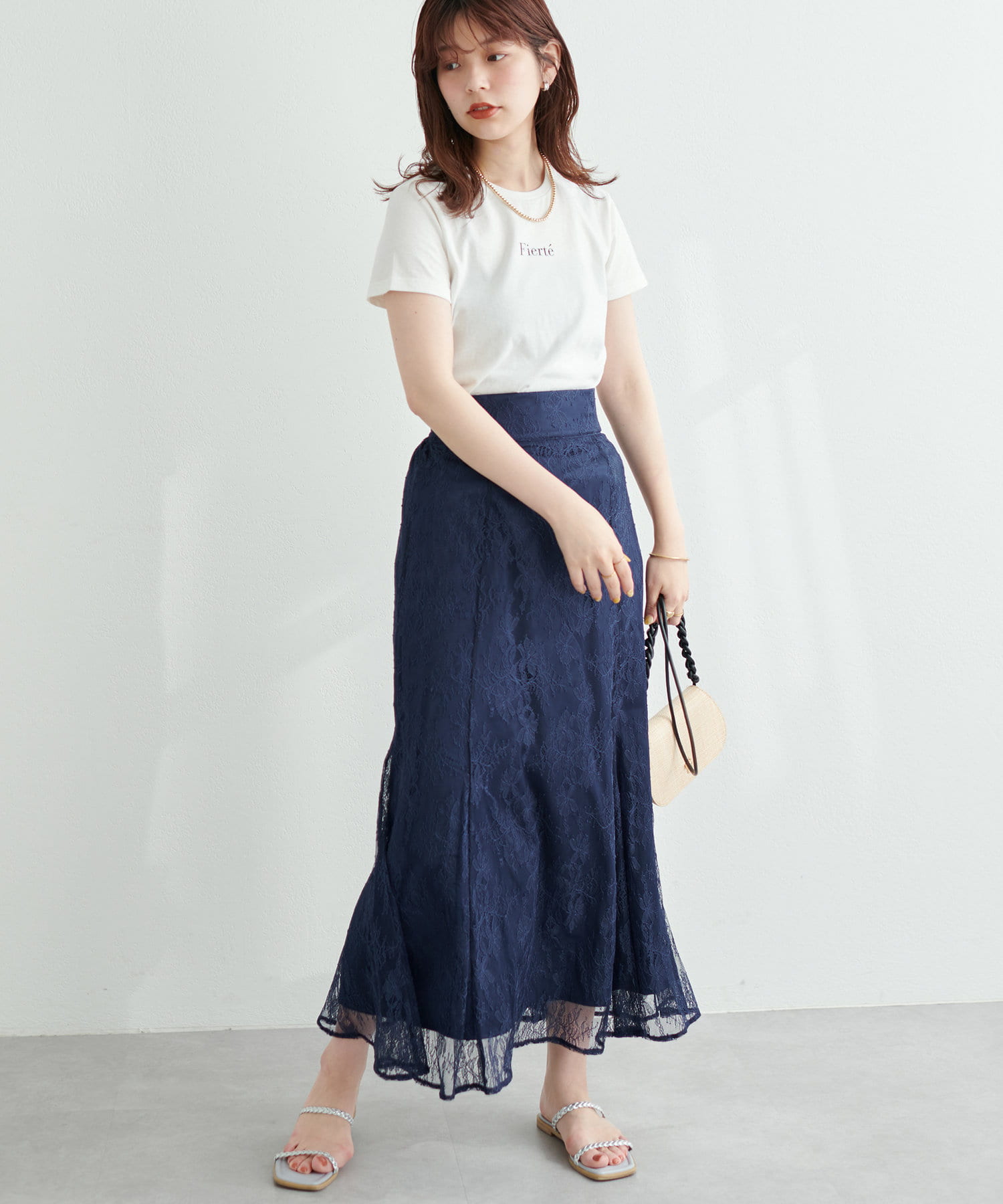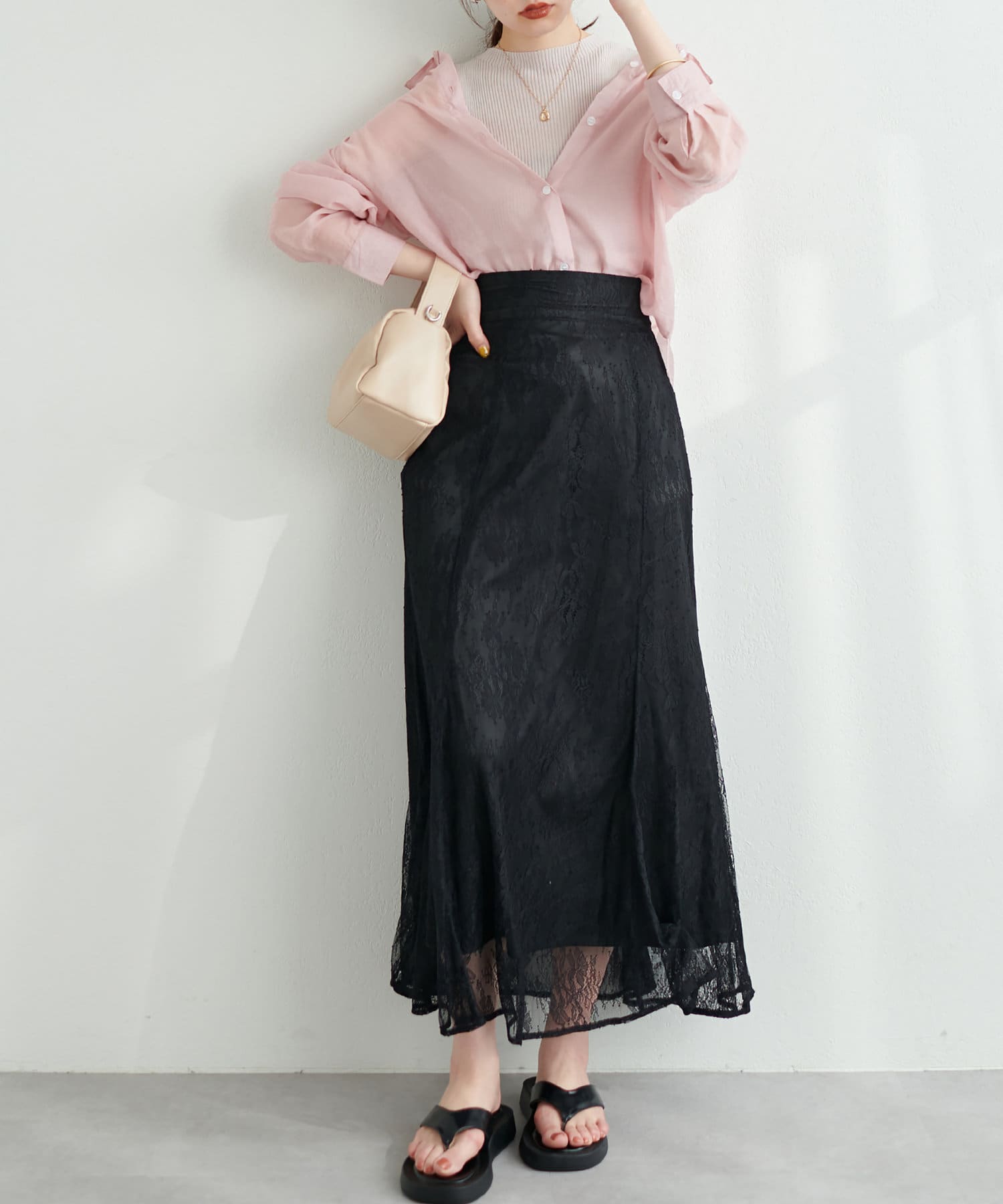 シーズン長く着れるレーススカートとなっており、ゆるめのプルオーバーなどと合わせてカジュアルコーデにも◎。