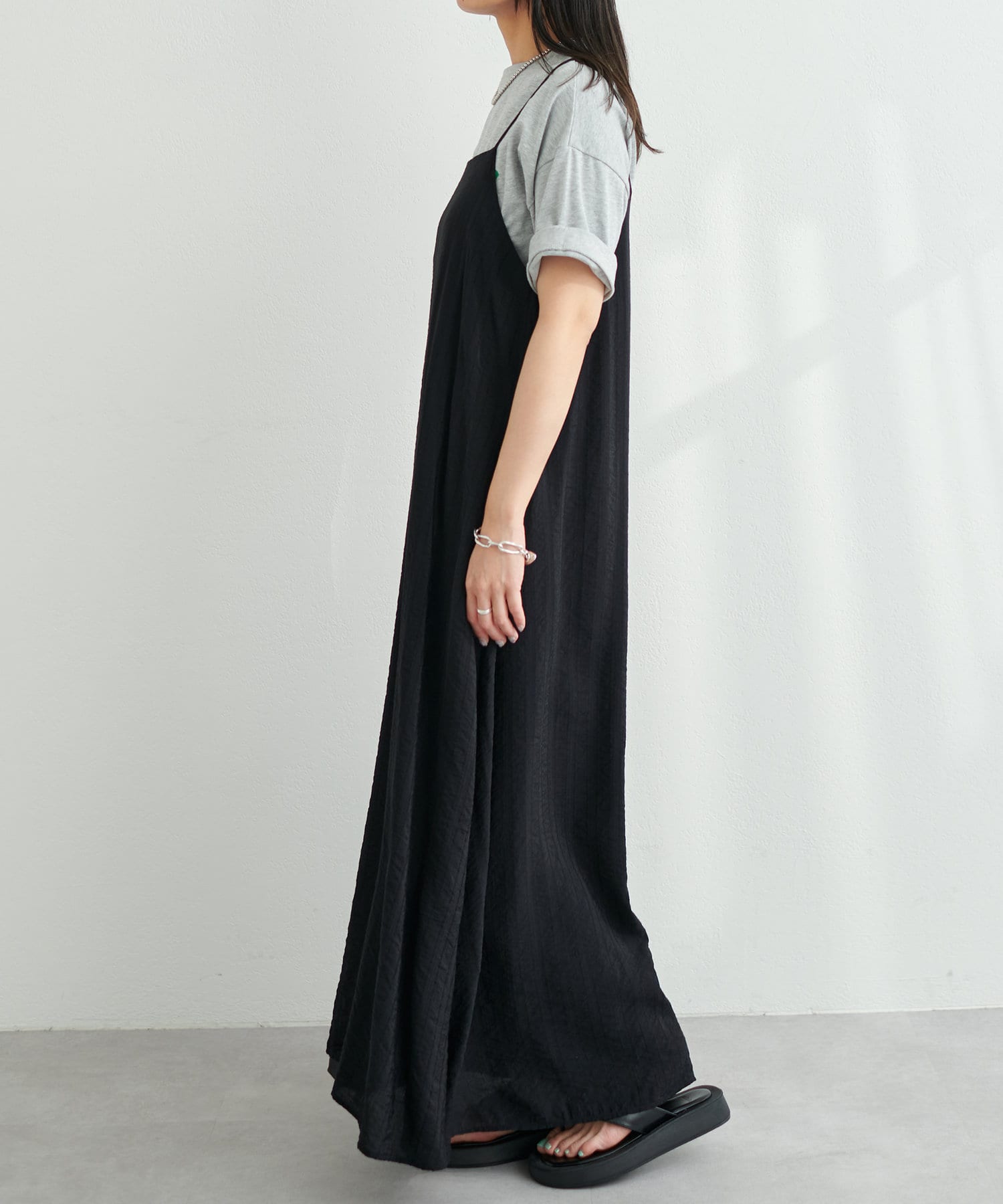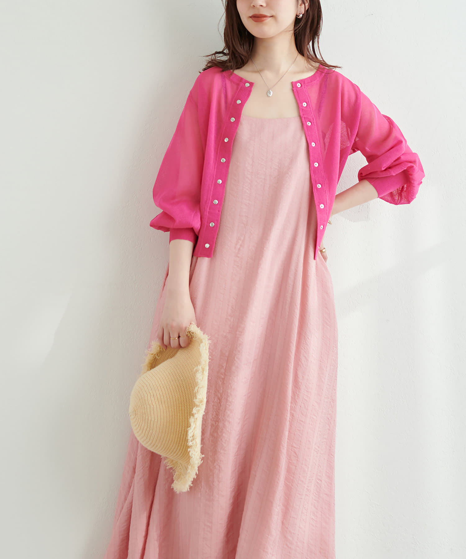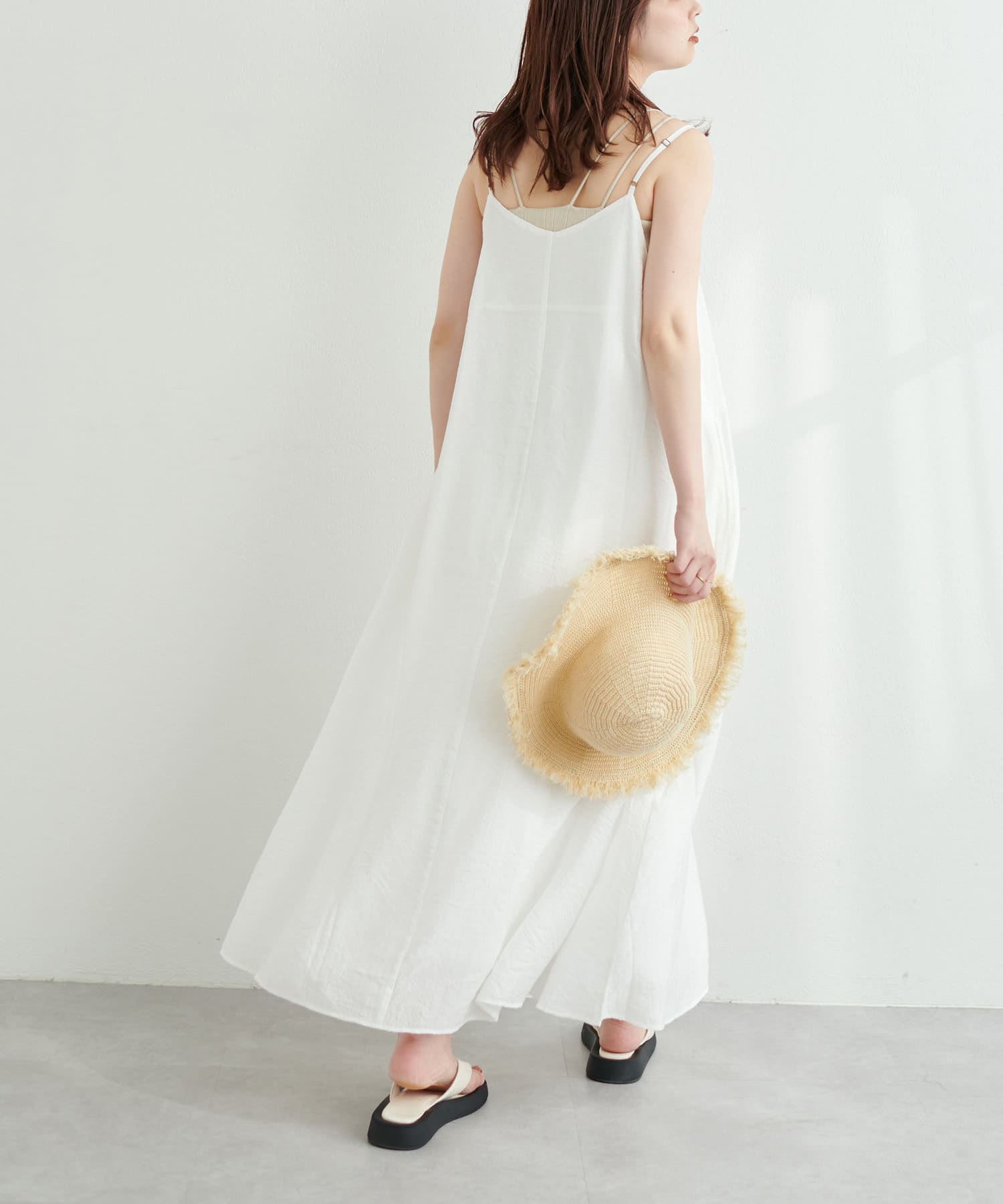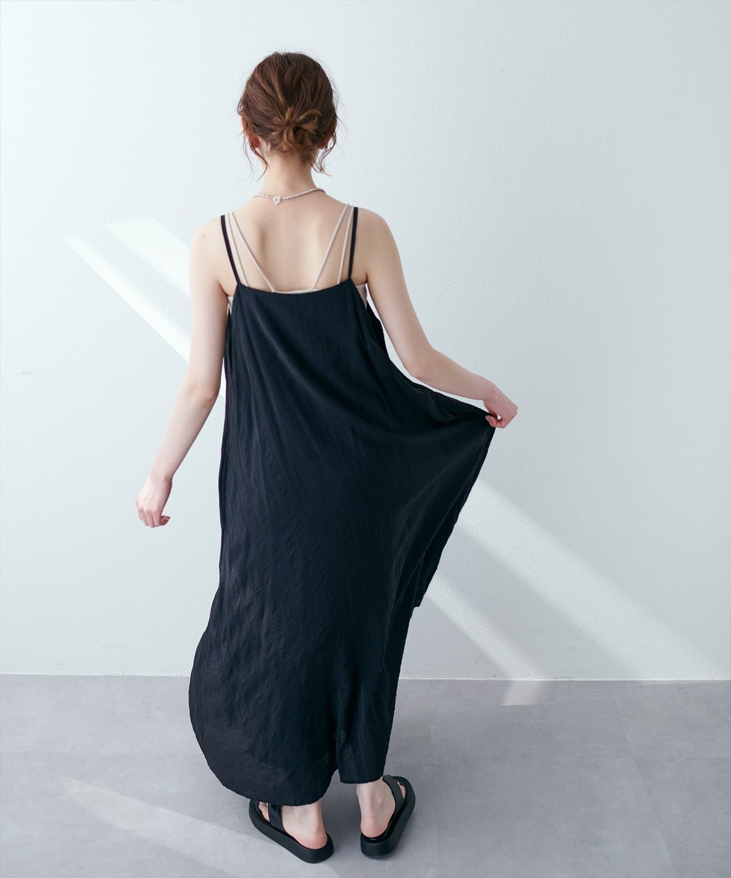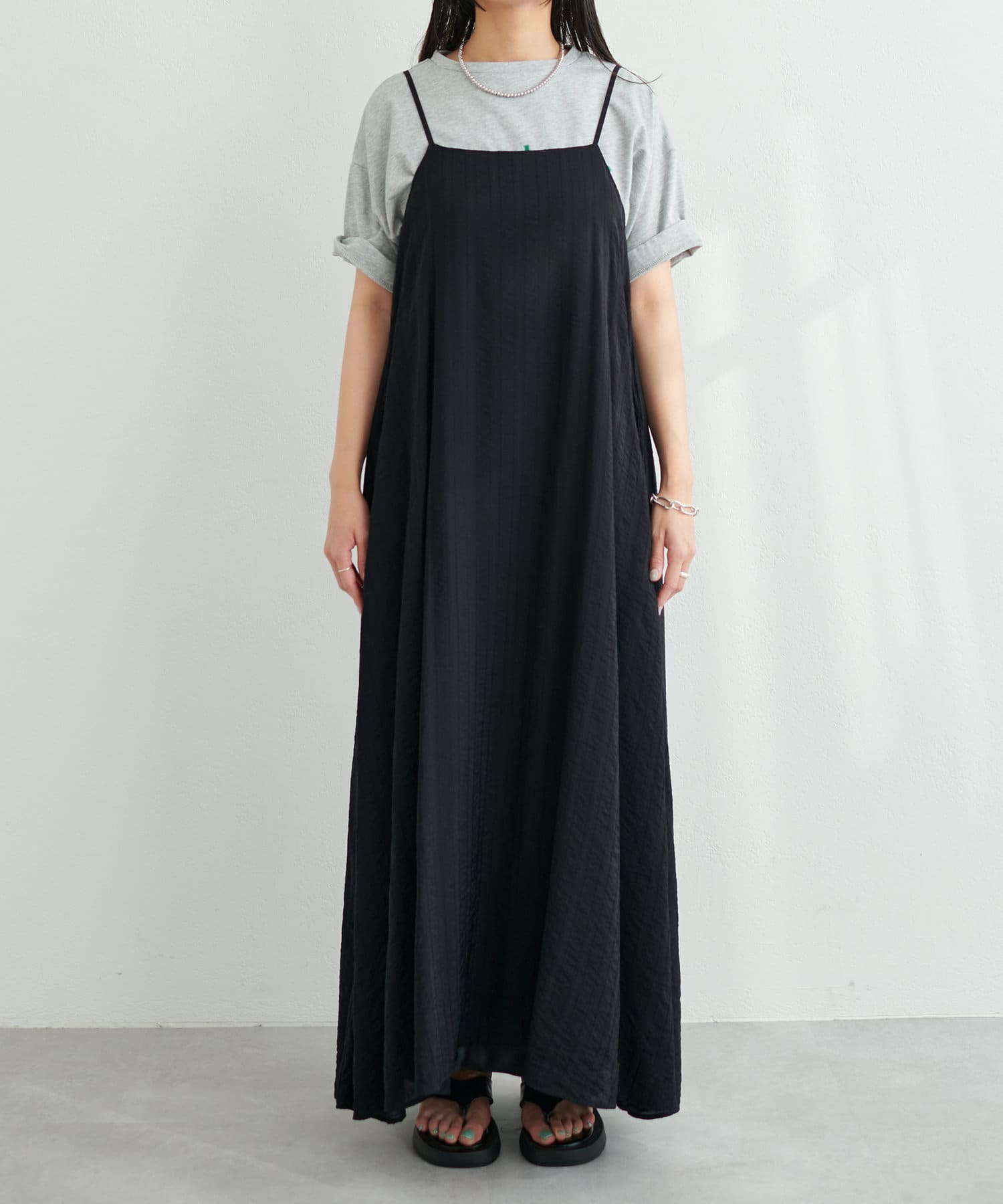 シンプルなキャミソールやタンクトップをインナーにして、シンプルに1枚でさらっとお召し頂き、