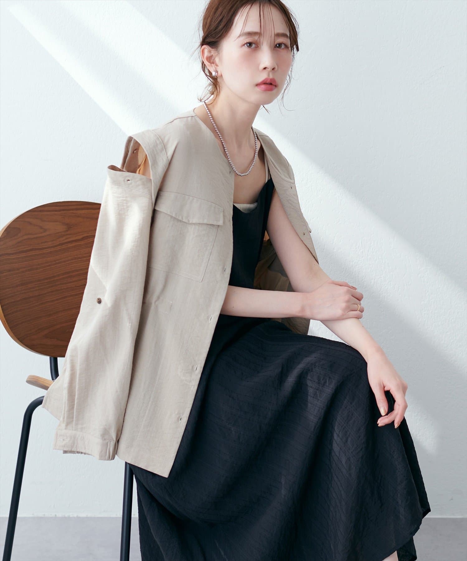 ジャケットやカーデを肩掛けで合わせるだけで、抜け感のあるリラックスなスタイリングに仕上がります。