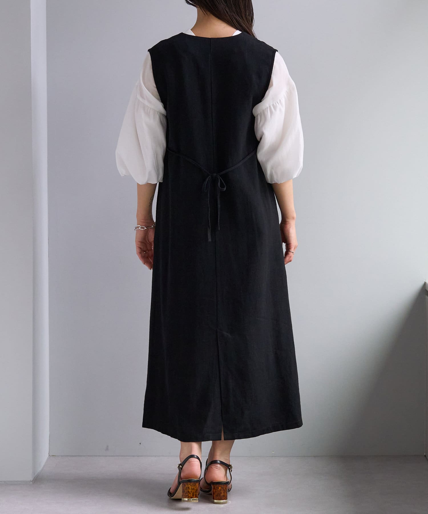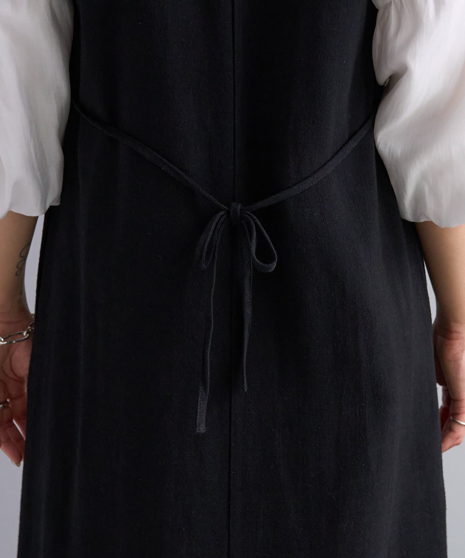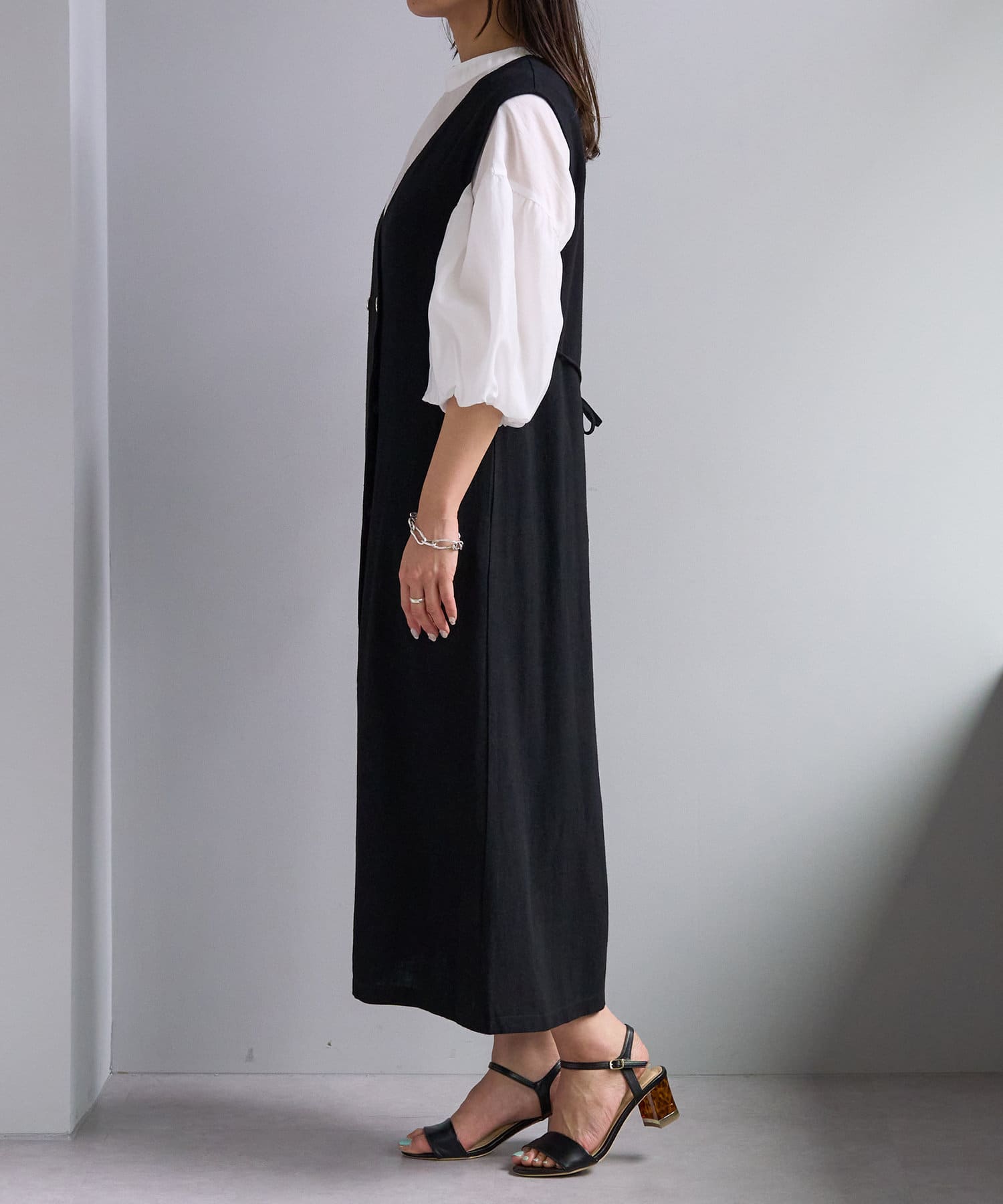 上からジレとしてレンヤードしたり、内側のスナップ釦を閉じればワンピースとしてもお召し頂けます。