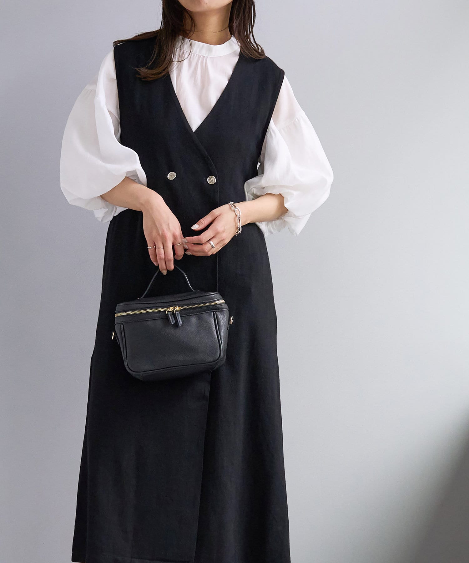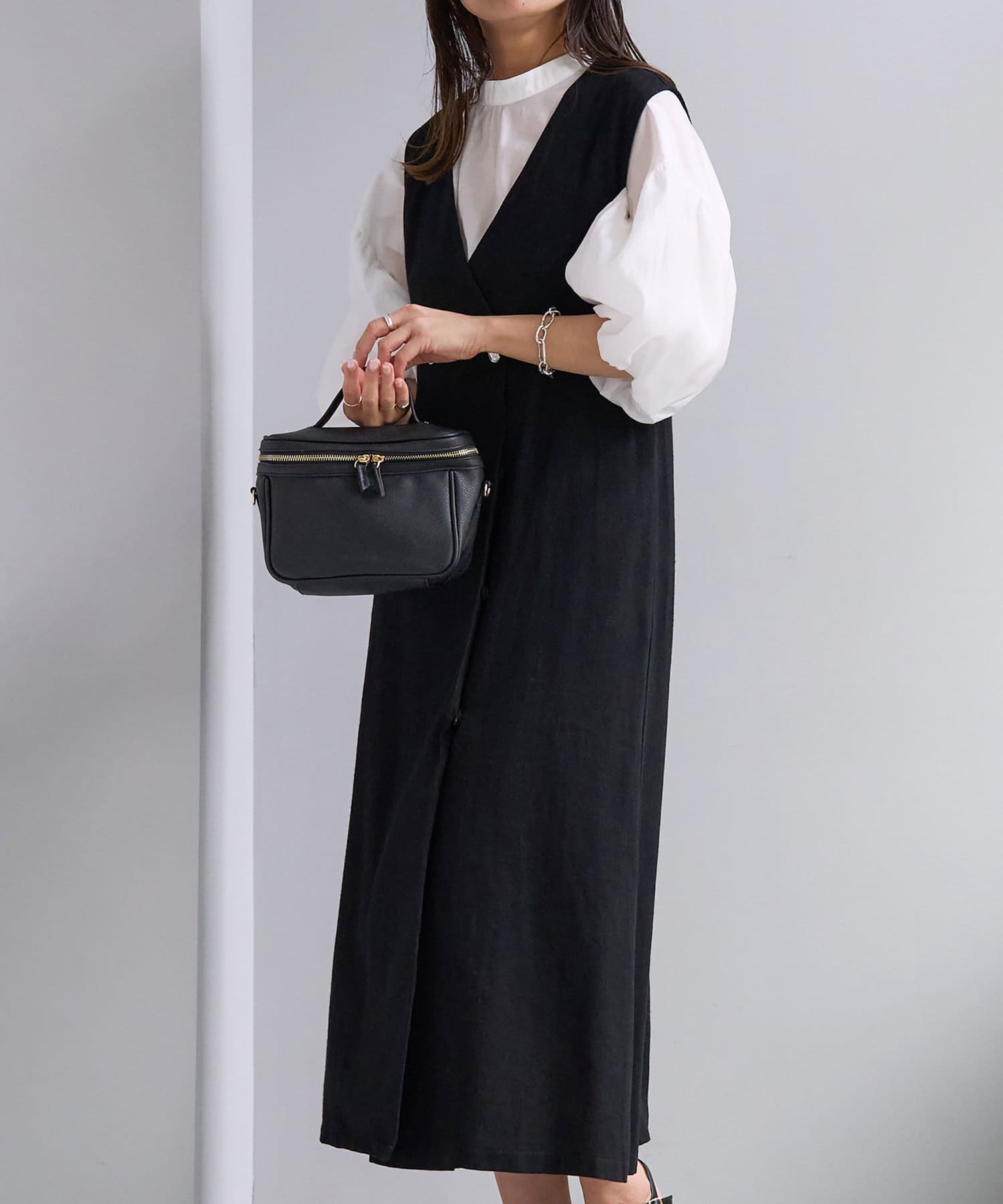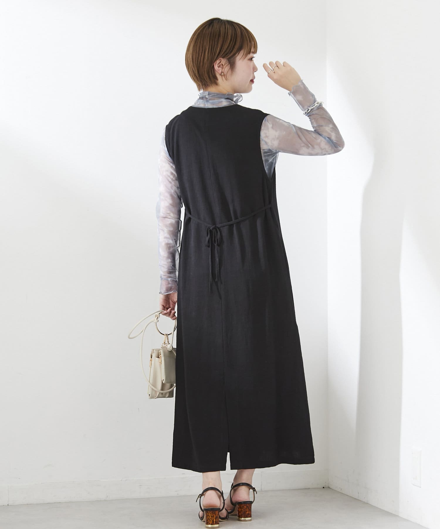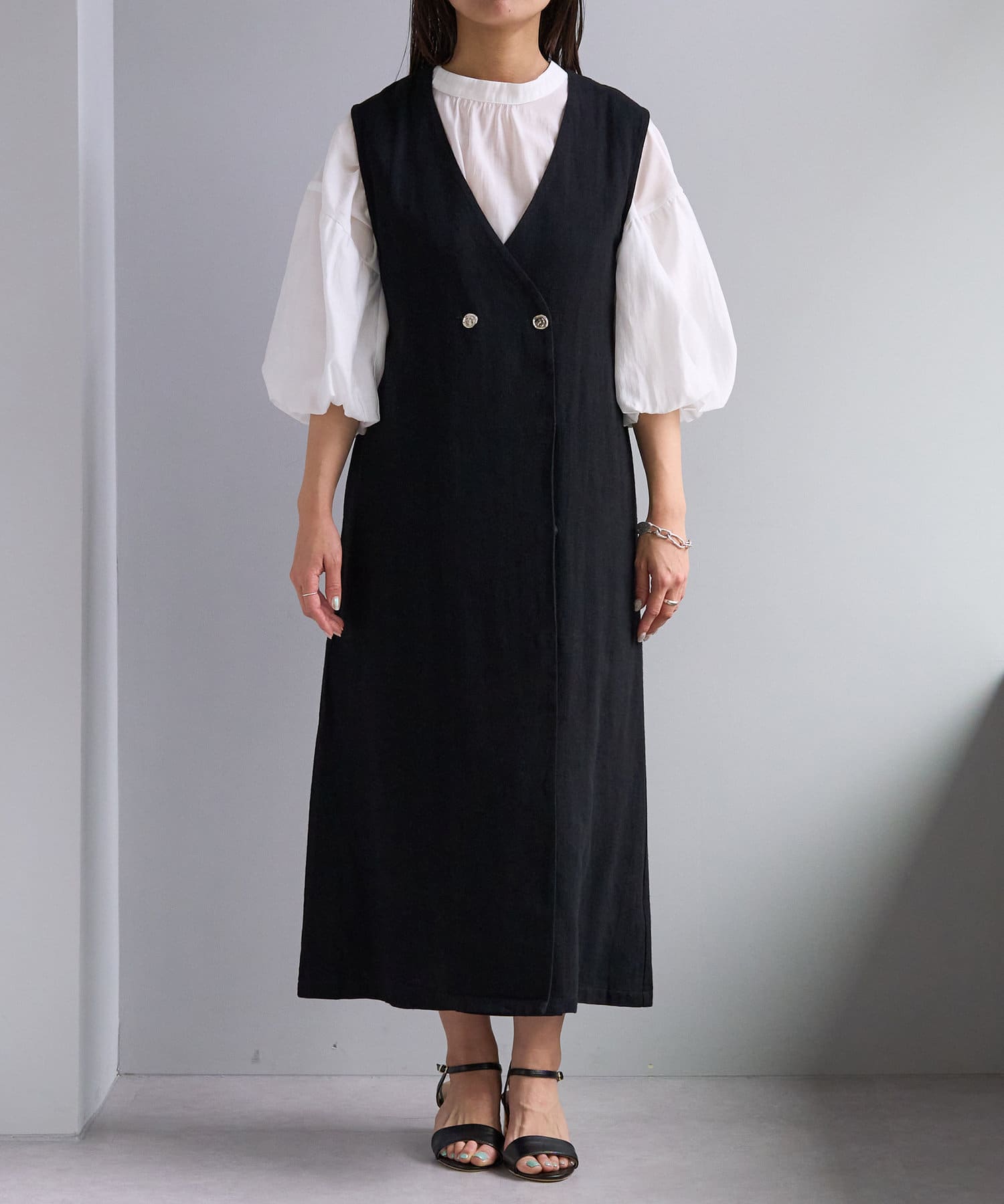 上からジレとしてレンヤードしたり、内側のスナップ釦を閉じればワンピースとしてもお召し頂けます。