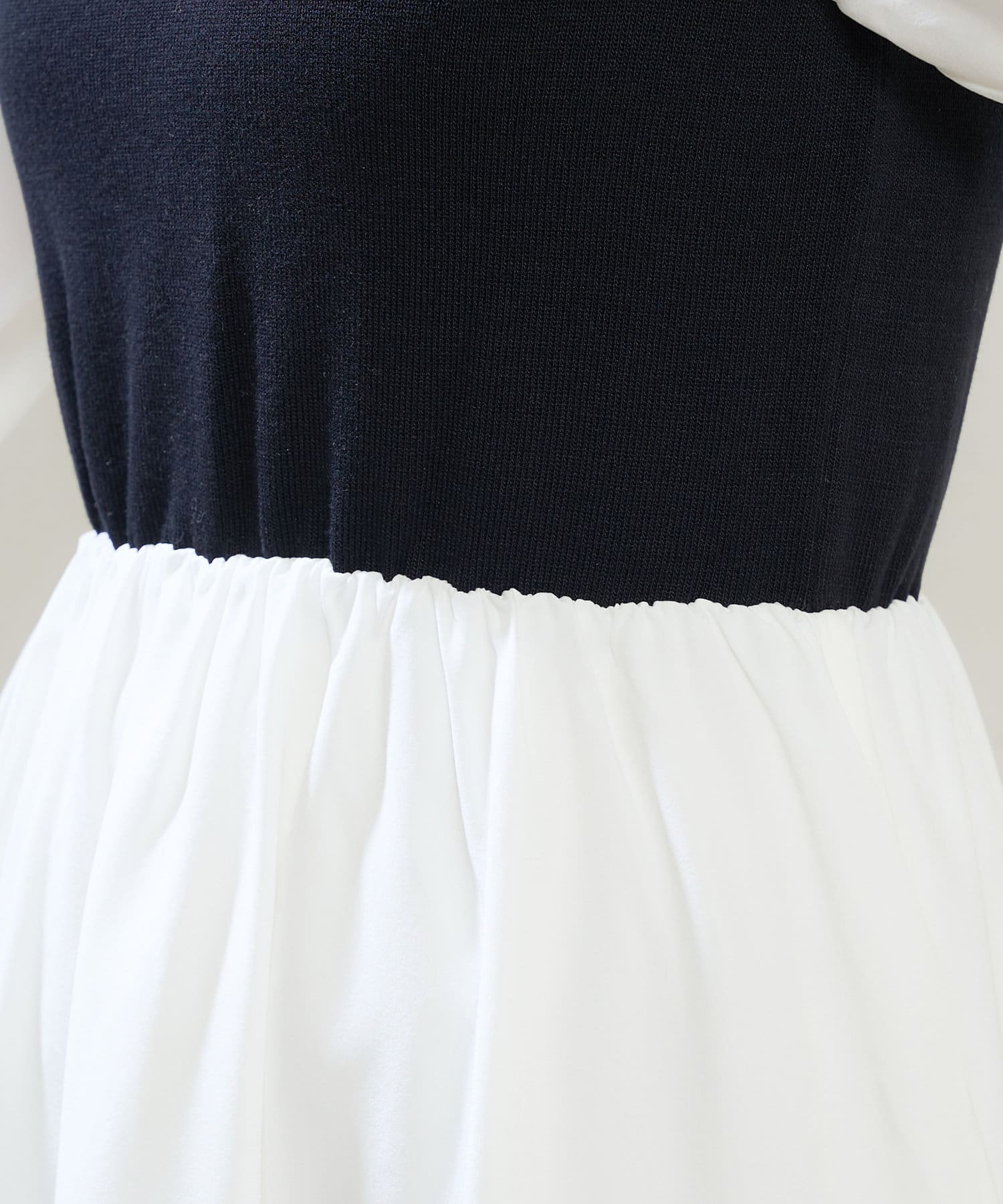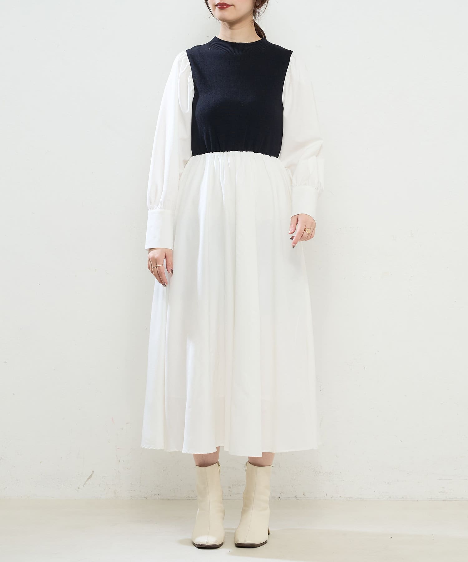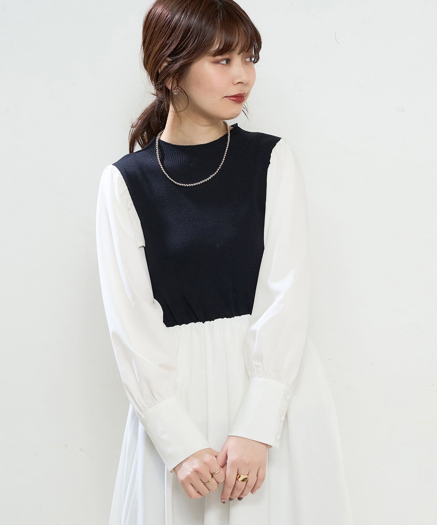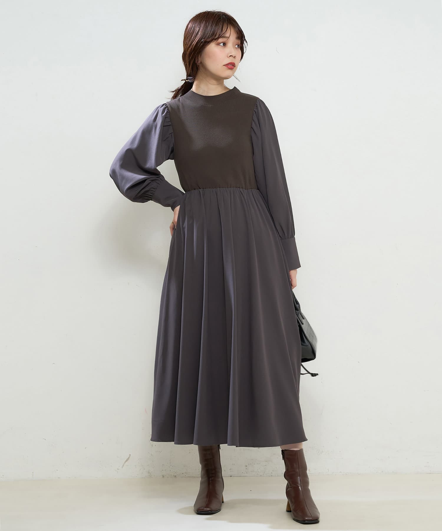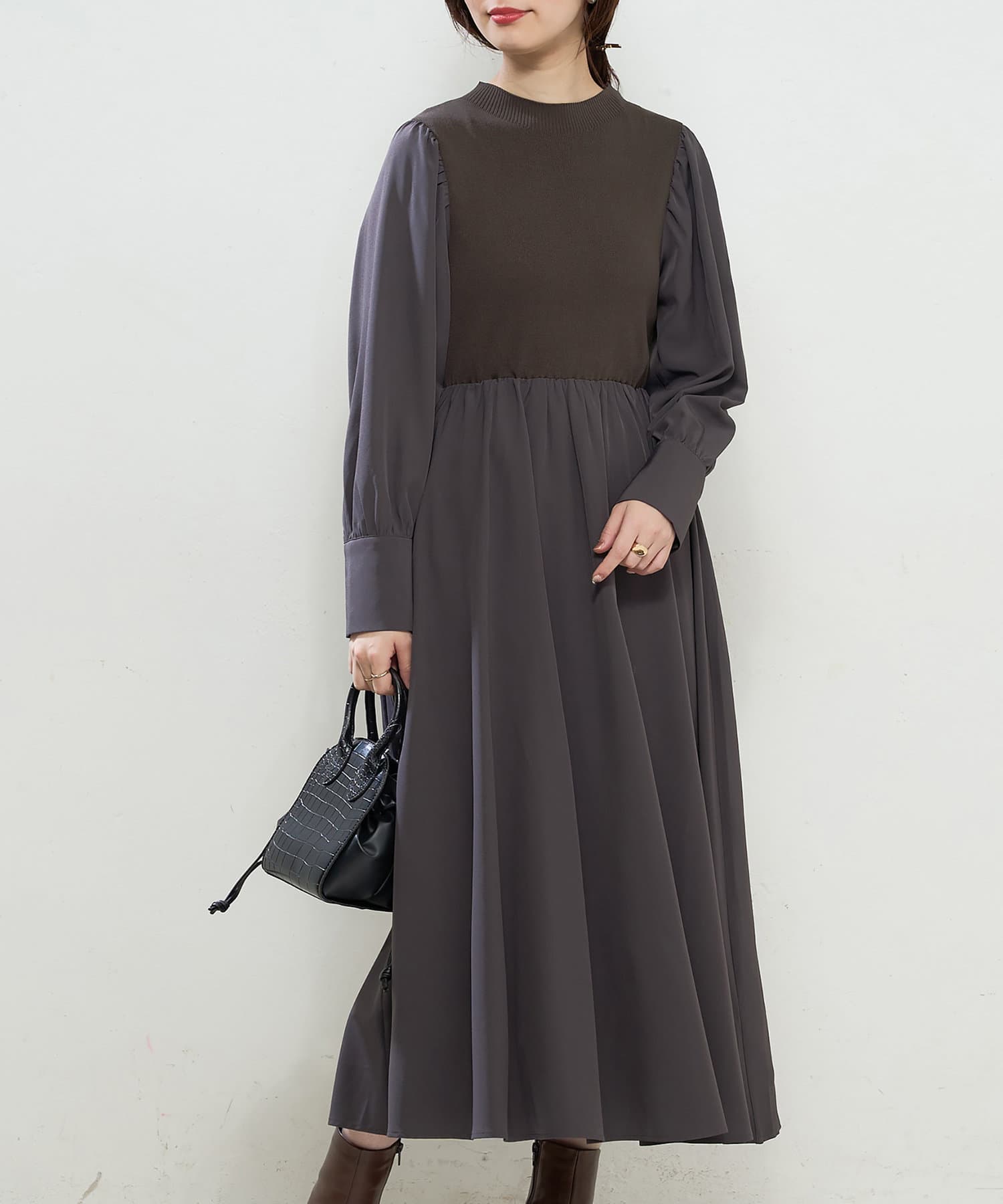 華奢見えが叶うニット×布帛のふんわりワンピ
