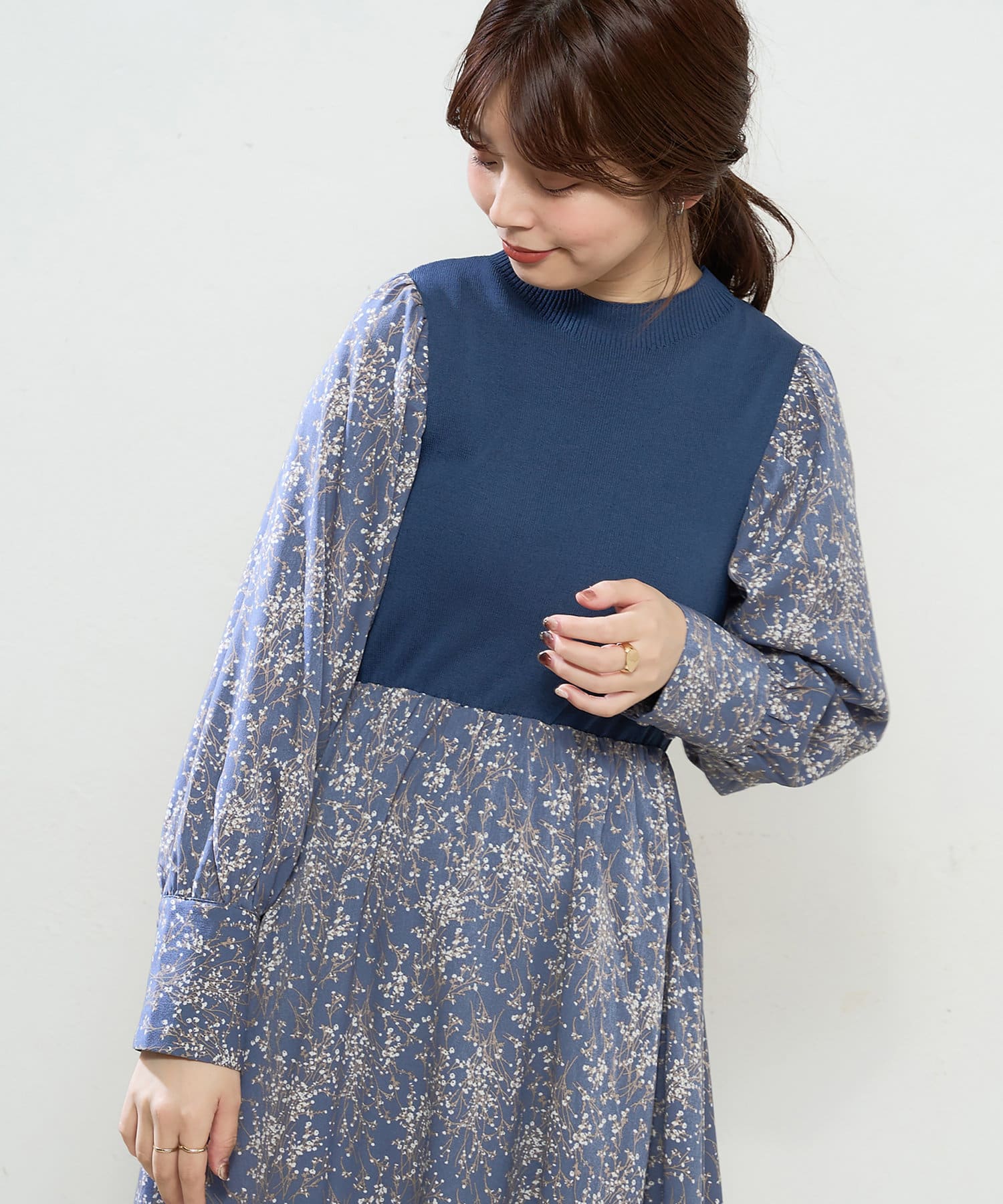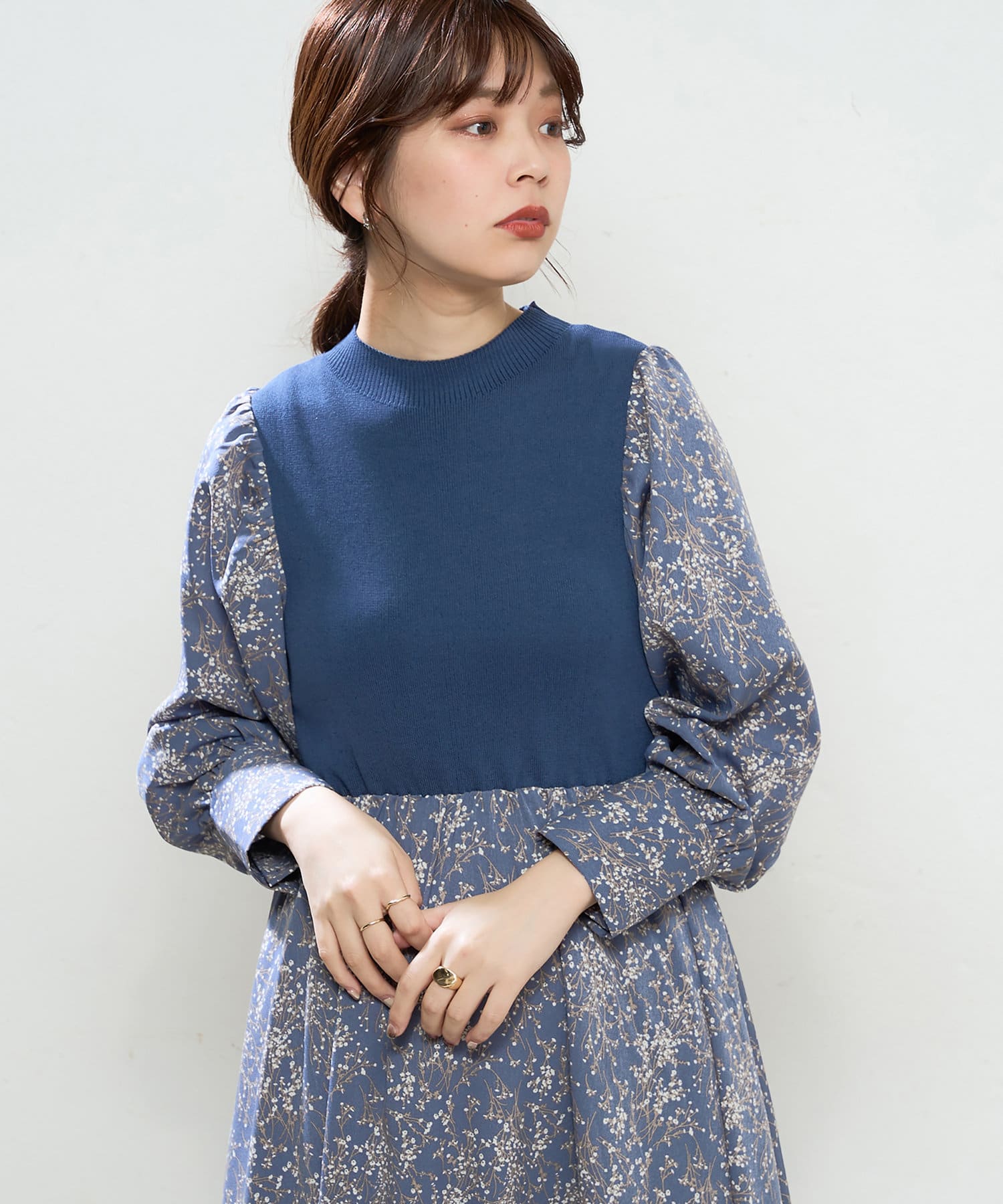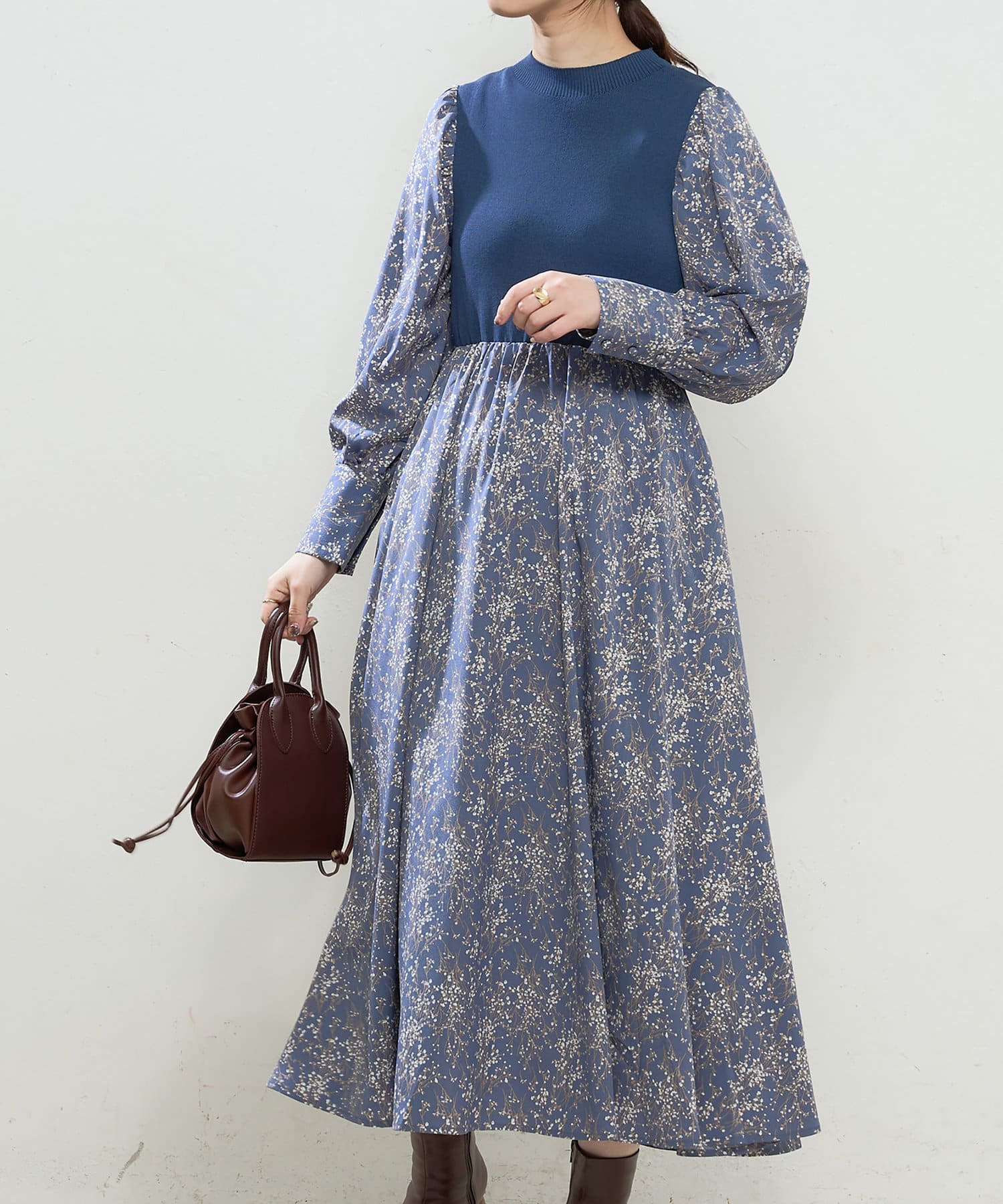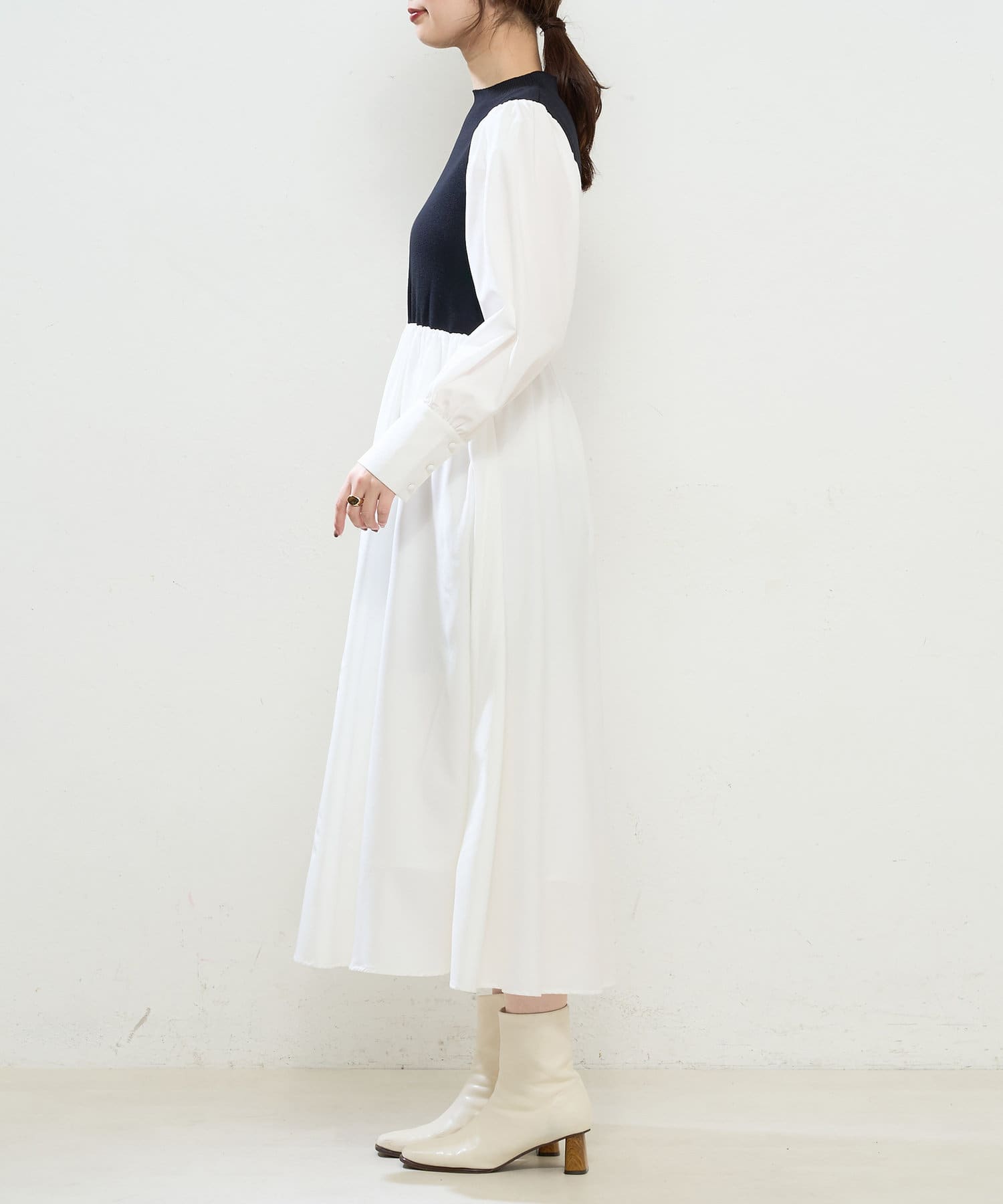 華奢見えが叶うニット×布帛のふんわりワンピ