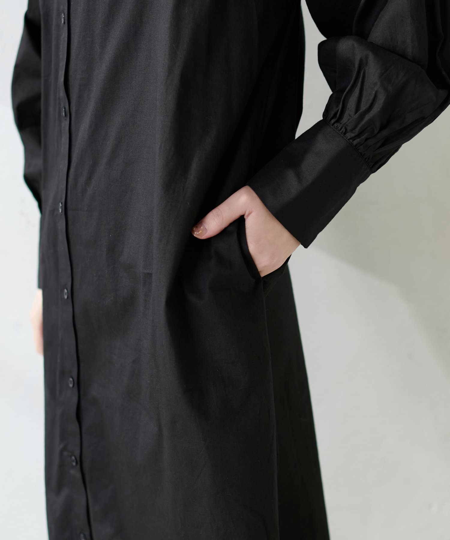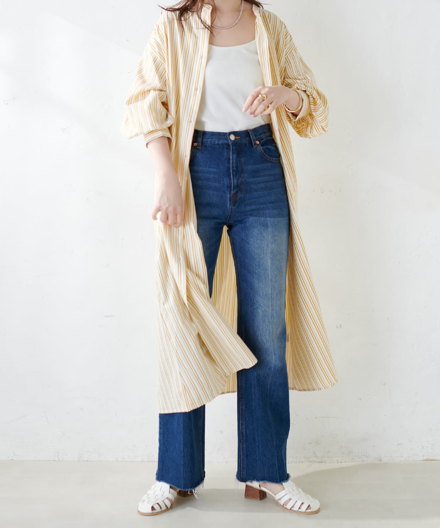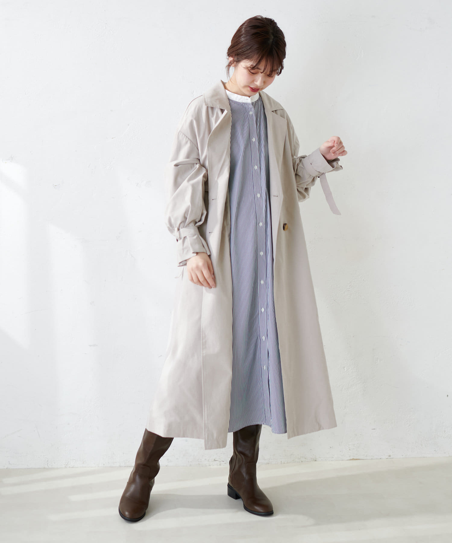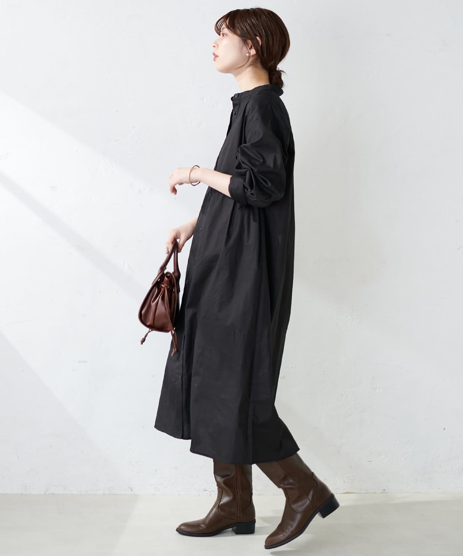 広がりすぎずストンとしたシンプルなシルエットで、ワンピースでも羽織としても重宝する定番シャツワンピース。