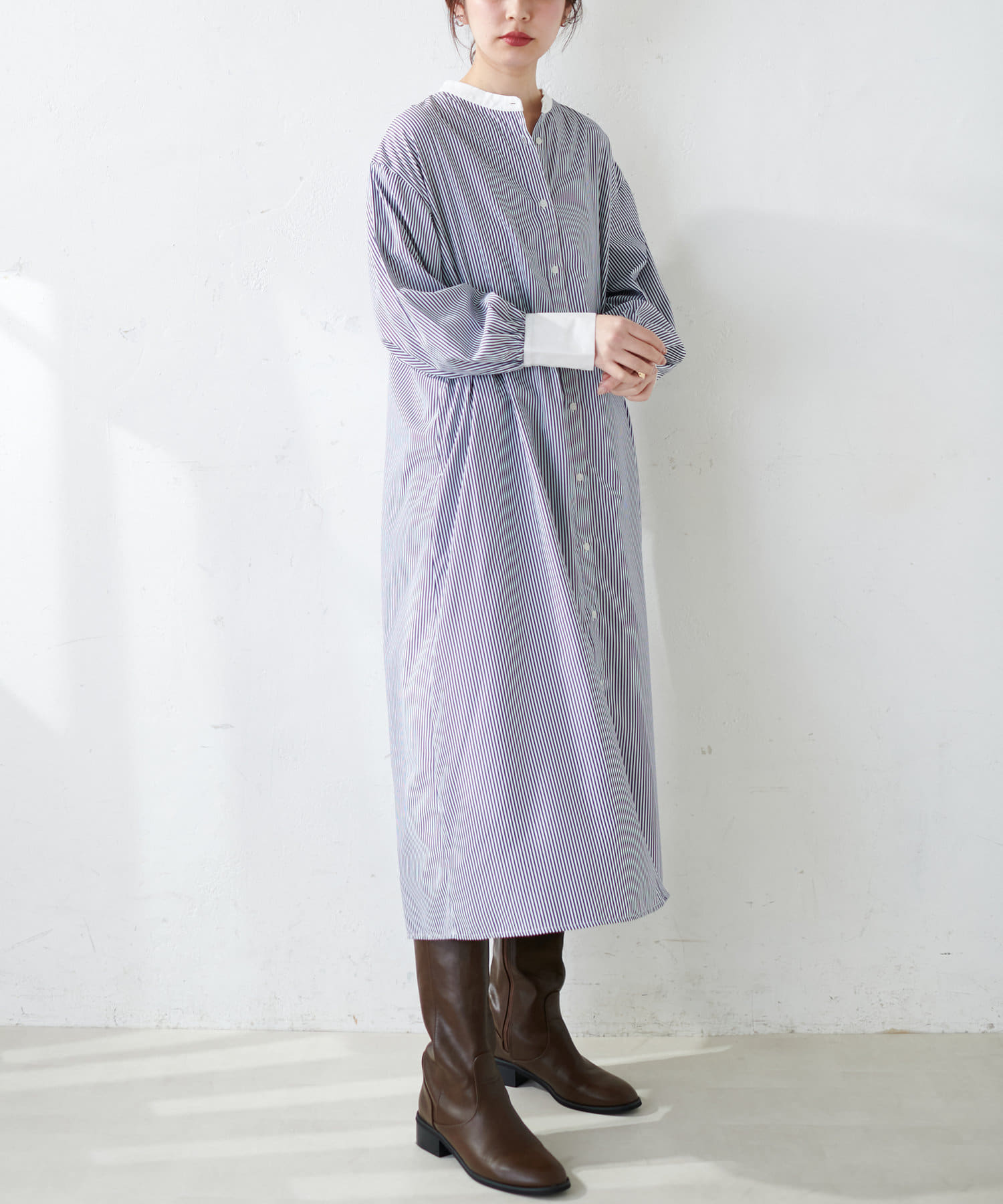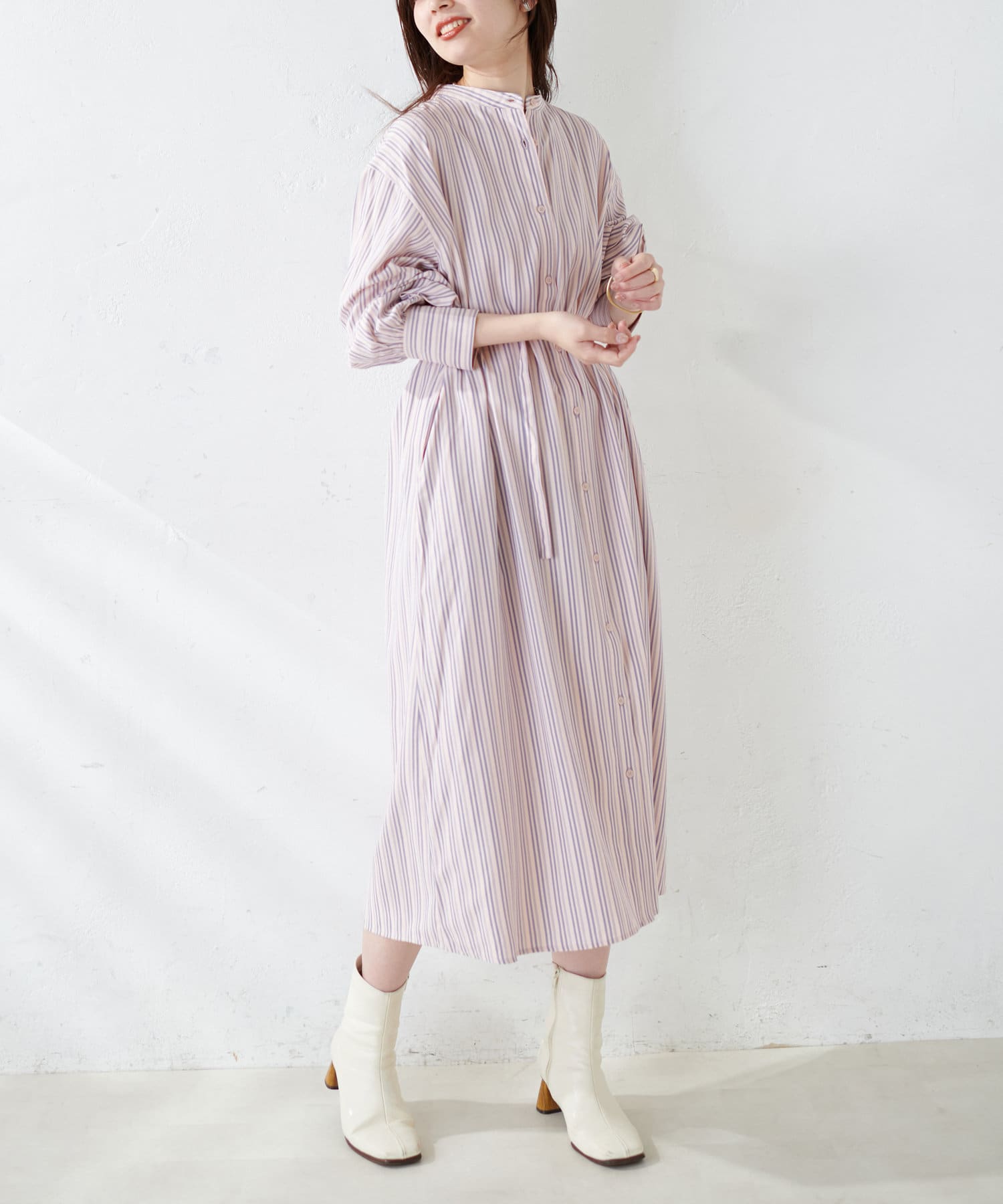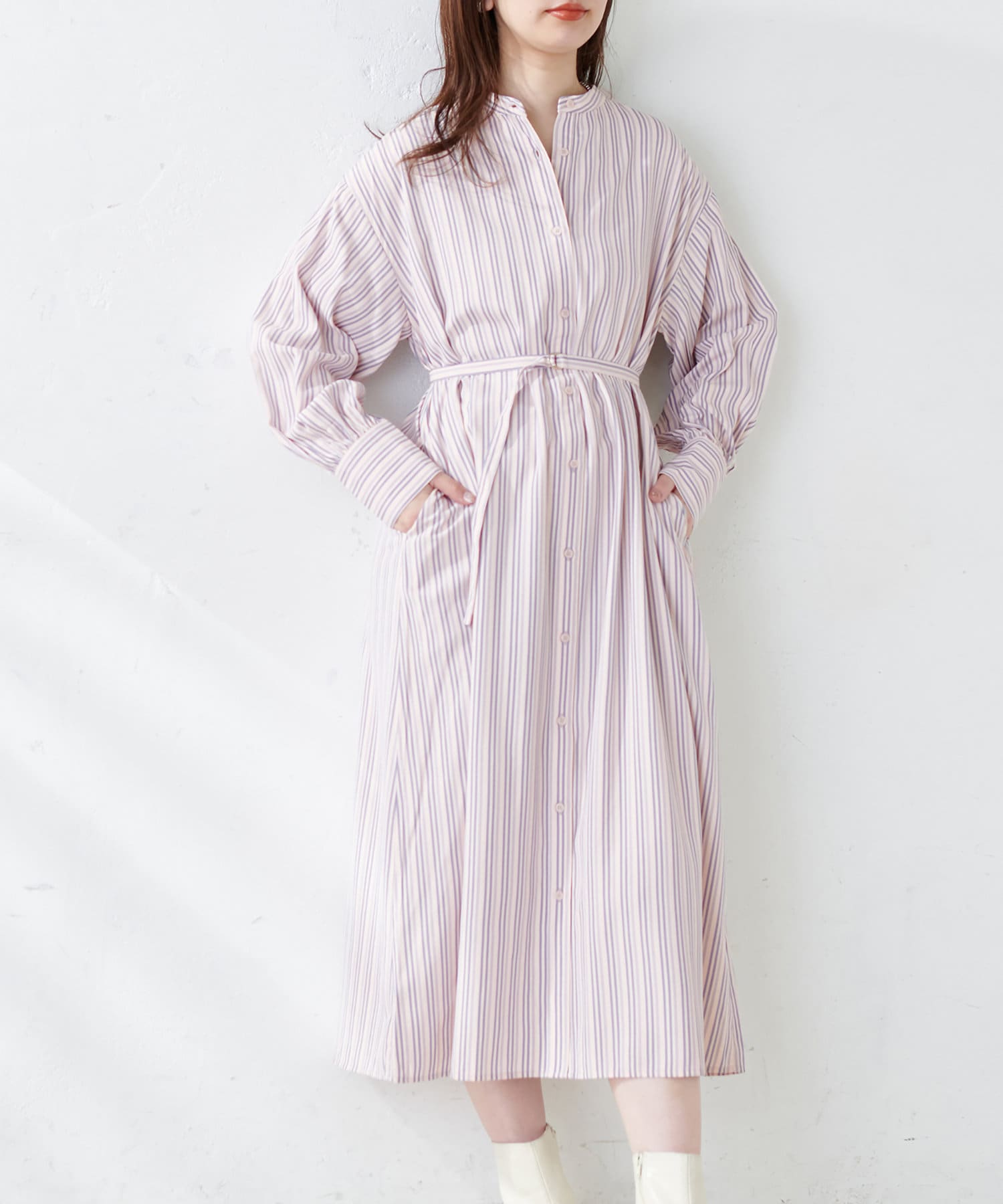細ベルト付きバンドカラーシャツワンピース