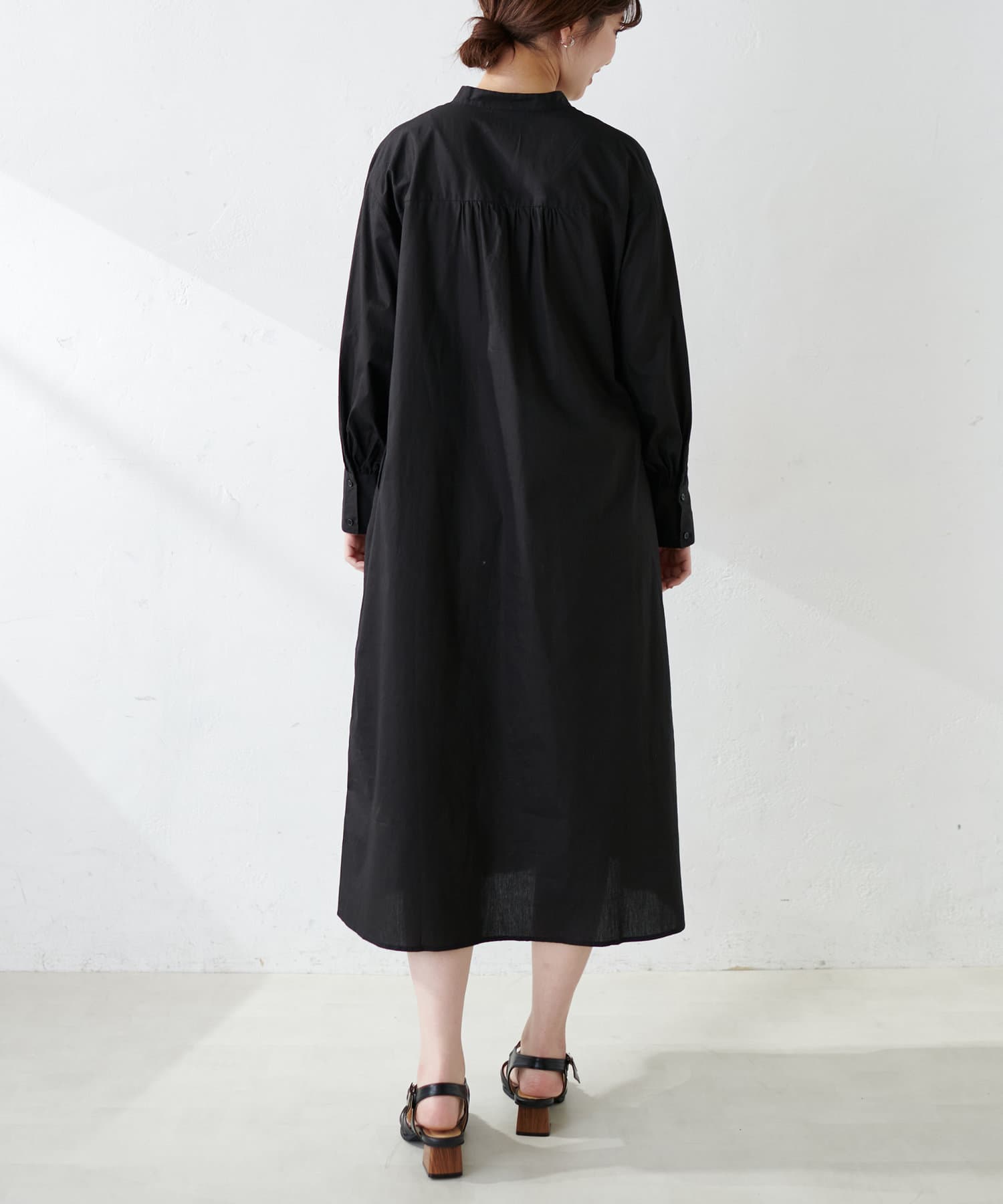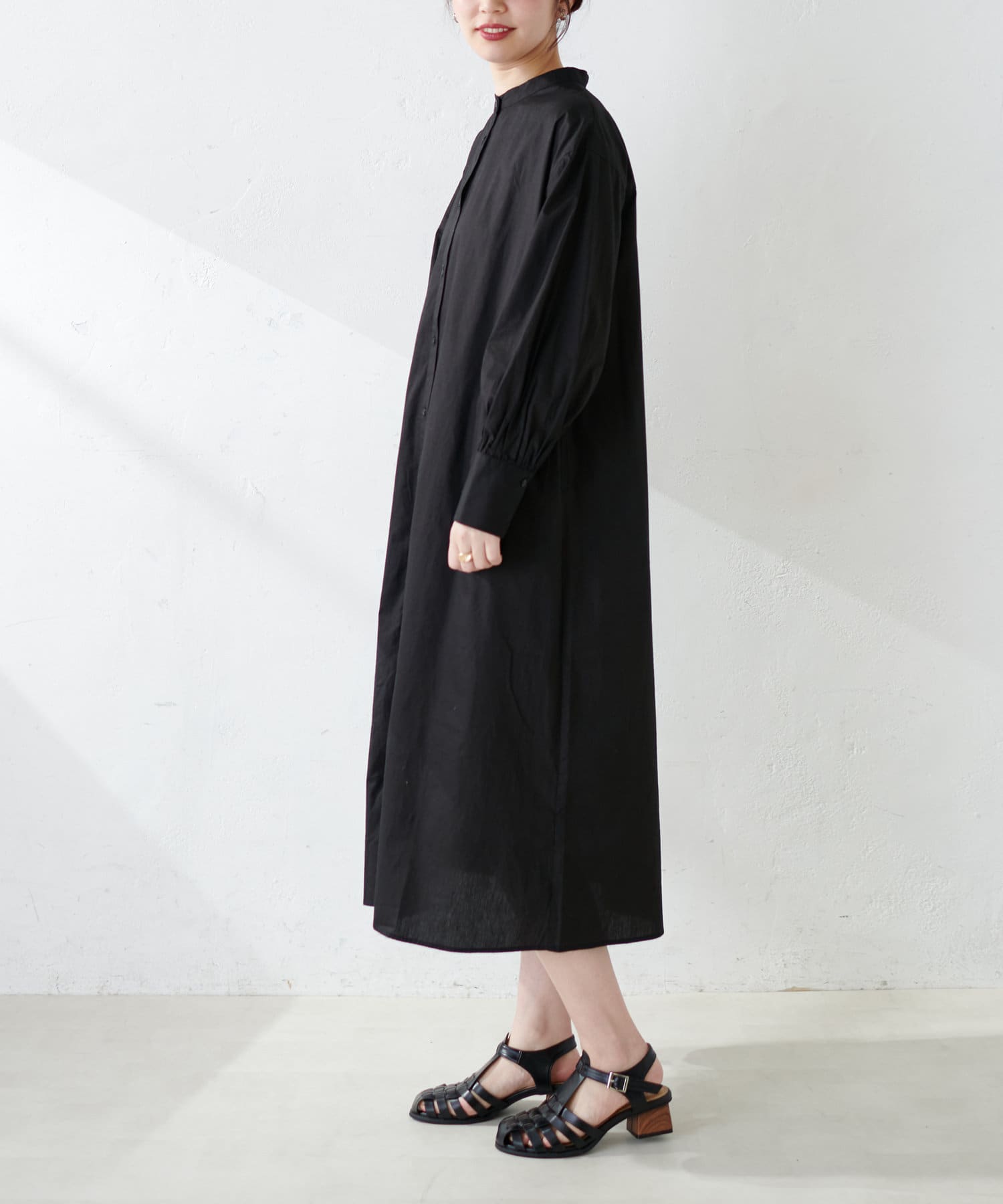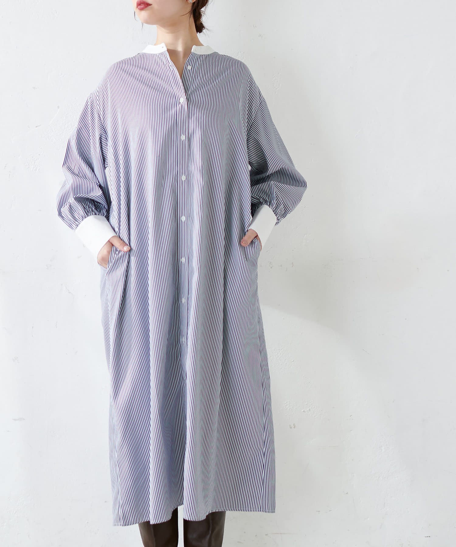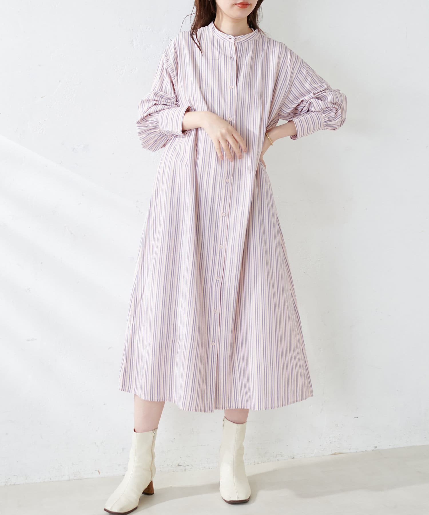 細ベルト付きバンドカラーシャツワンピース