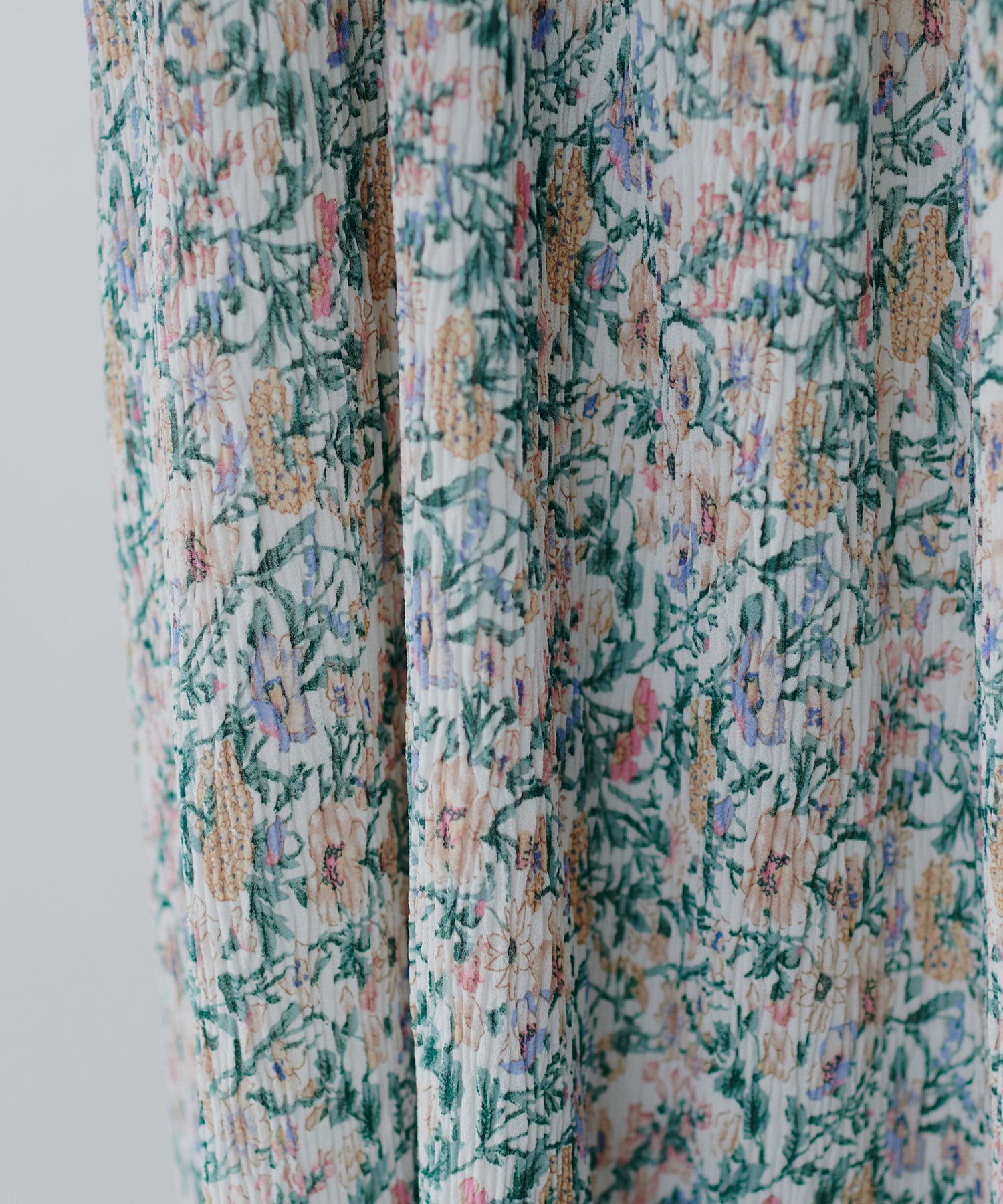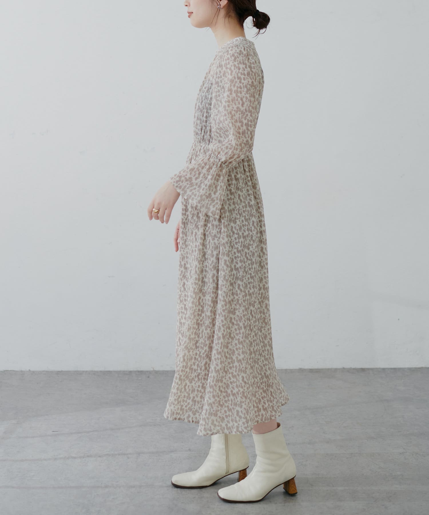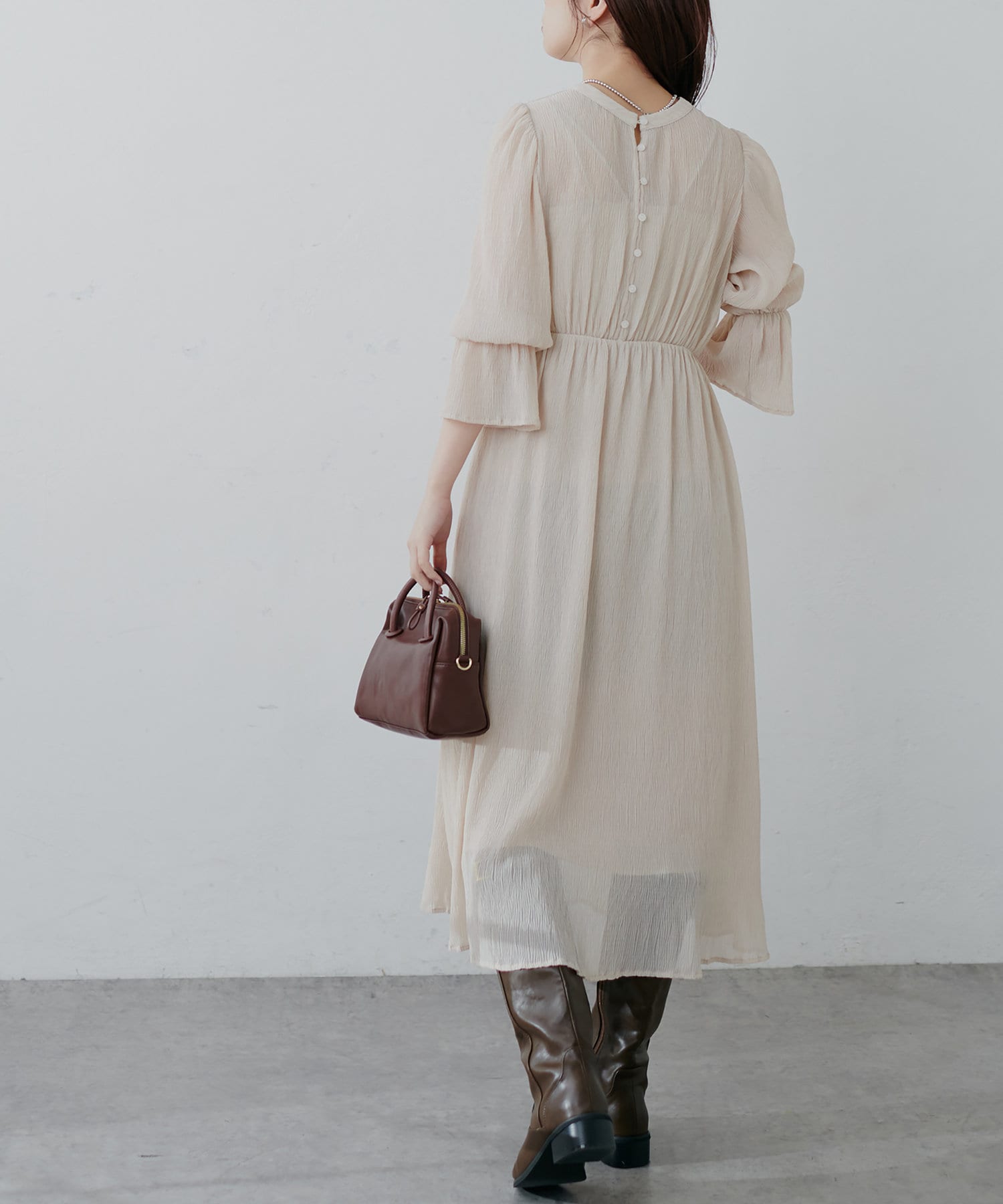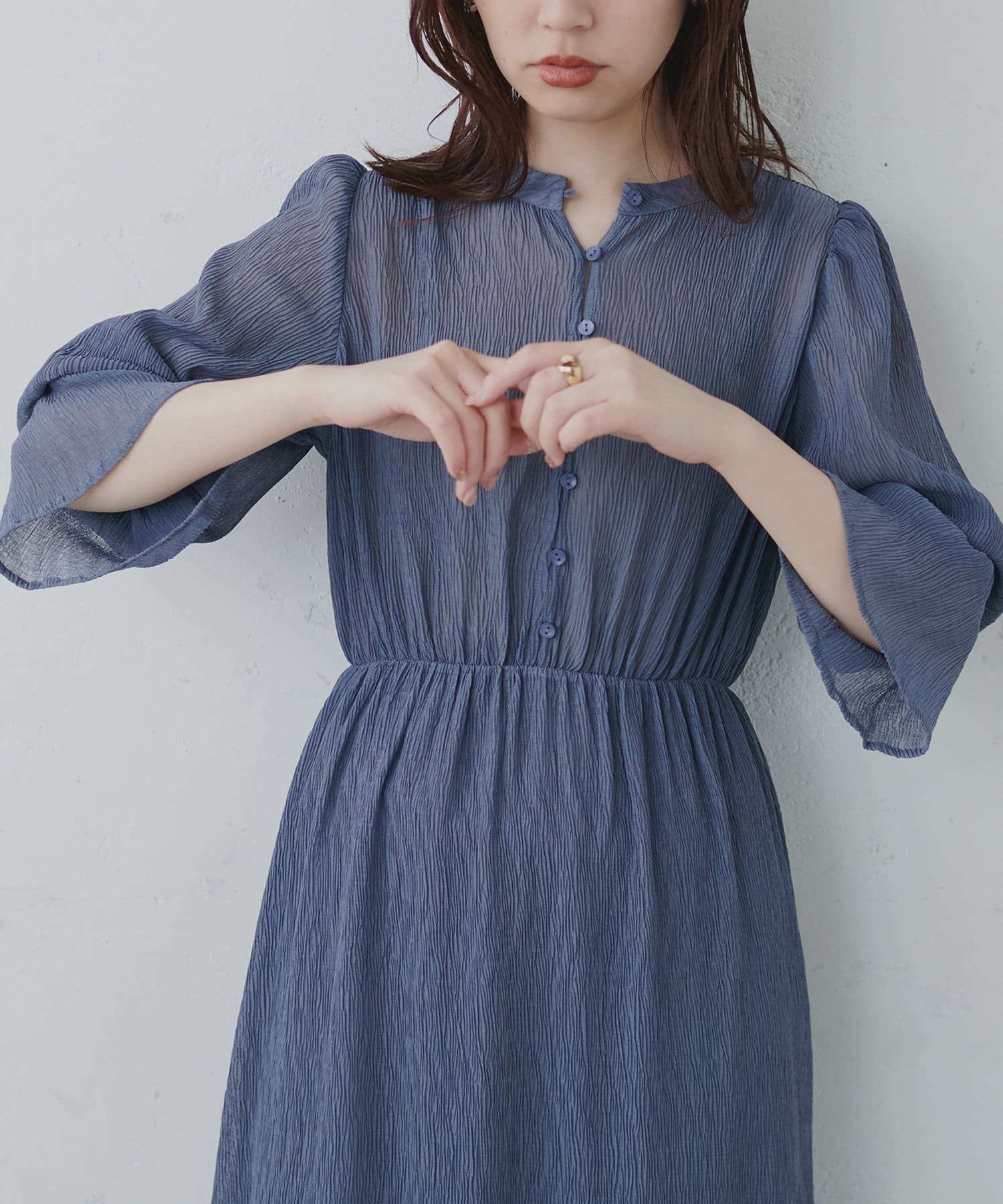ほんのりシアー感と繊細なプリーツ使いが、動くたびに柔らかい揺れ感を生み、