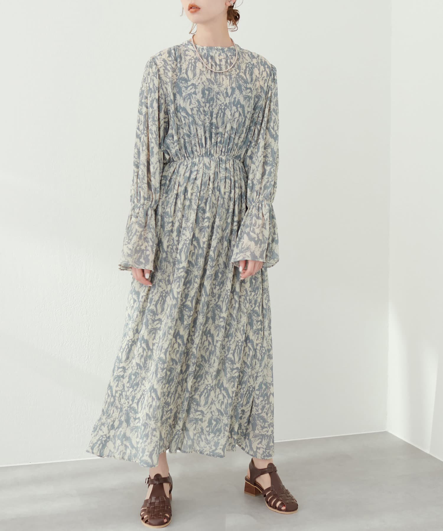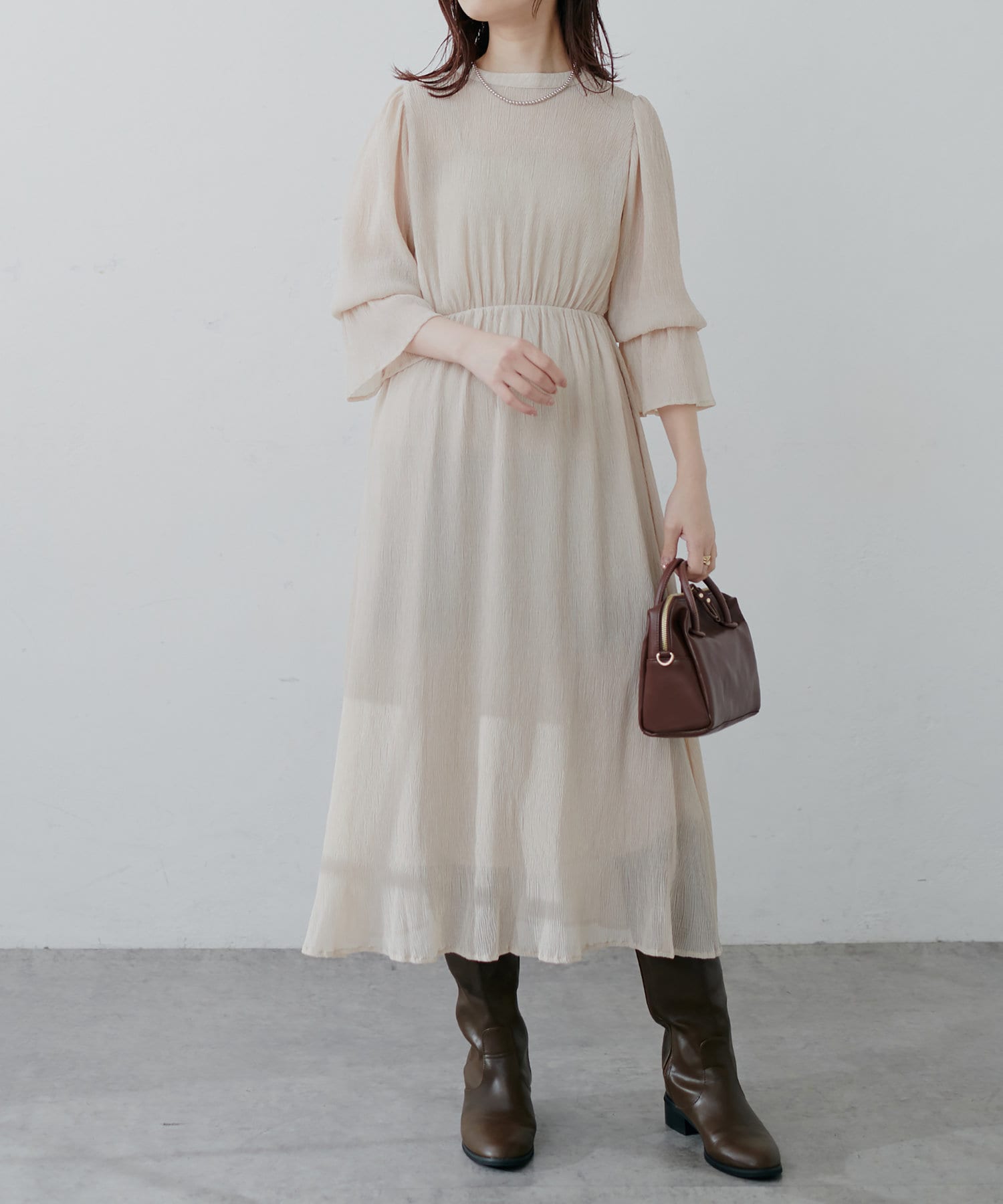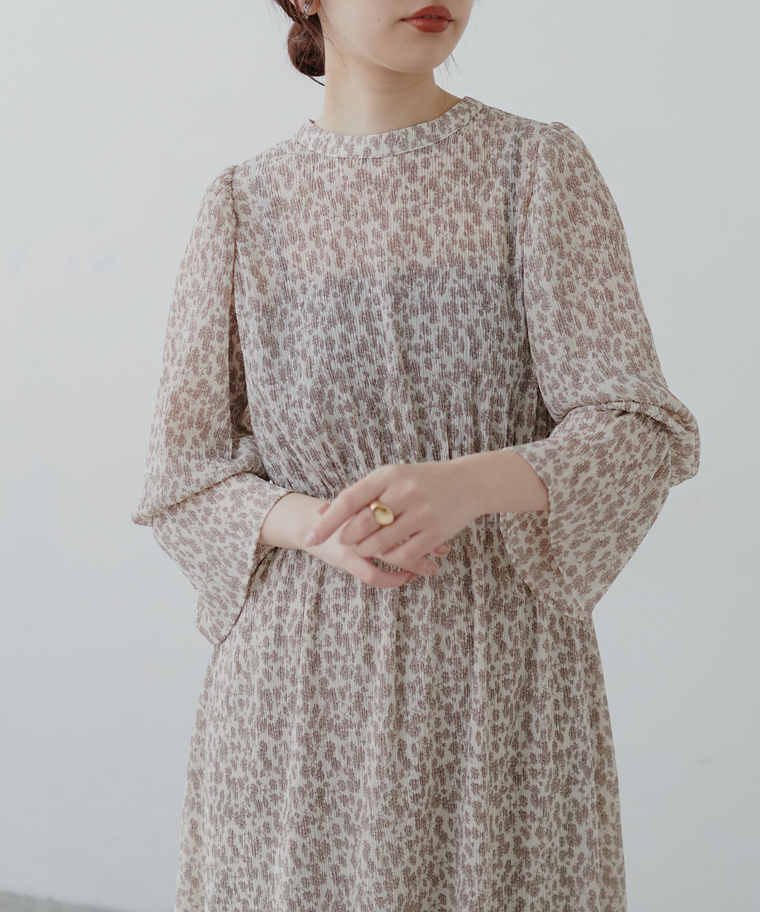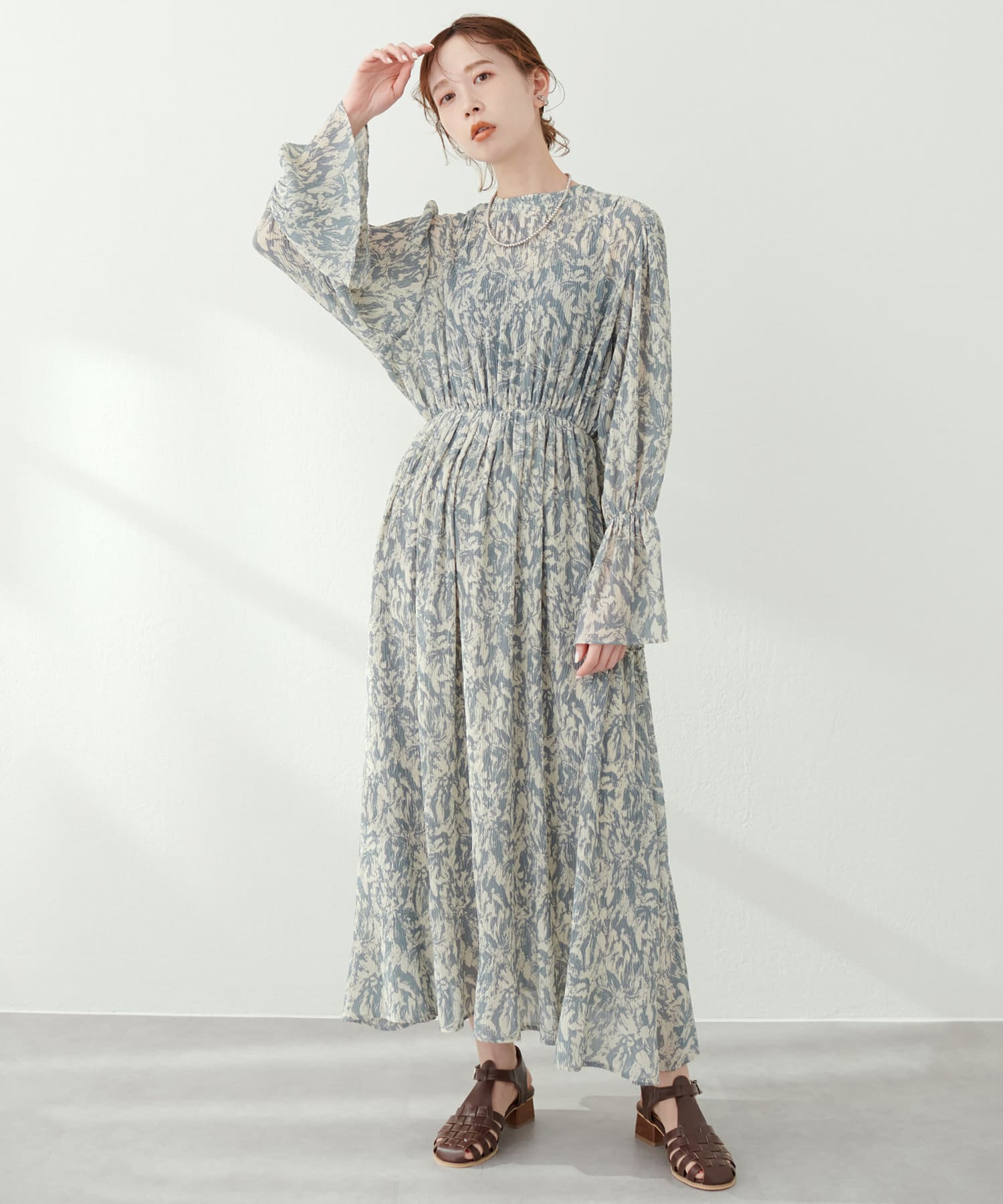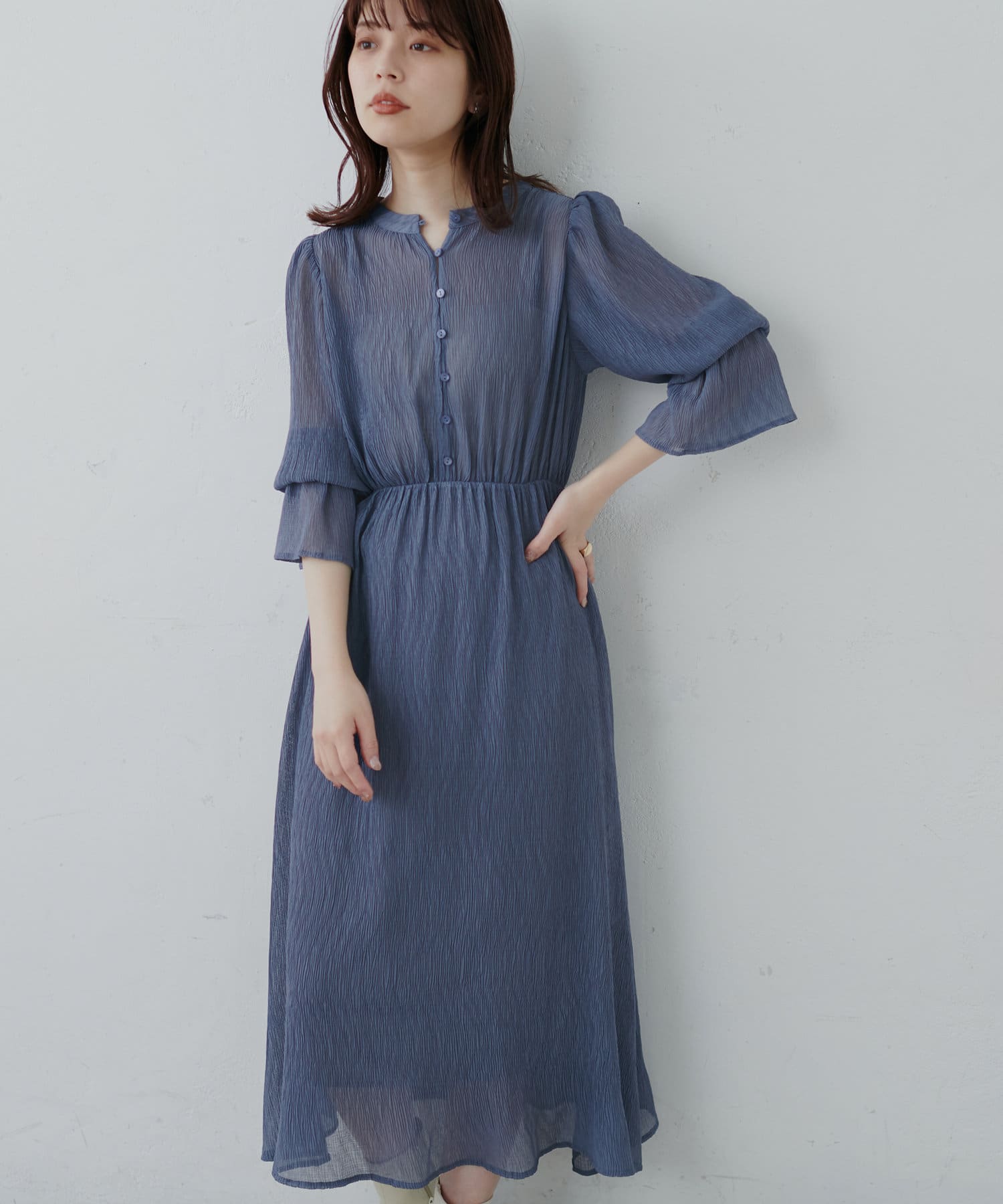 ほんのりシアー感と繊細なプリーツ使いが、動くたびに柔らかい揺れ感を生み、
