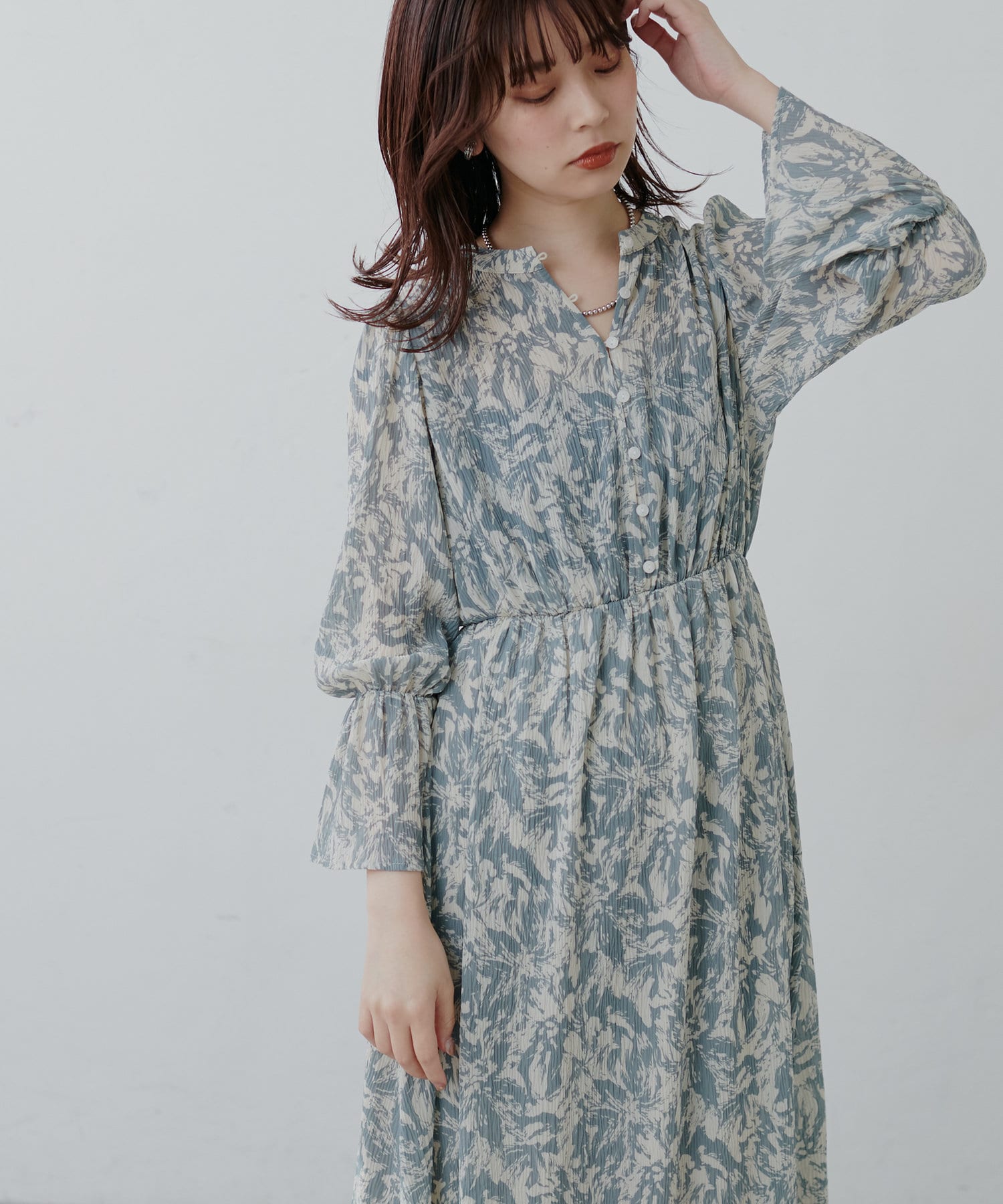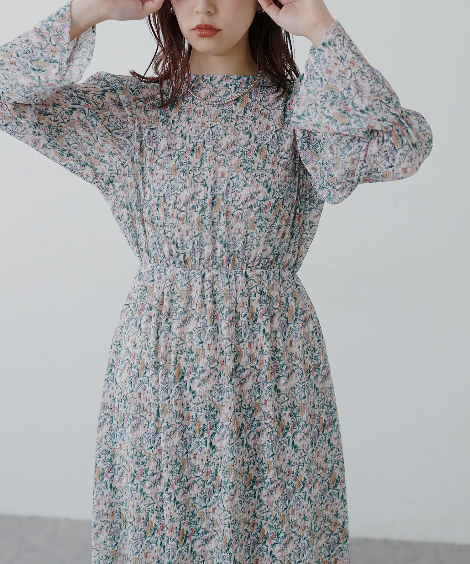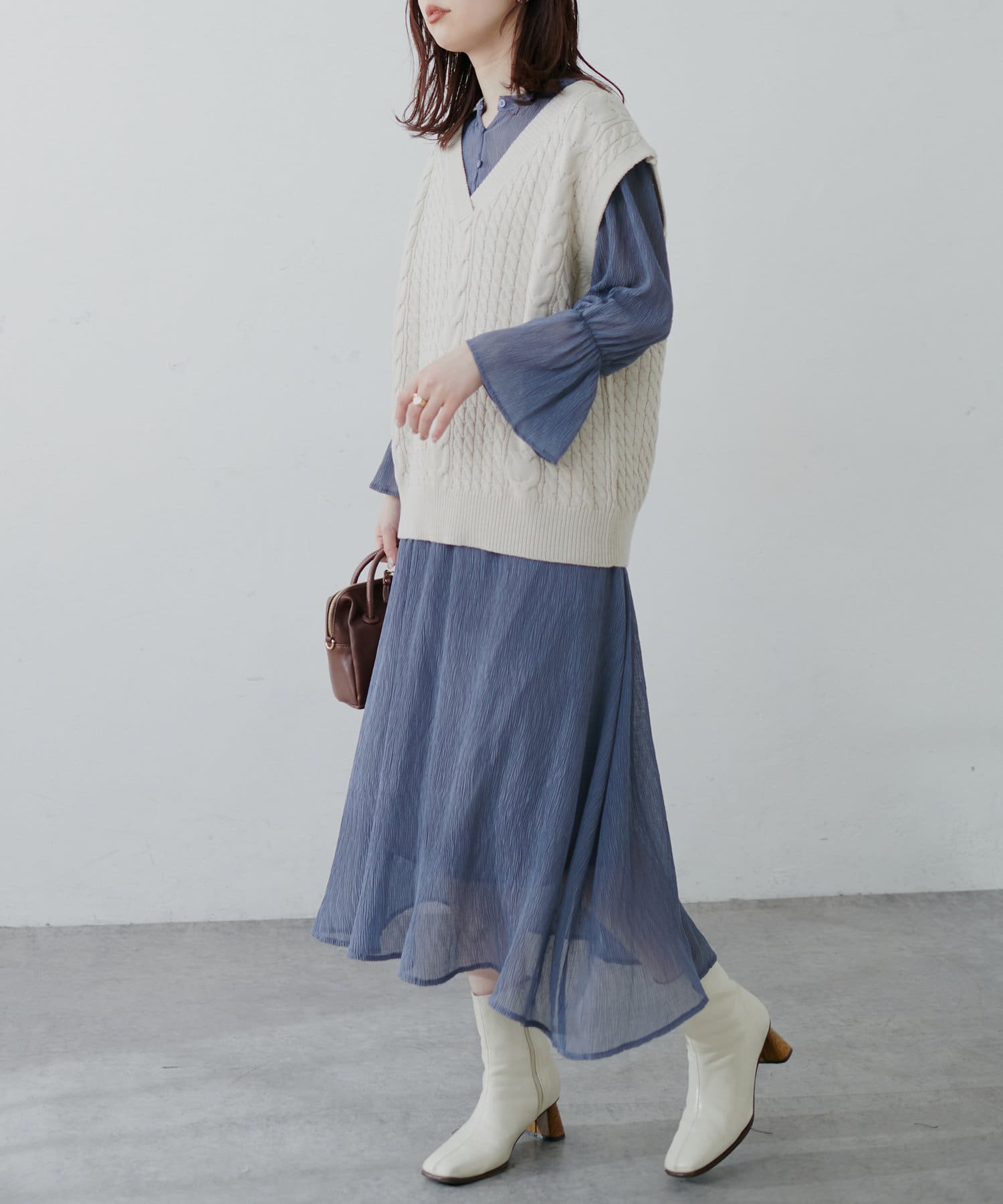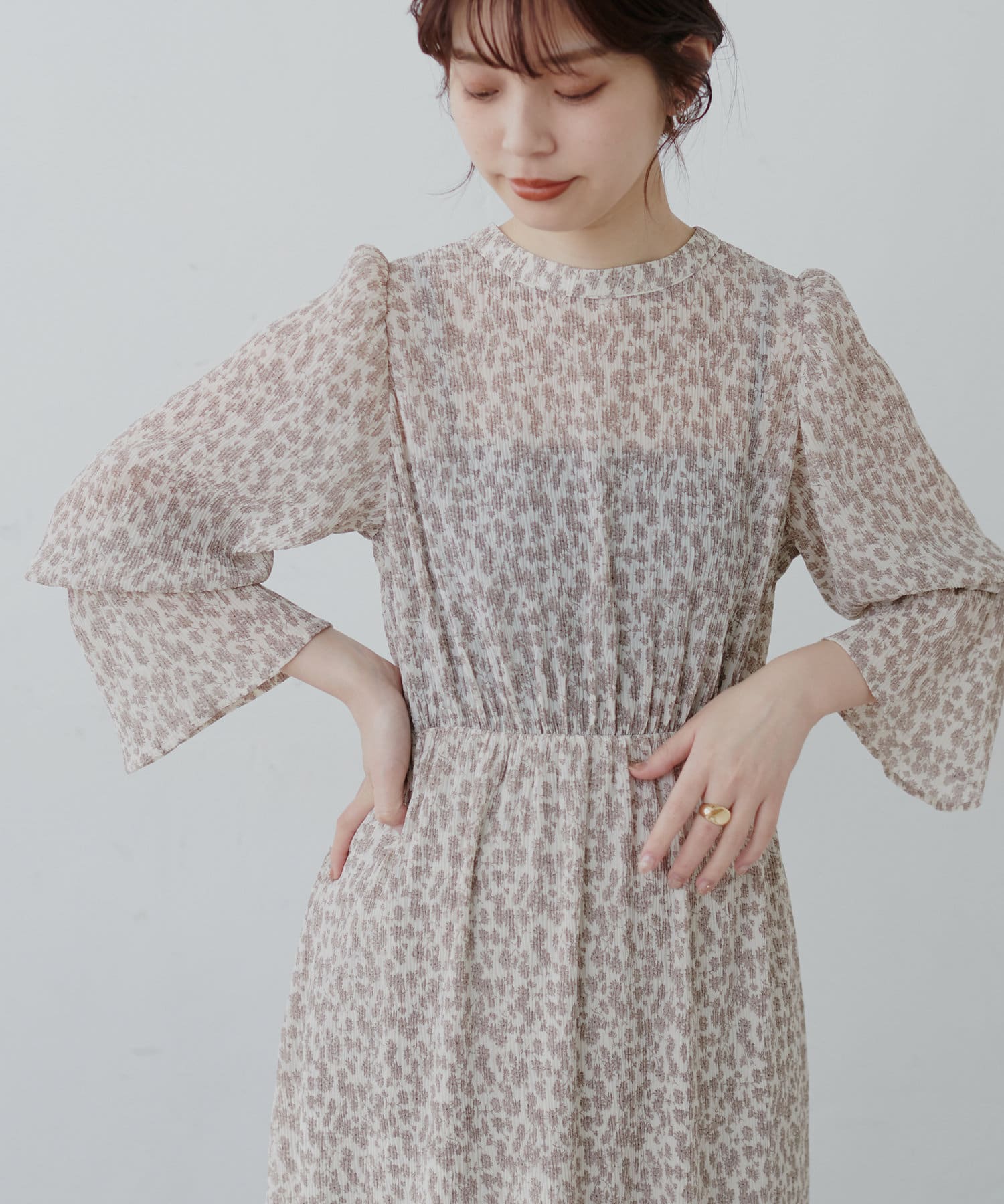 ほんのりシアー感と繊細なプリーツ使いが、動くたびに柔らかい揺れ感を生み、