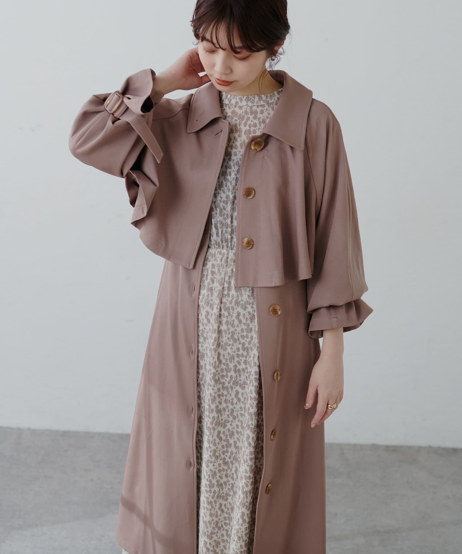フロントにさりげなく施したクリアな質感の釦使いで、上品な印象に仕上げました。