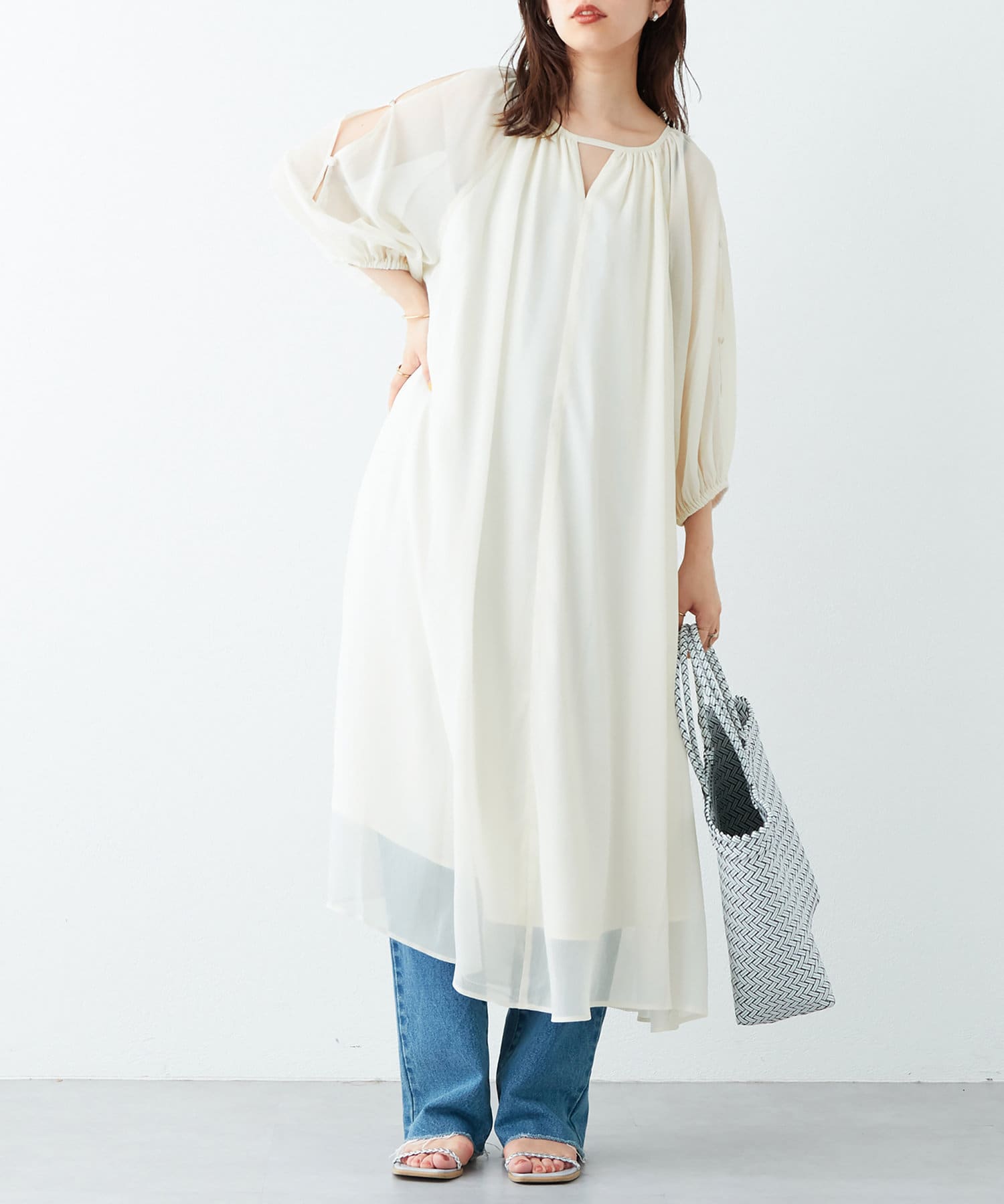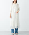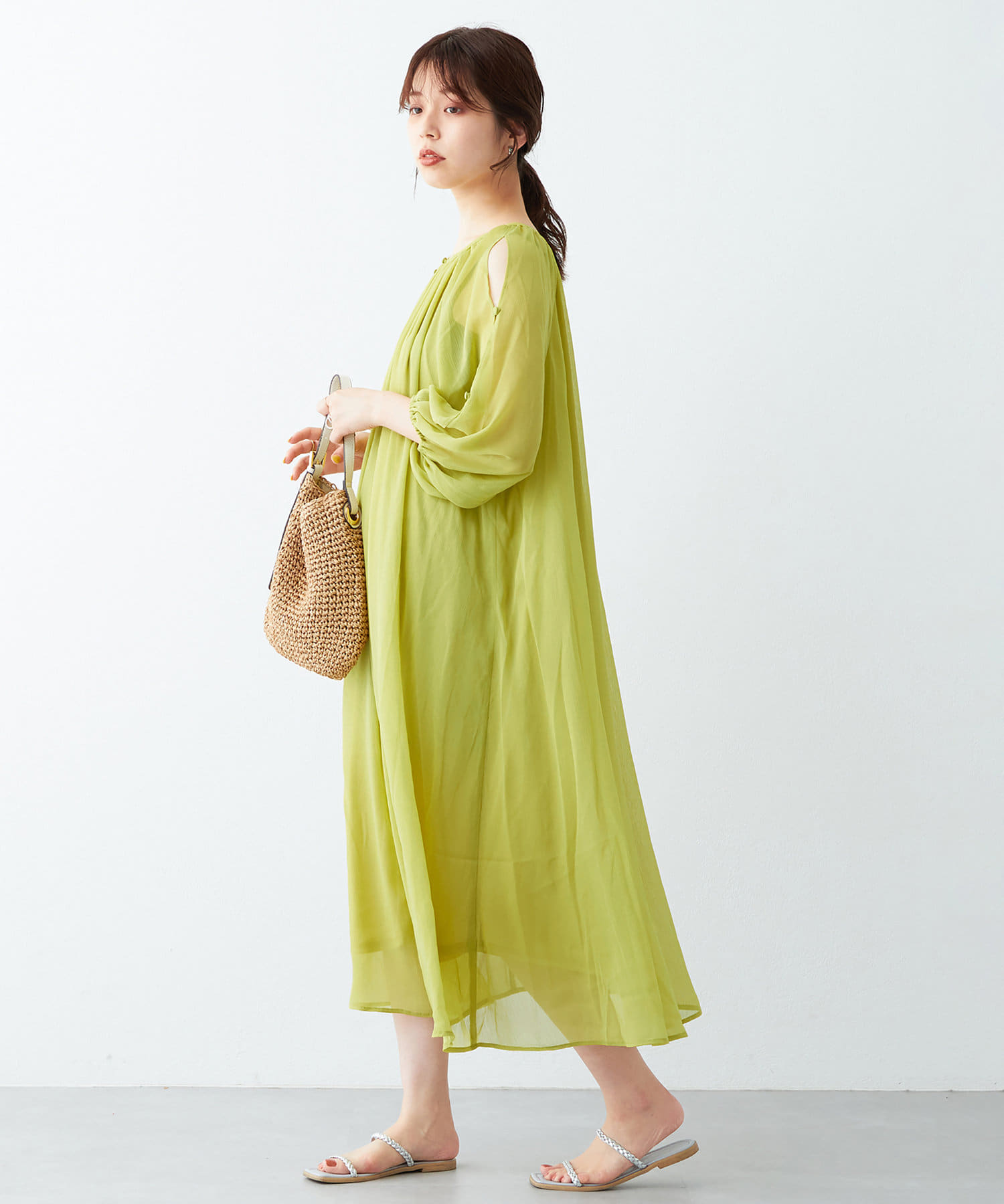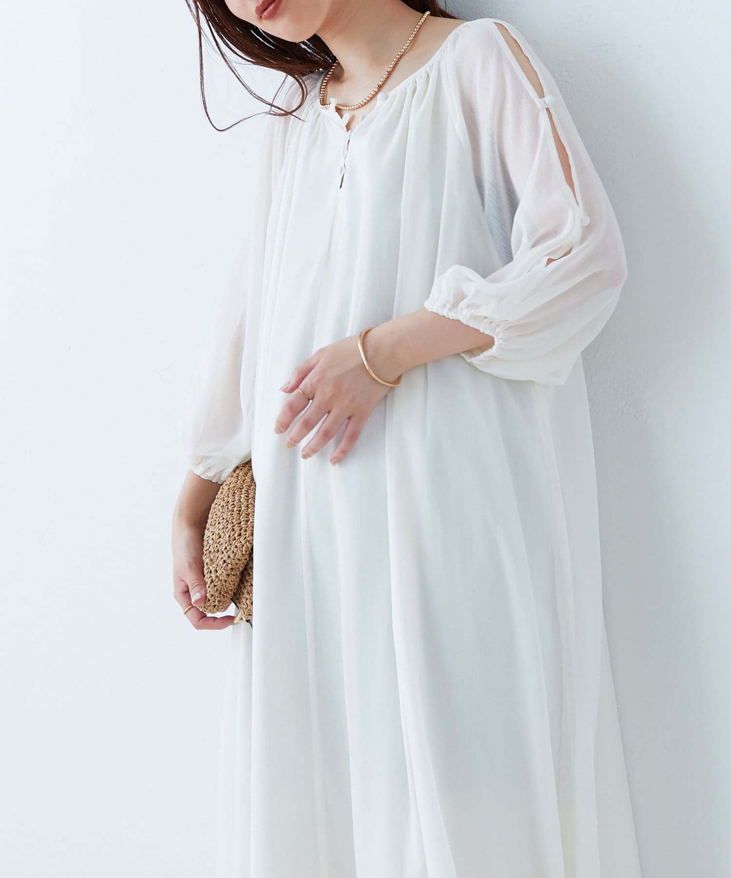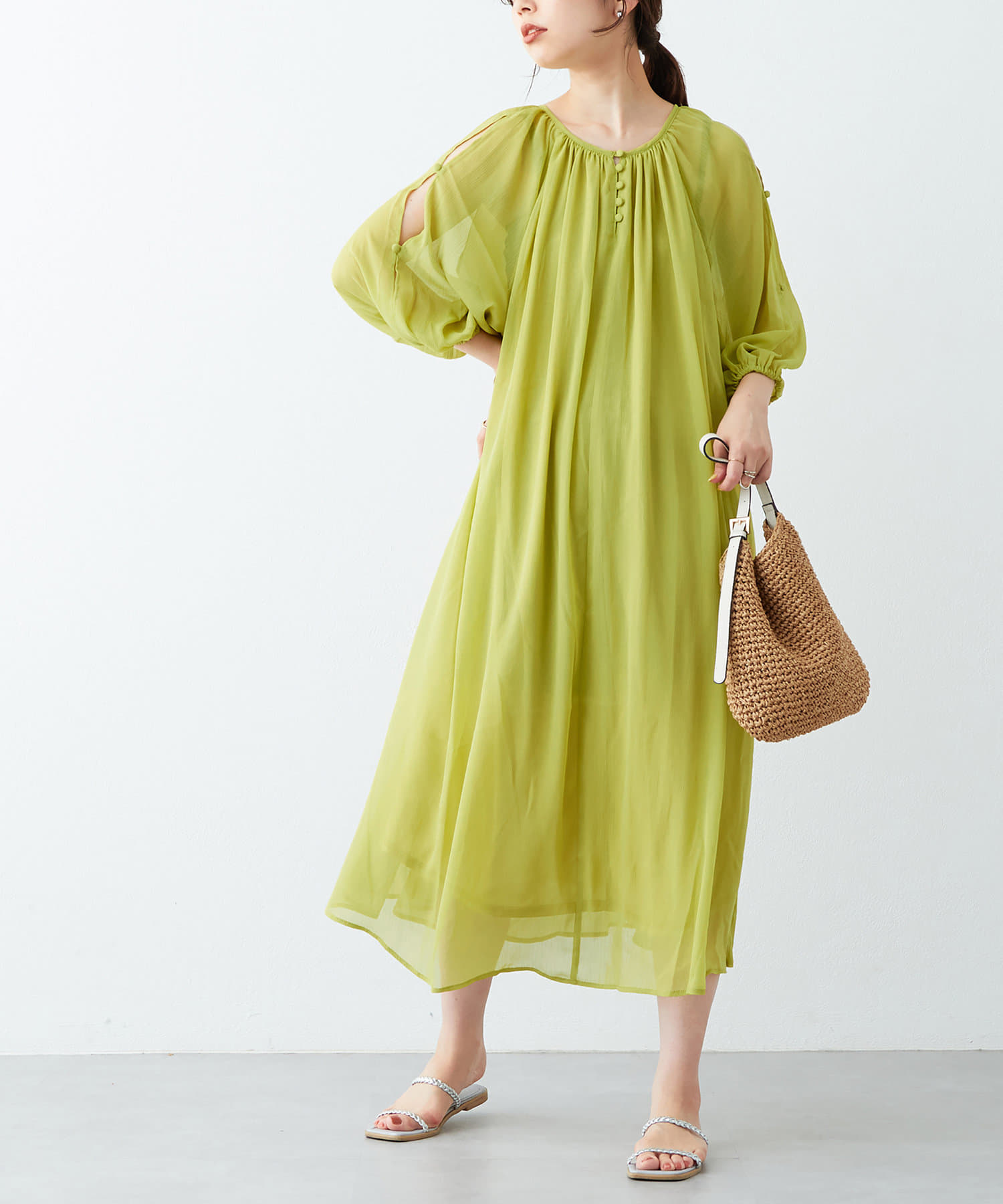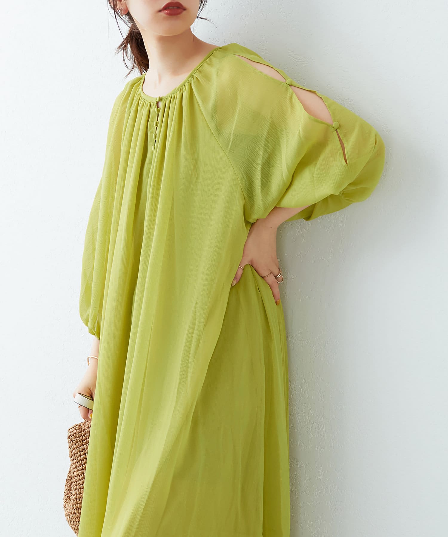 さりげない肌見せが魅力 シアー楊柳スリットデザインワンピース