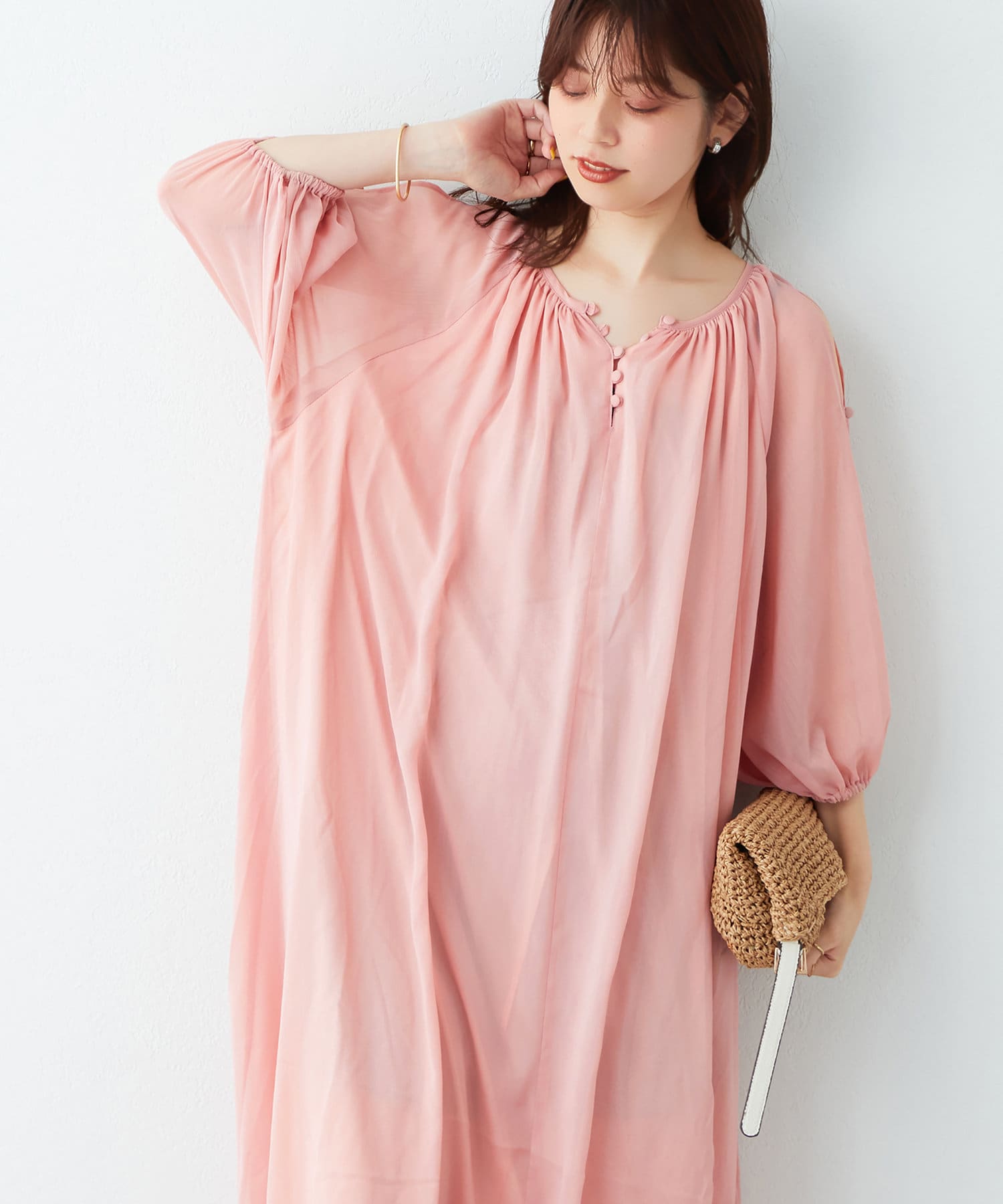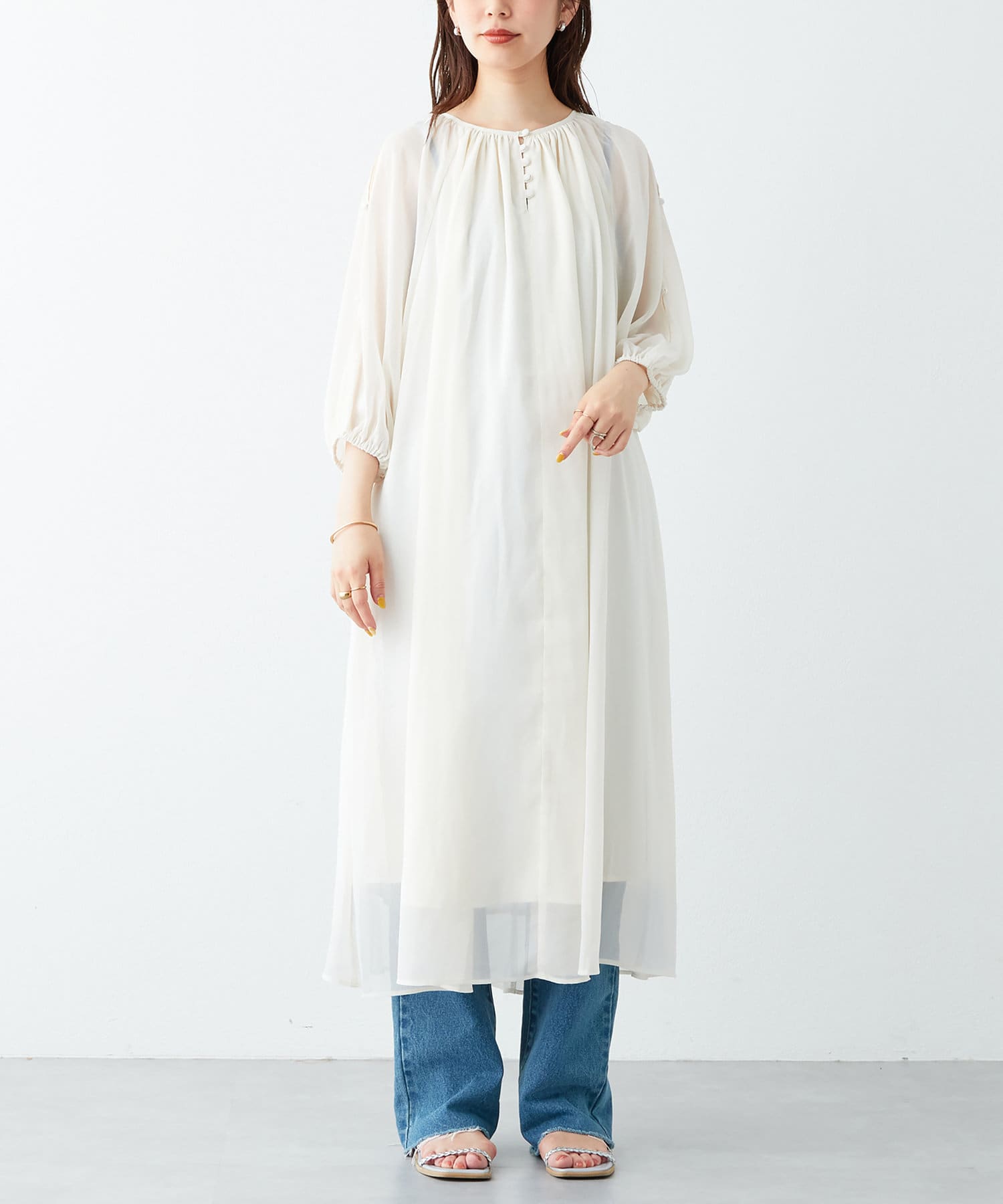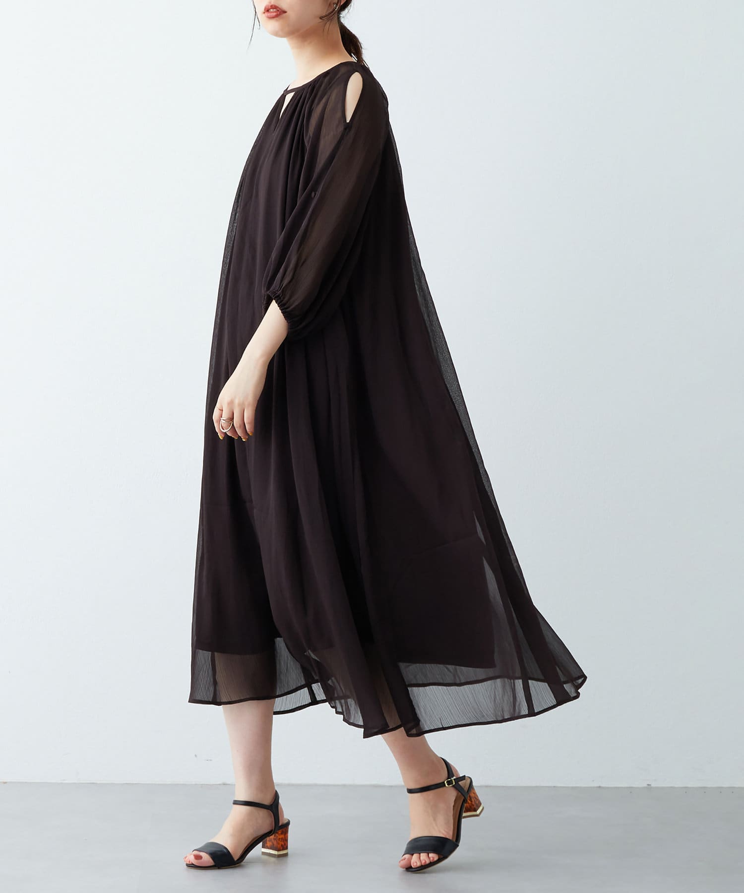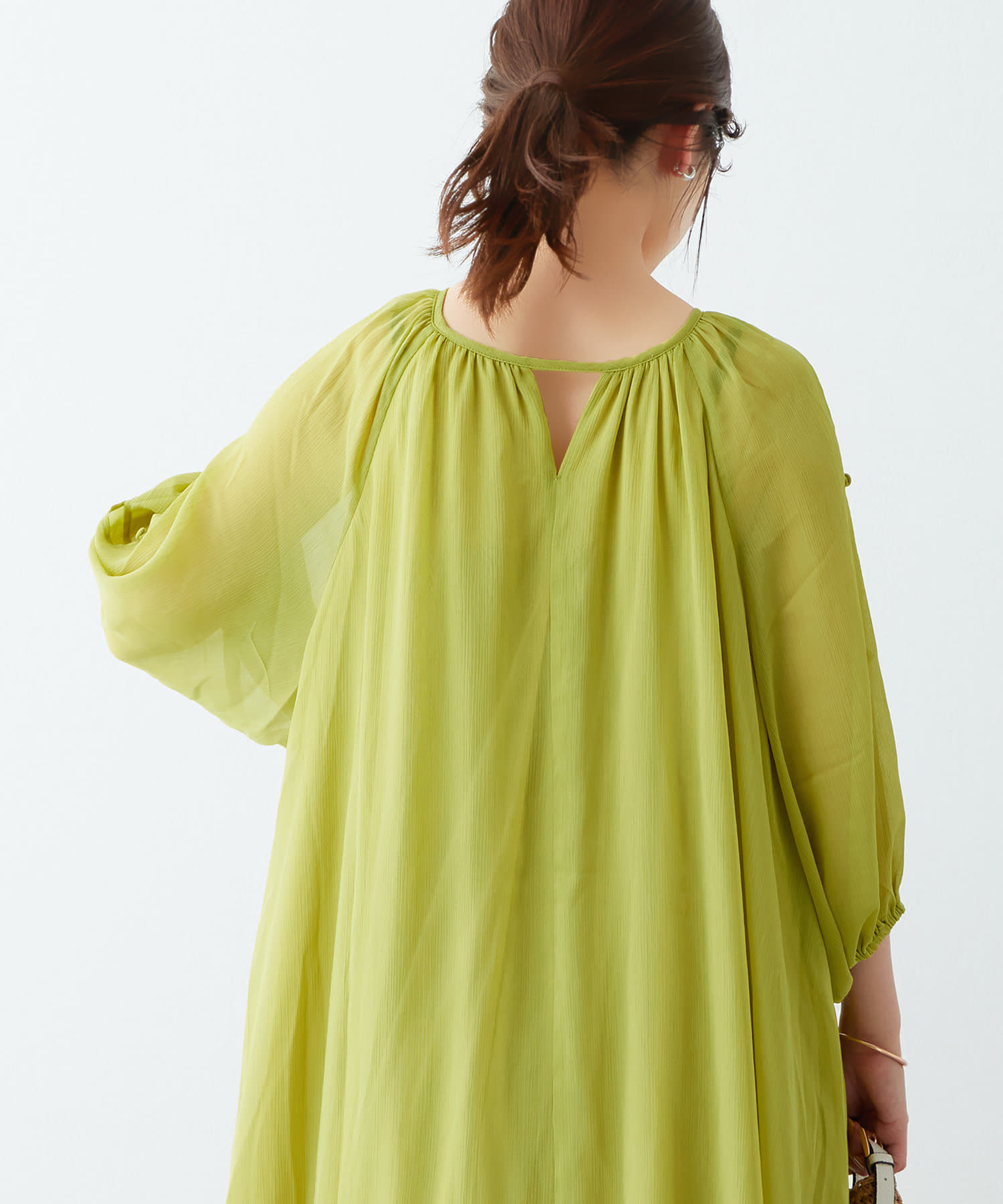 さりげない肌見せが魅力 シアー楊柳スリットデザインワンピース