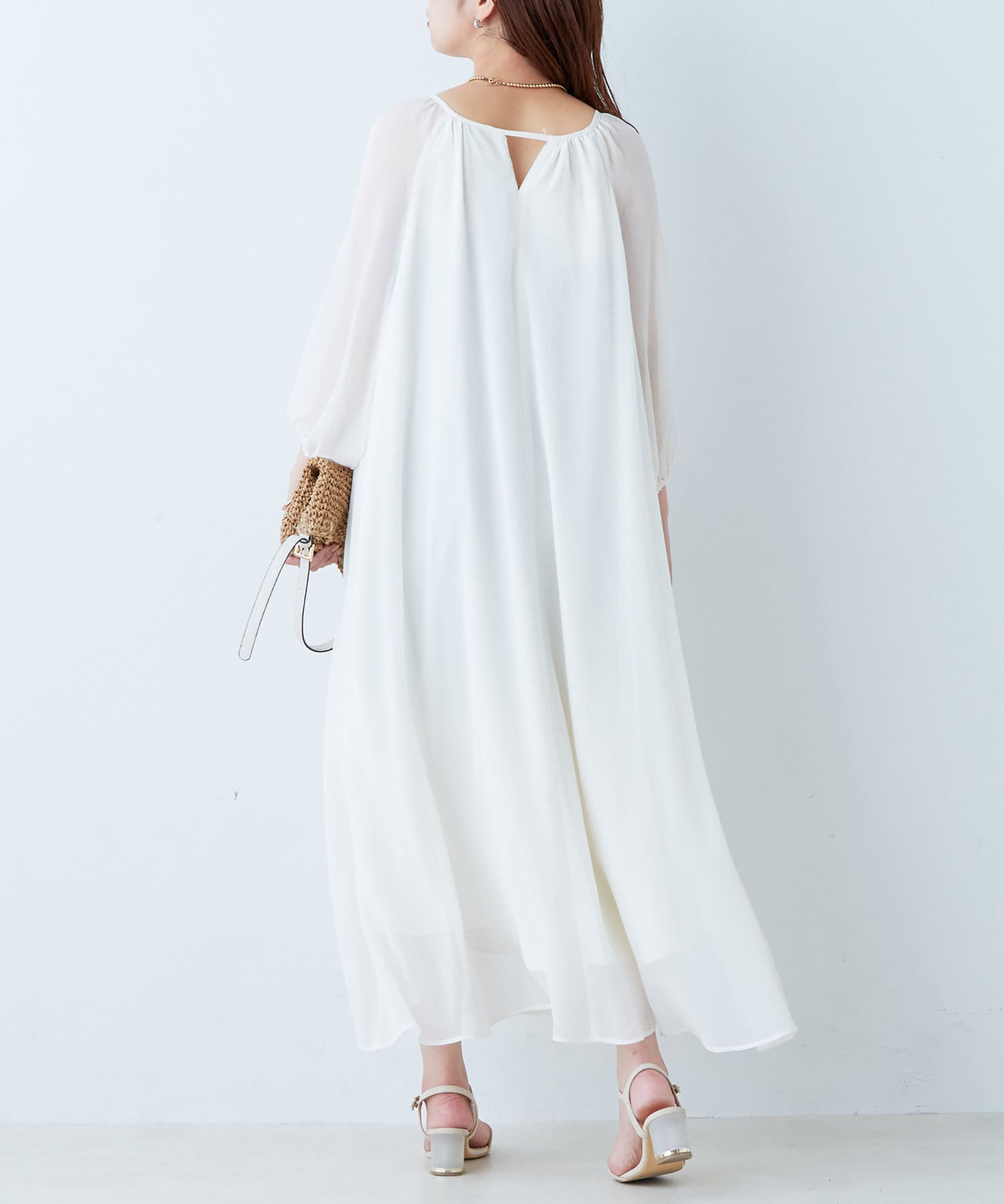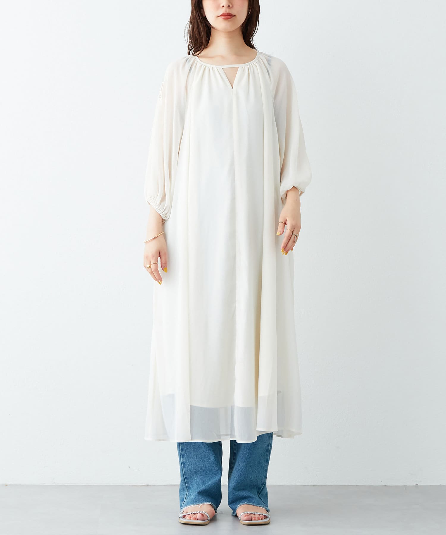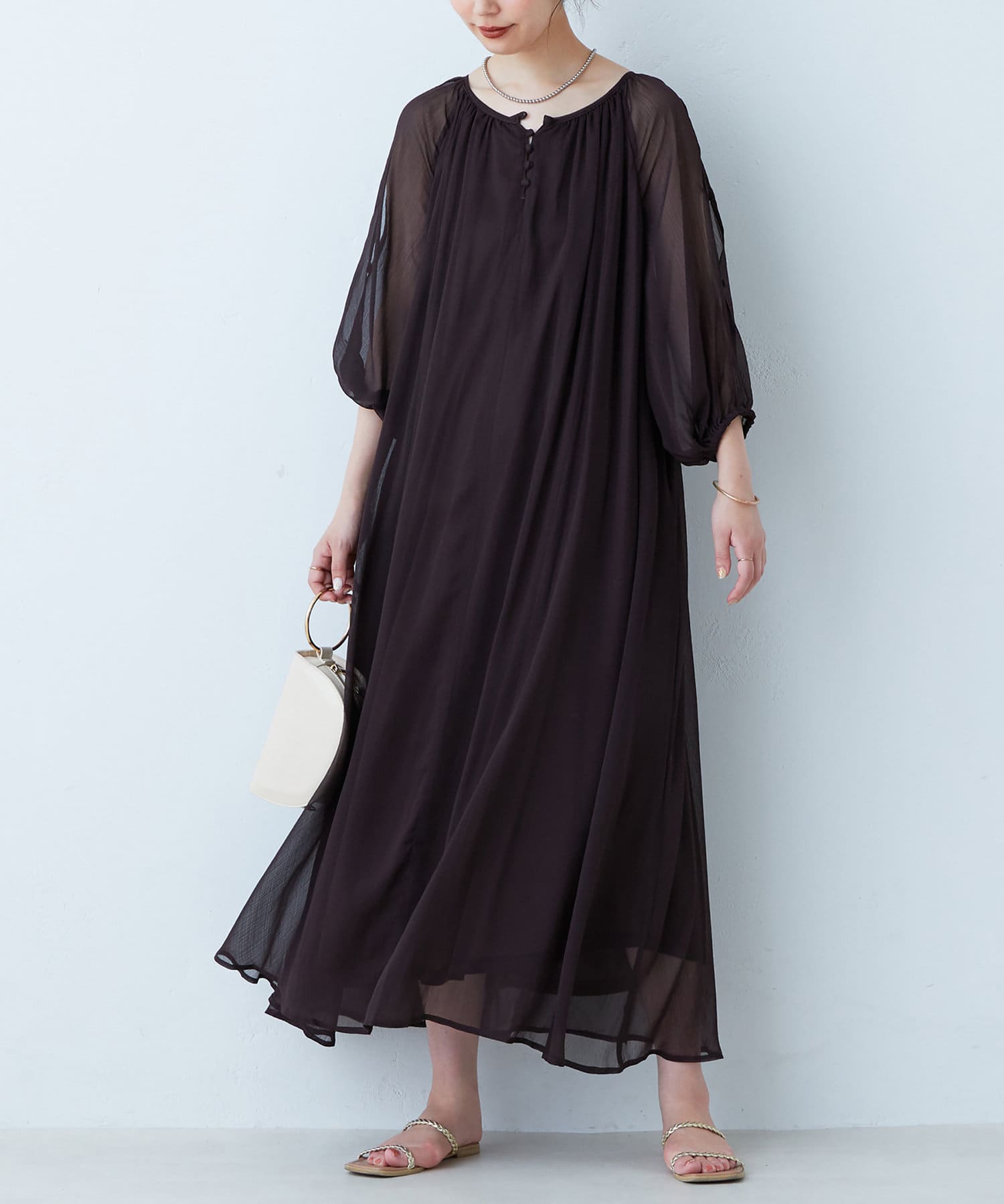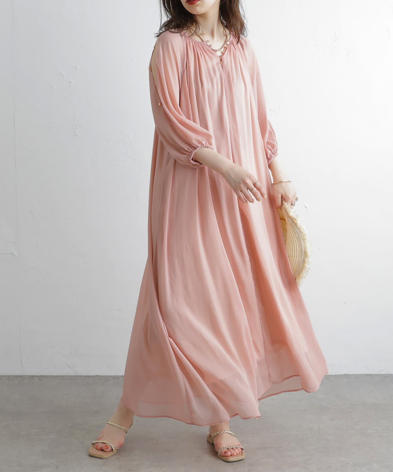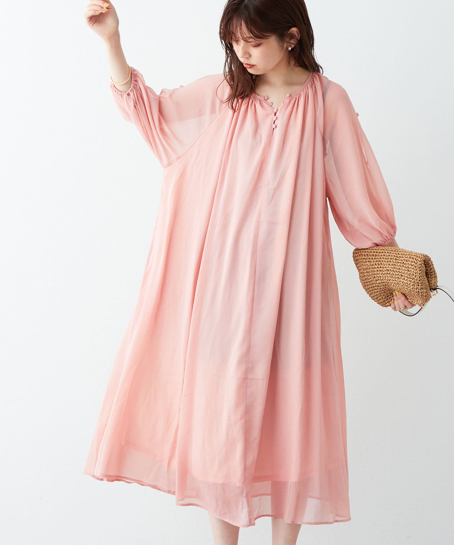 さりげない肌見せが魅力 シアー楊柳スリットデザインワンピース