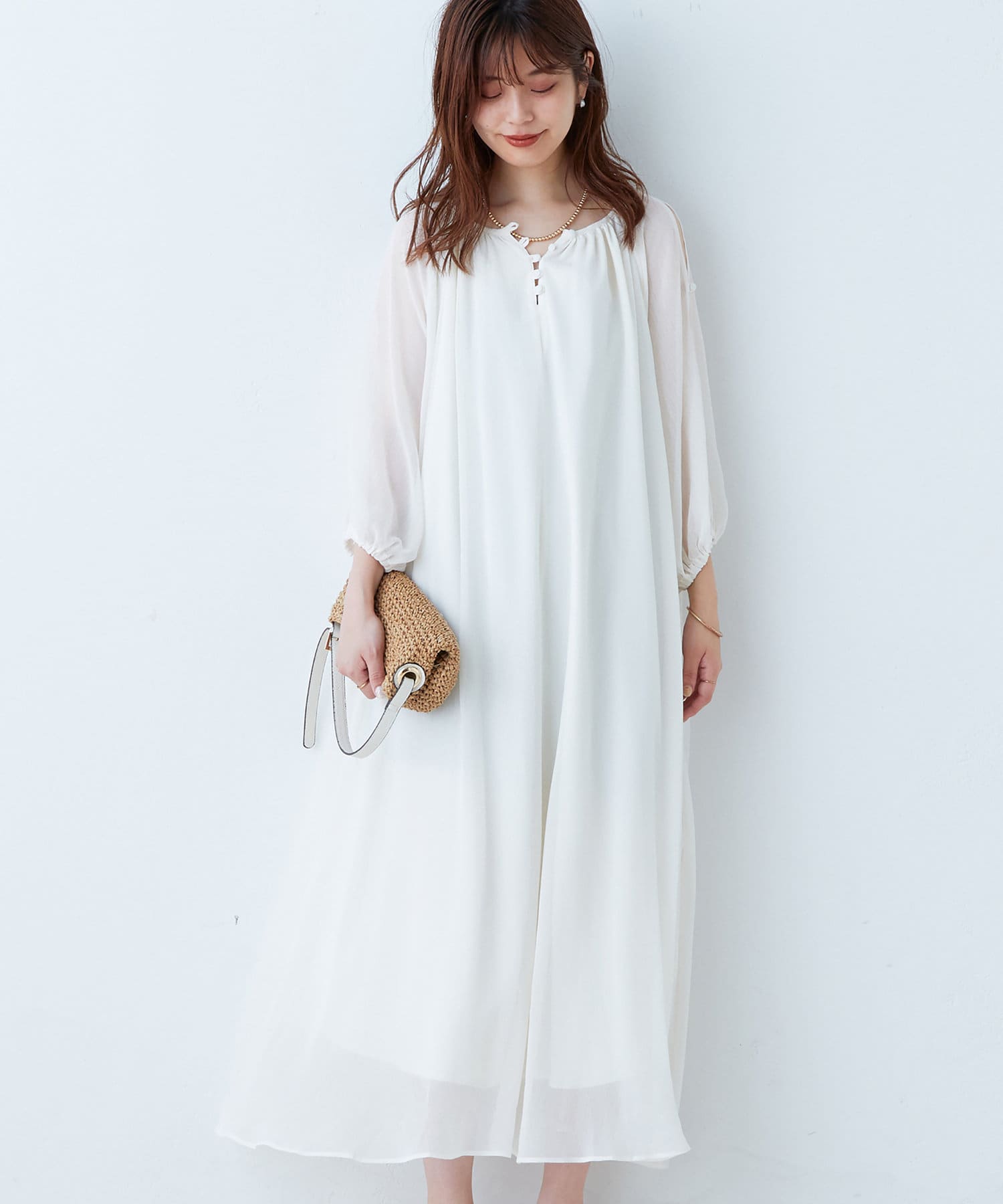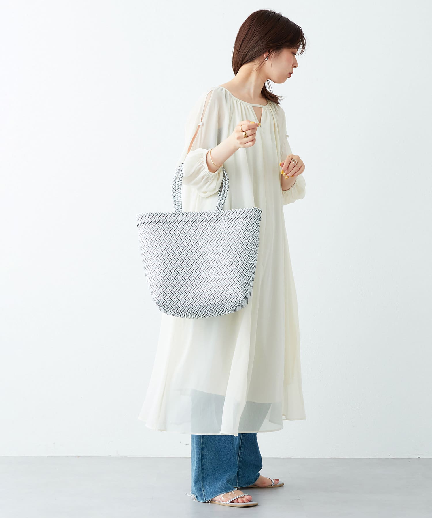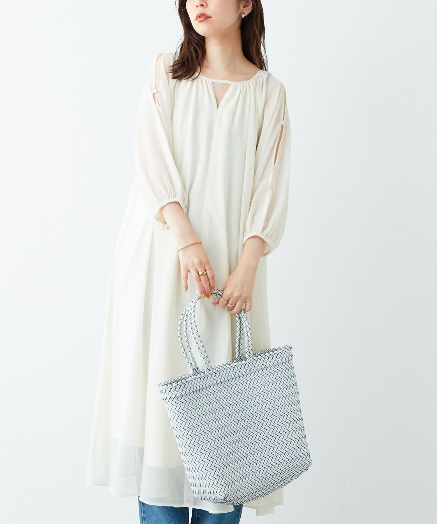 バングルや雑材の小物を合わせると季節感のあるスタイリングに仕上がります。