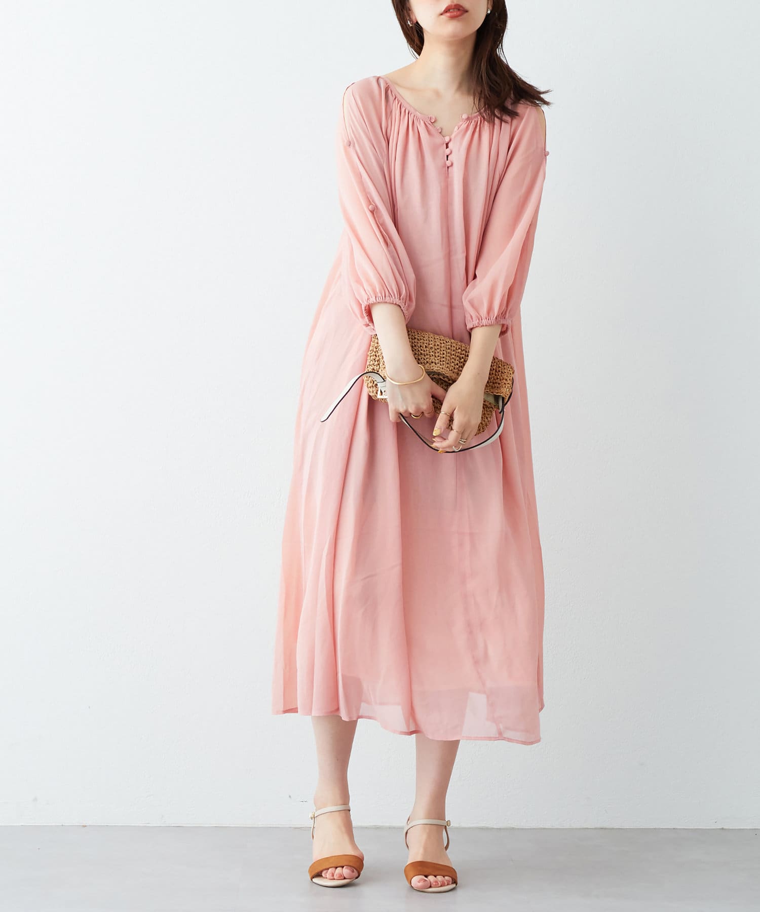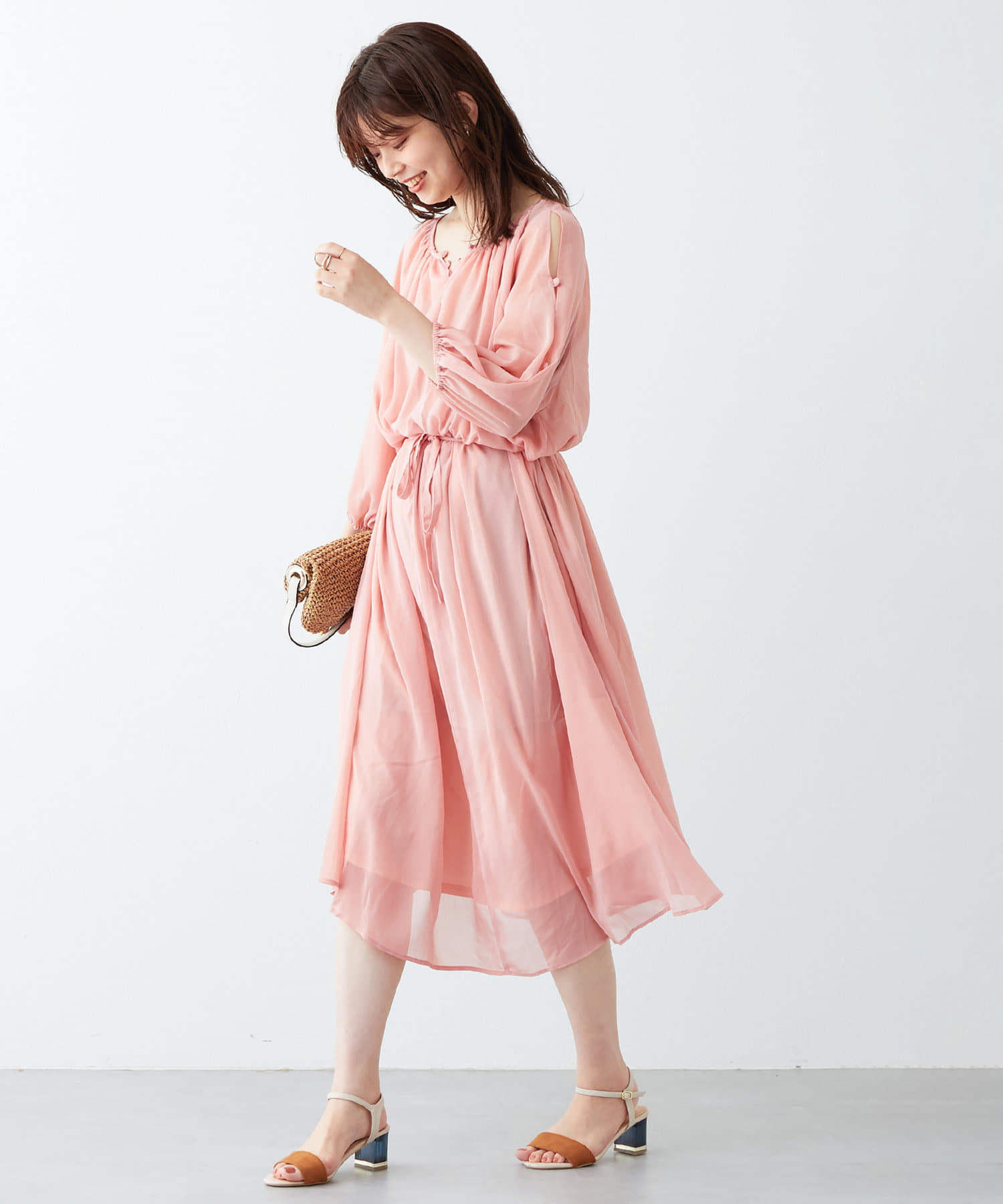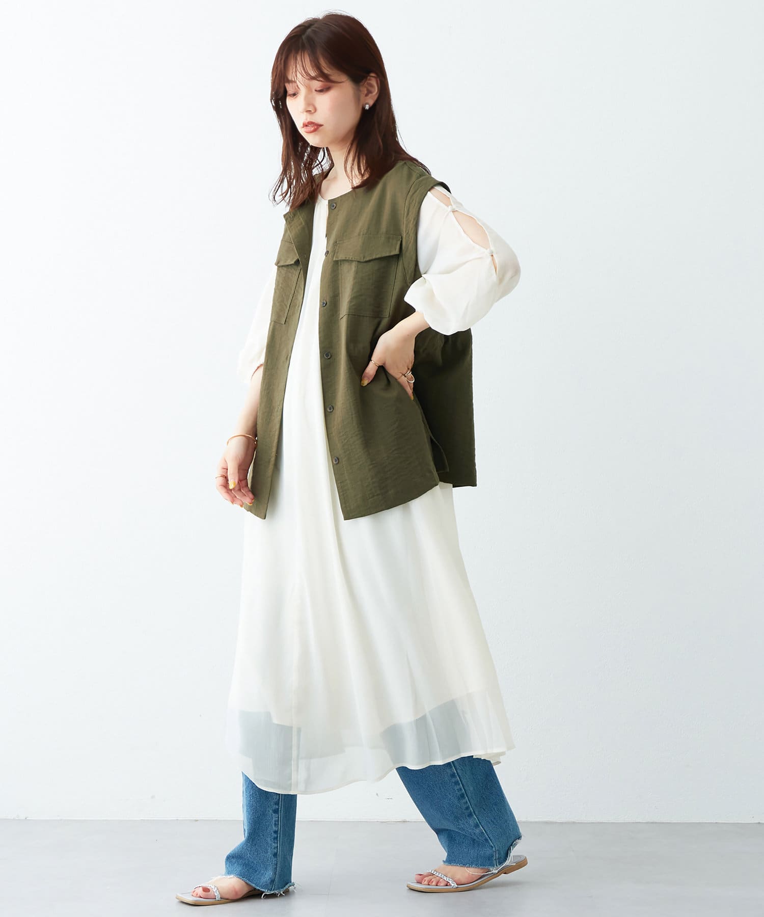バングルや雑材の小物を合わせると季節感のあるスタイリングに仕上がります。