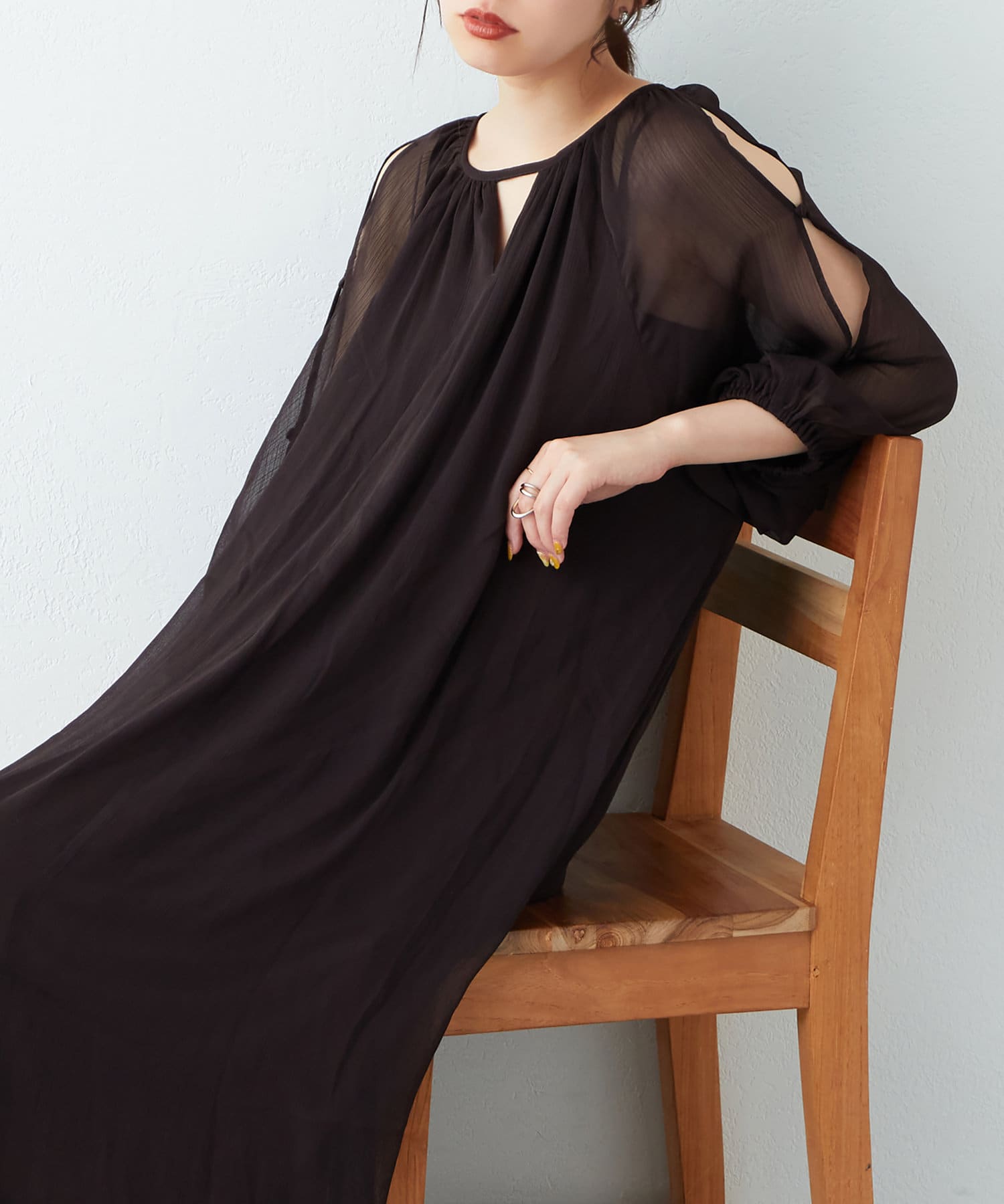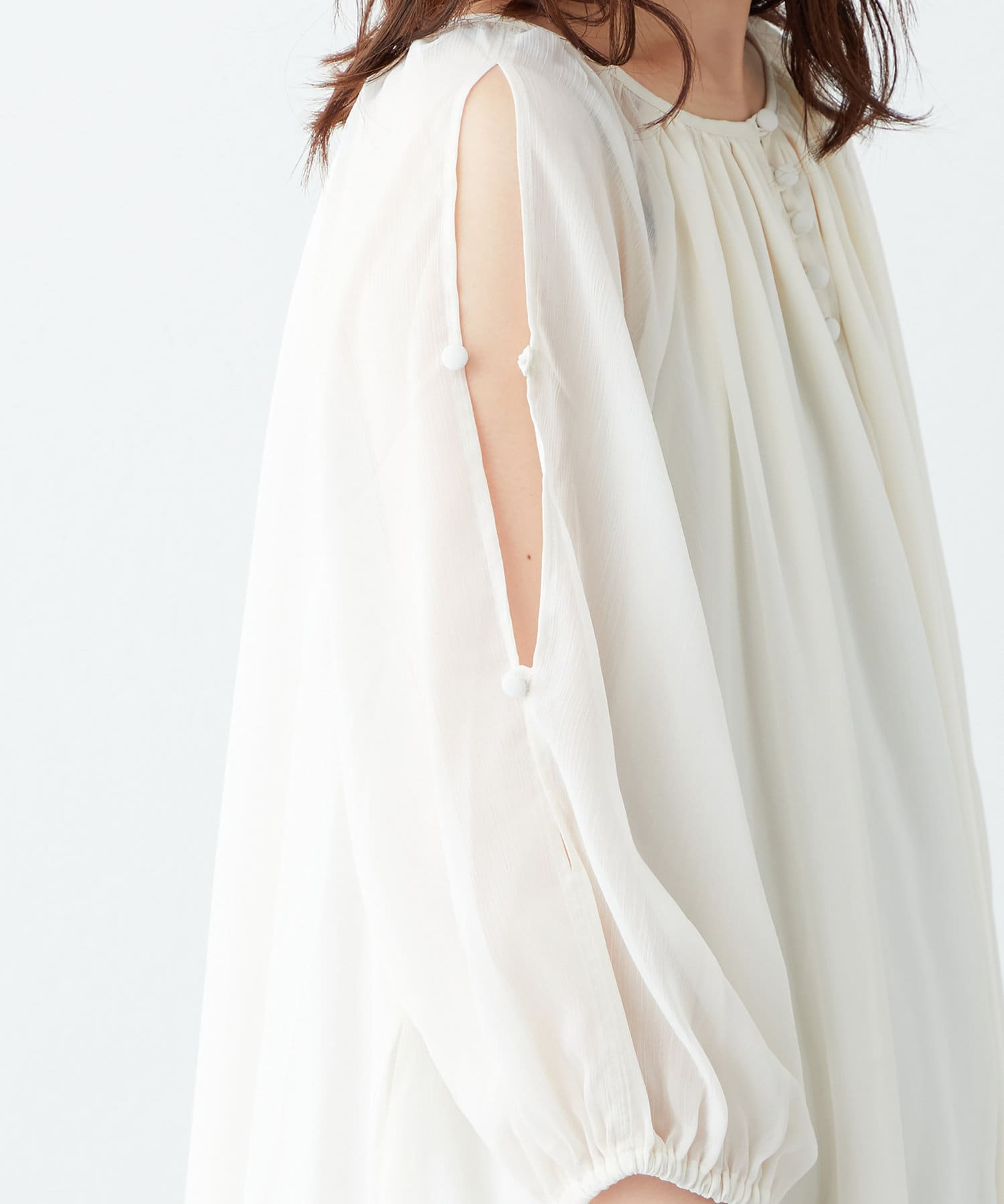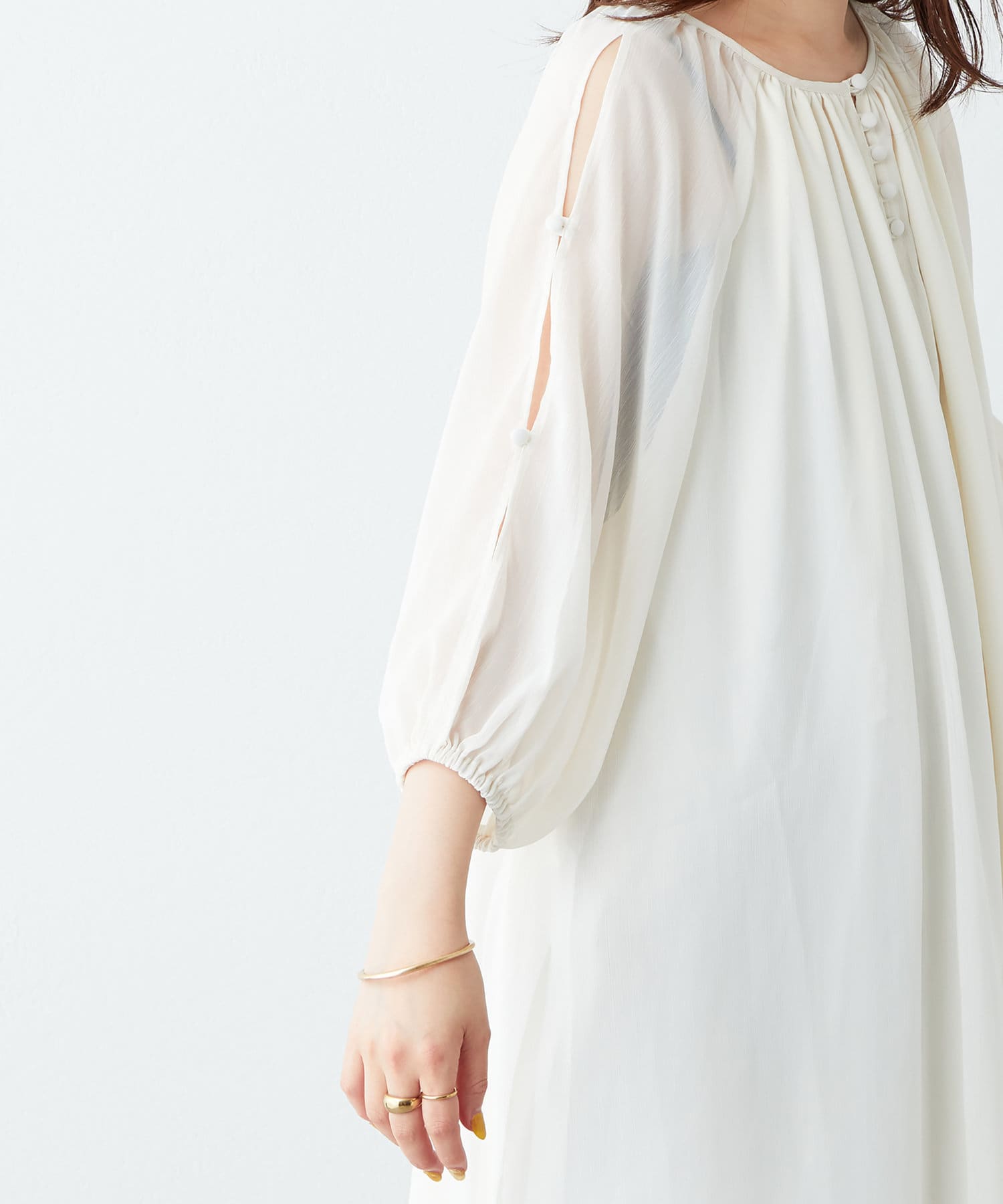 アームラインにスリットデザインを施し、さりげない肌見せと涼しげなシアー素材で、