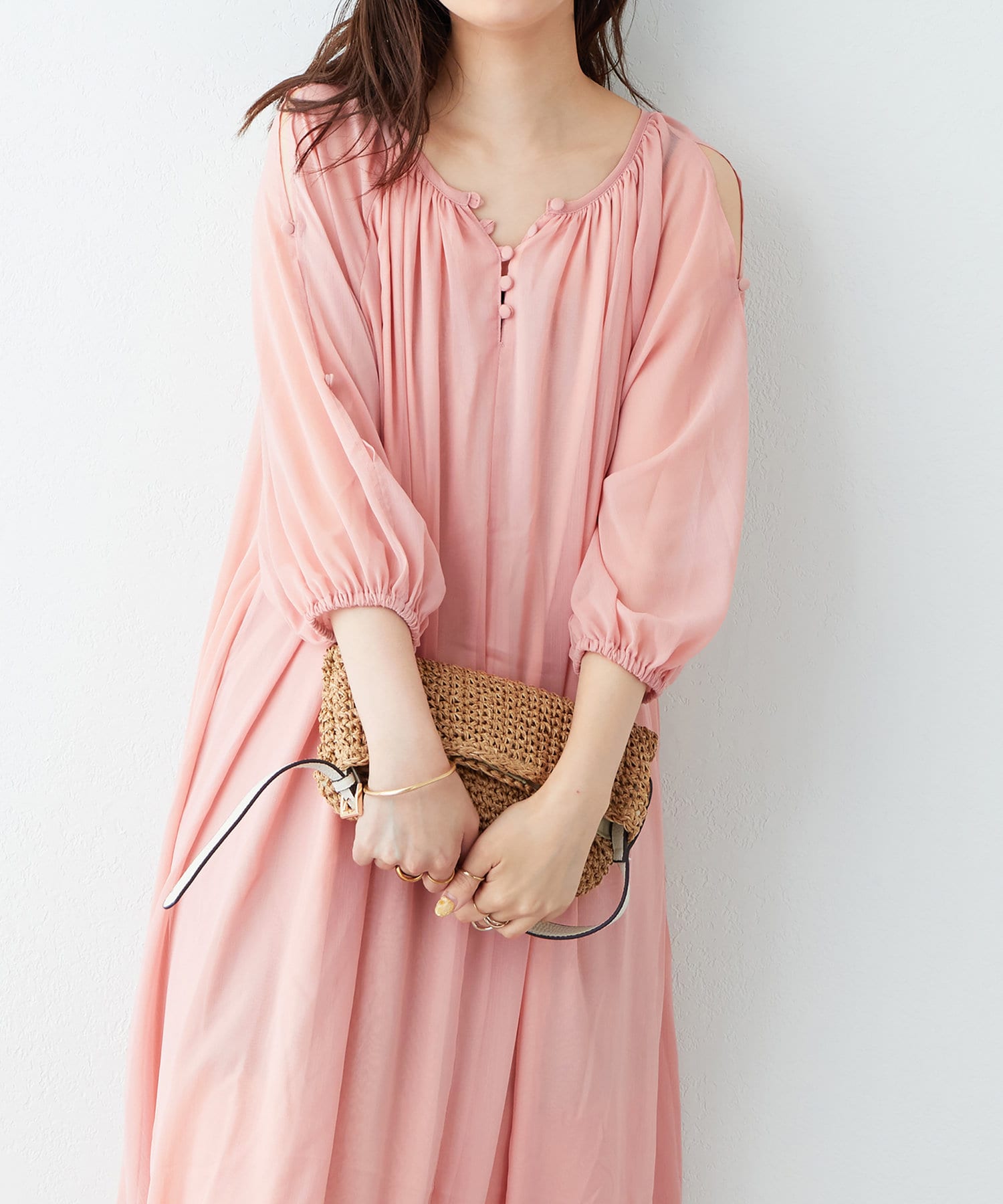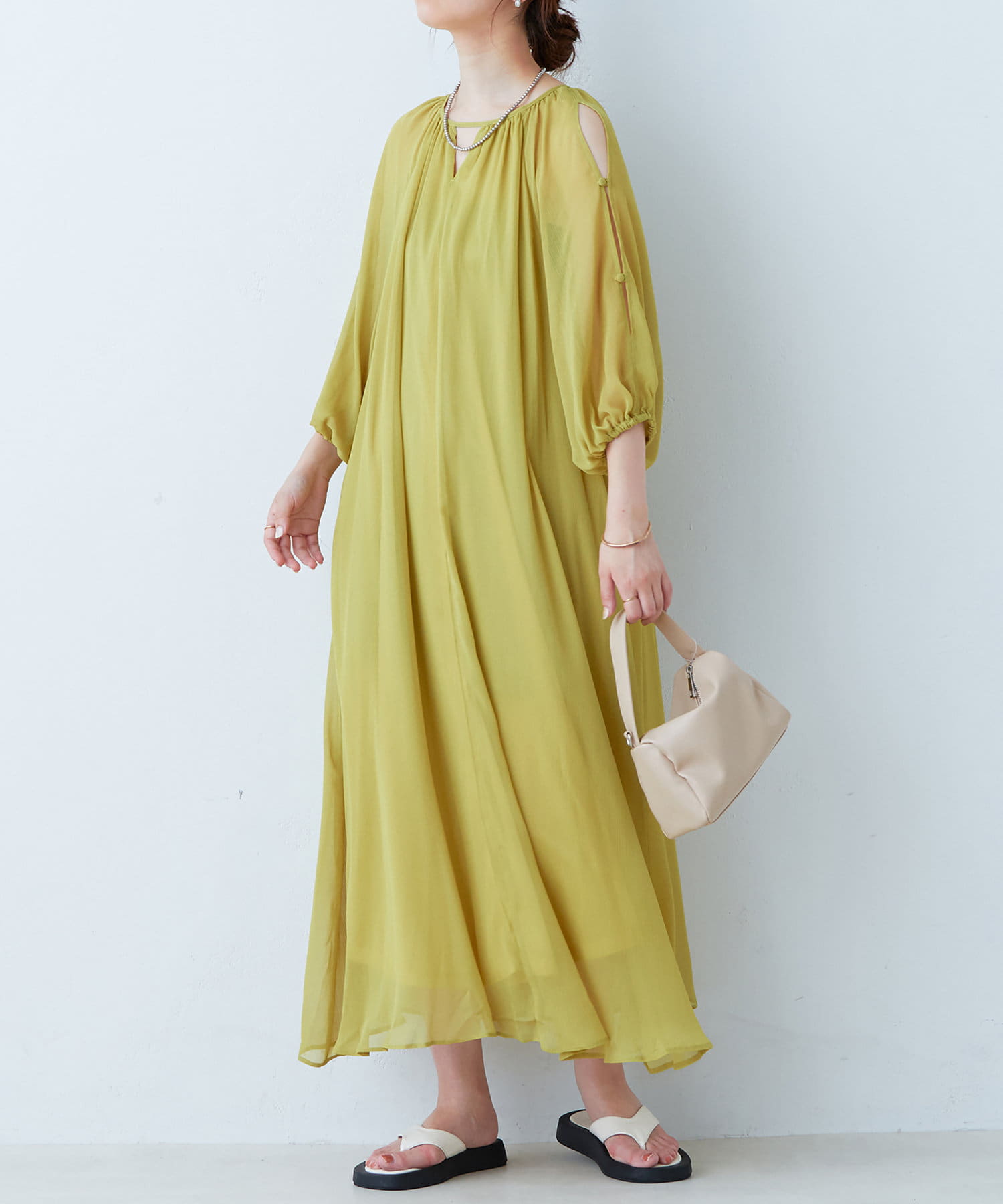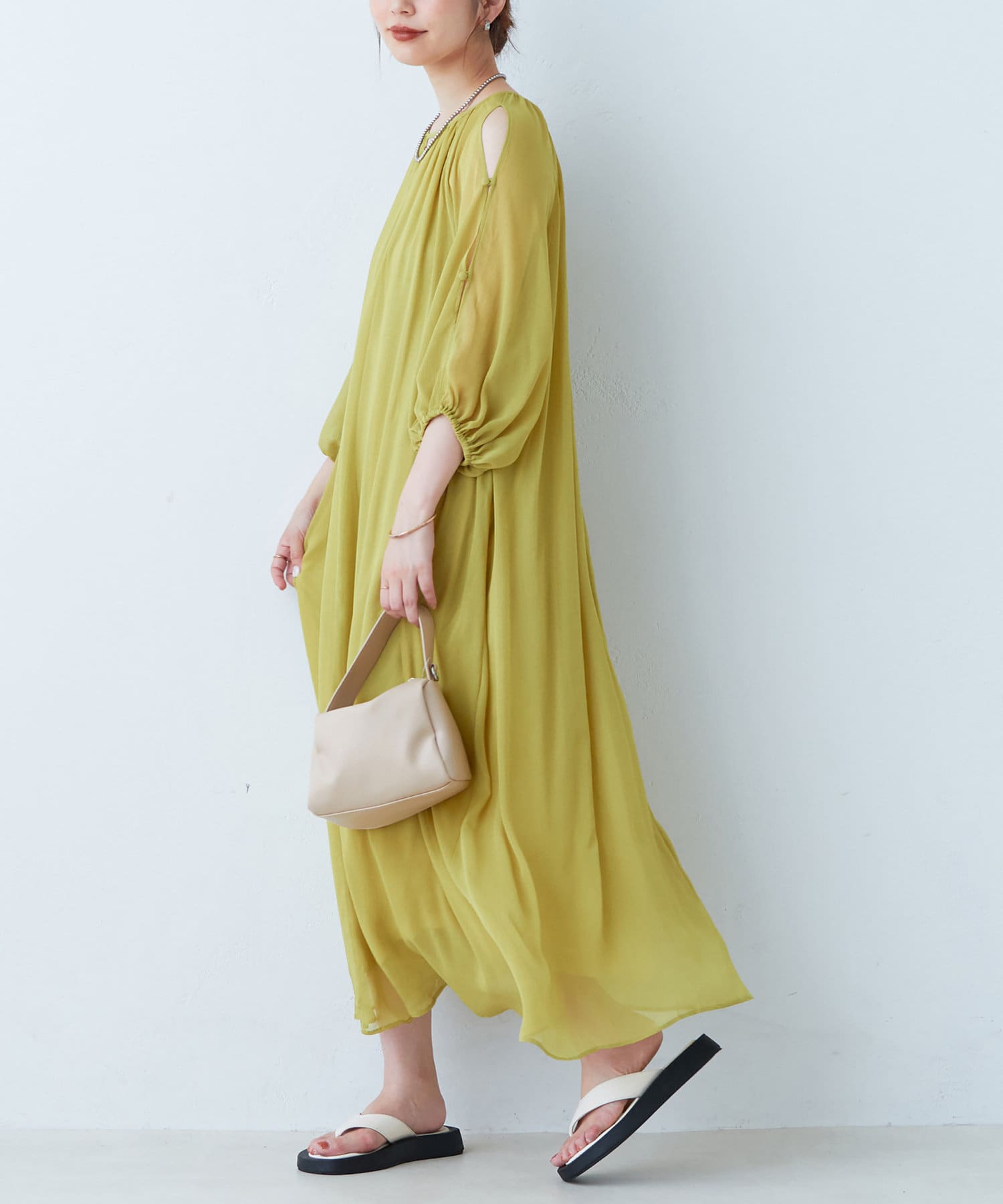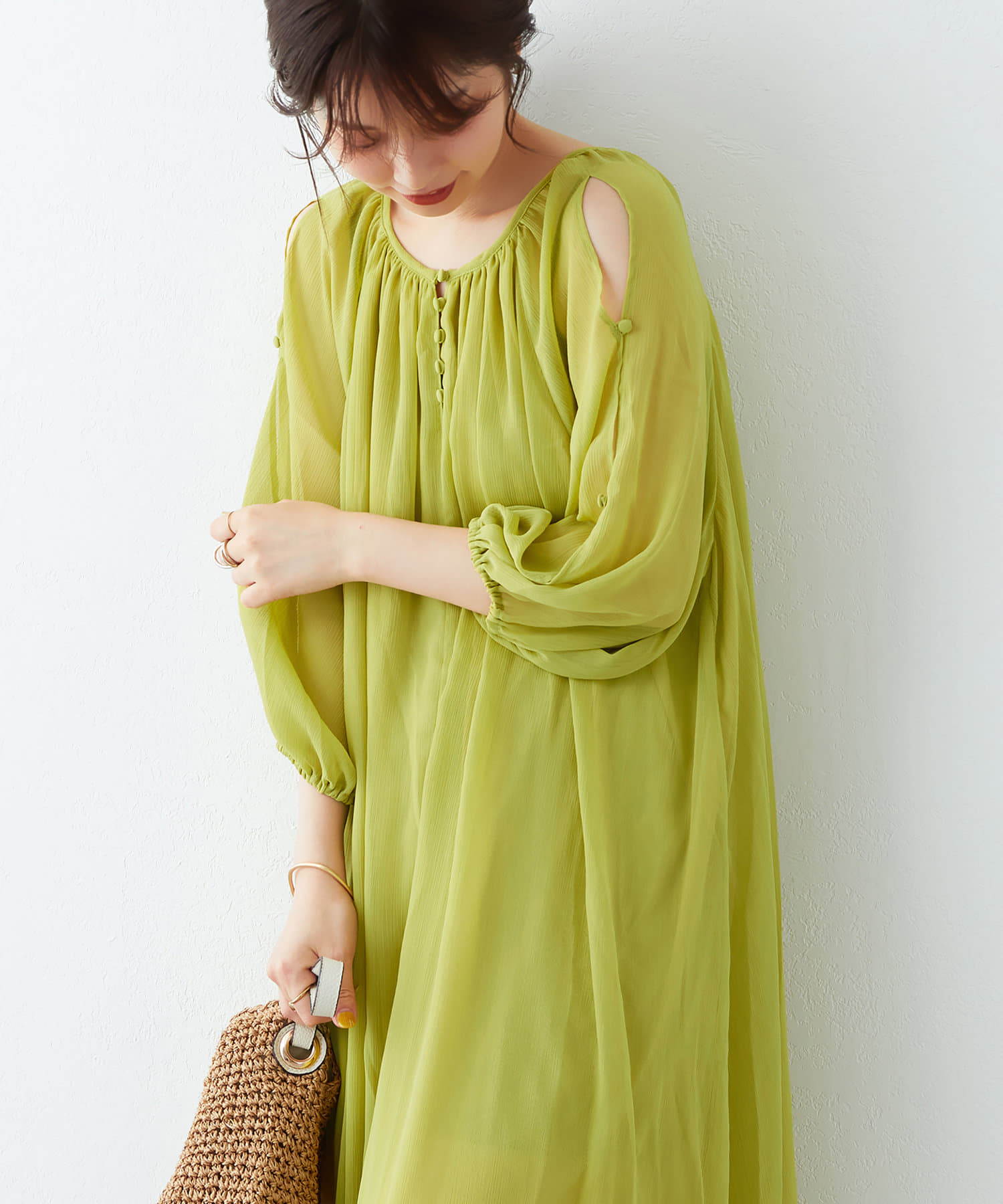 アームラインにスリットデザインを施し、さりげない肌見せと涼しげなシアー素材で、