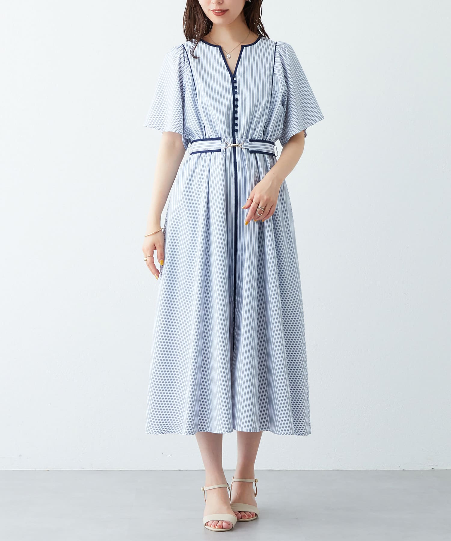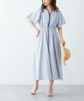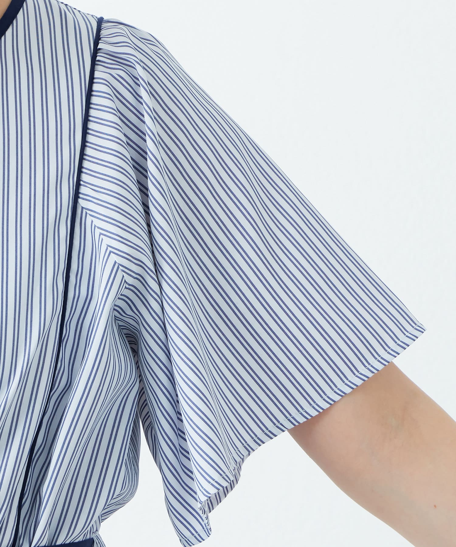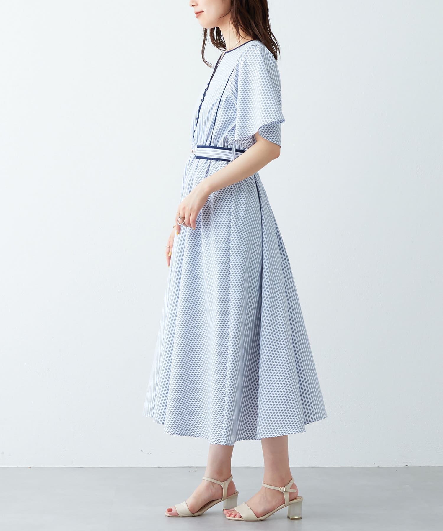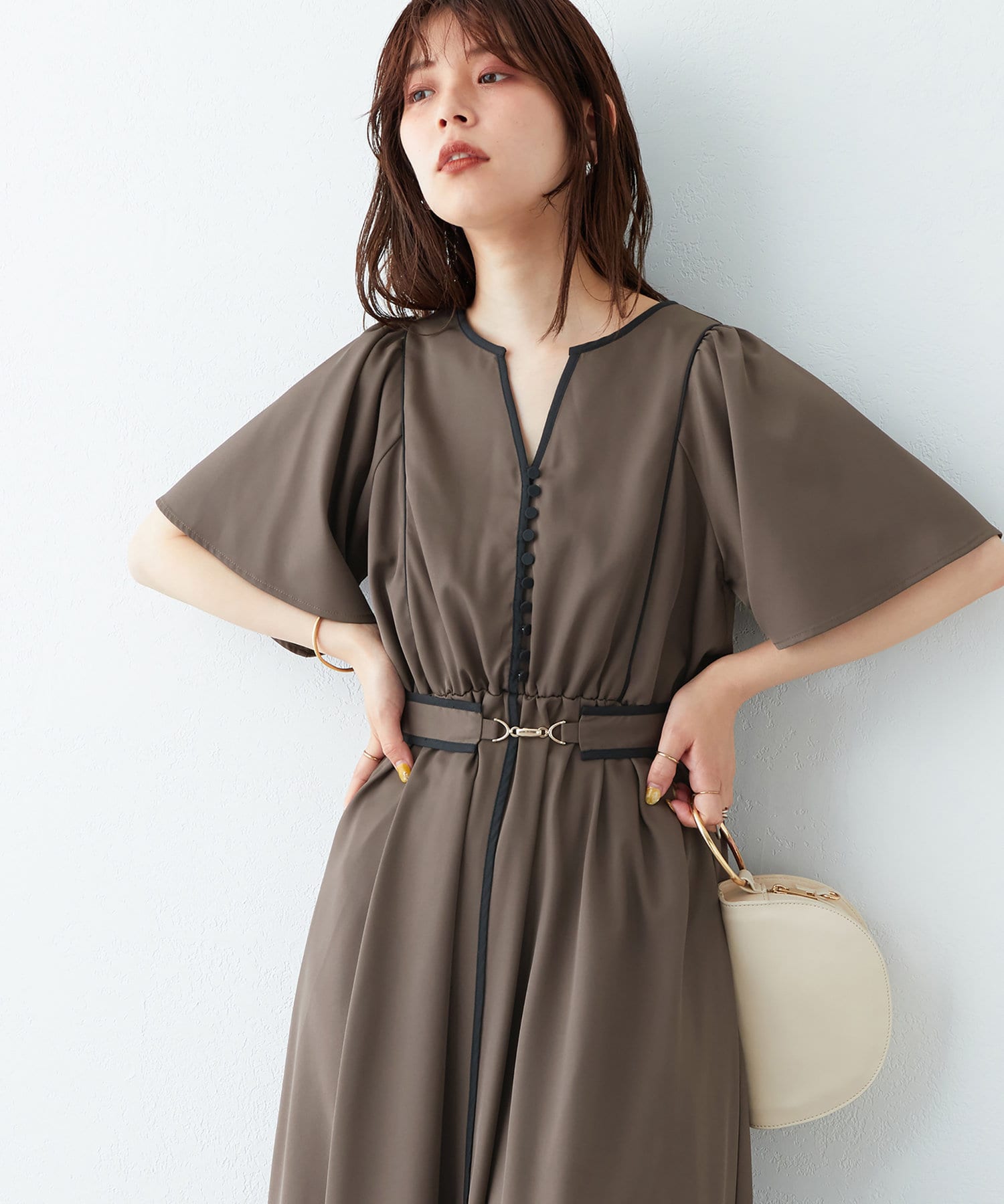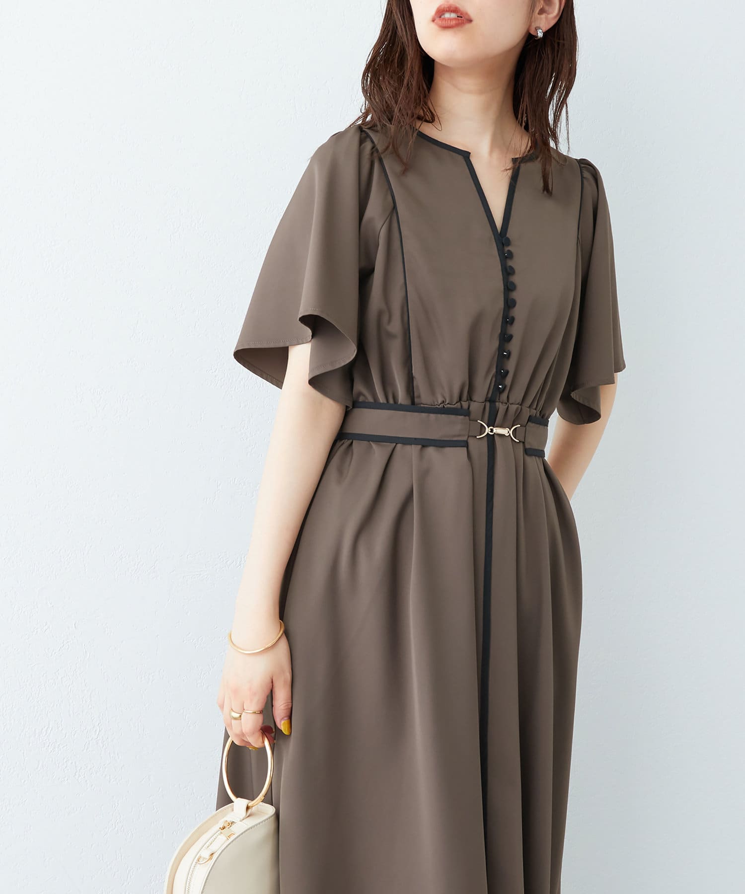 美しいラインが魅力 フレアスリーブパイピングワンピース