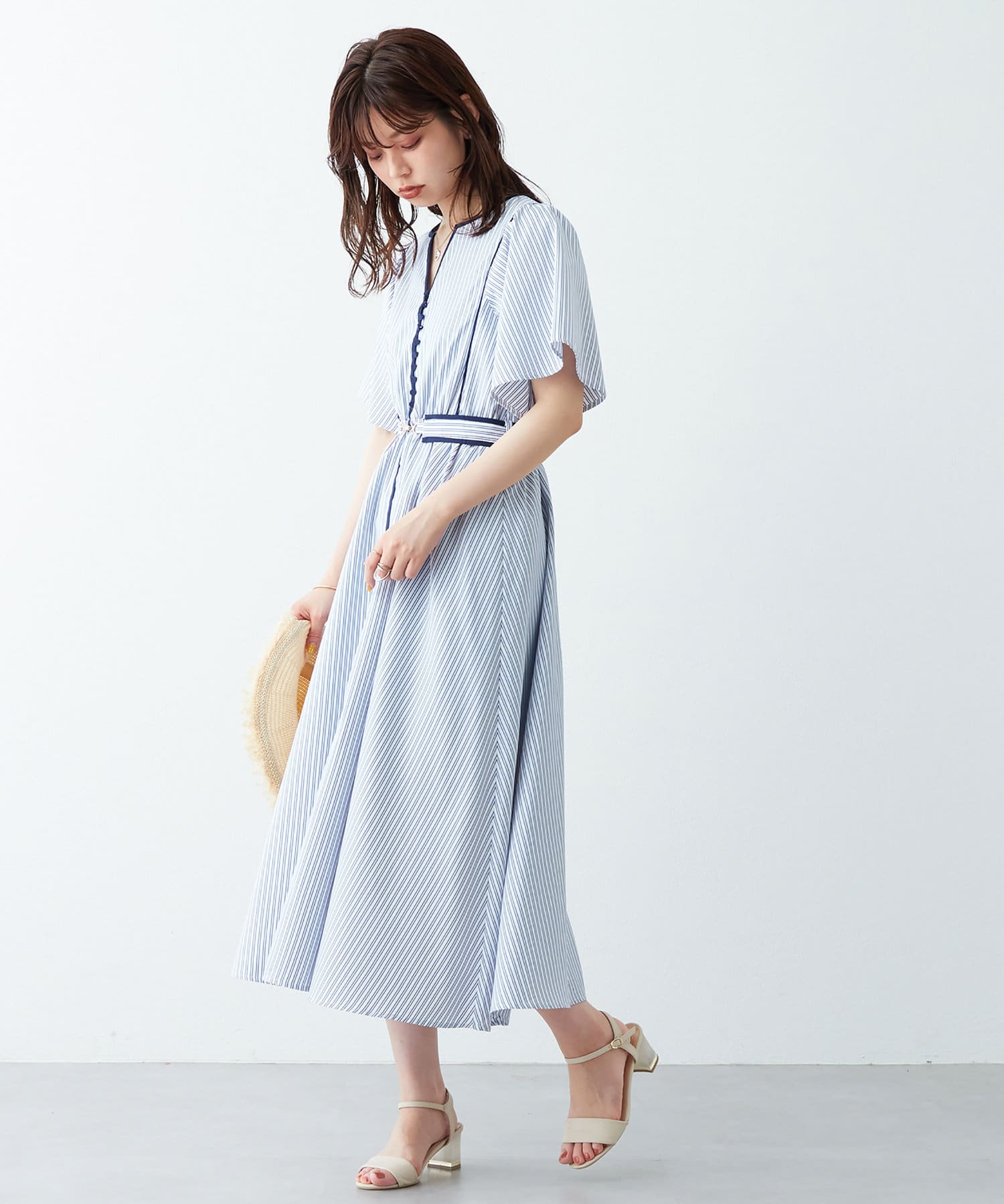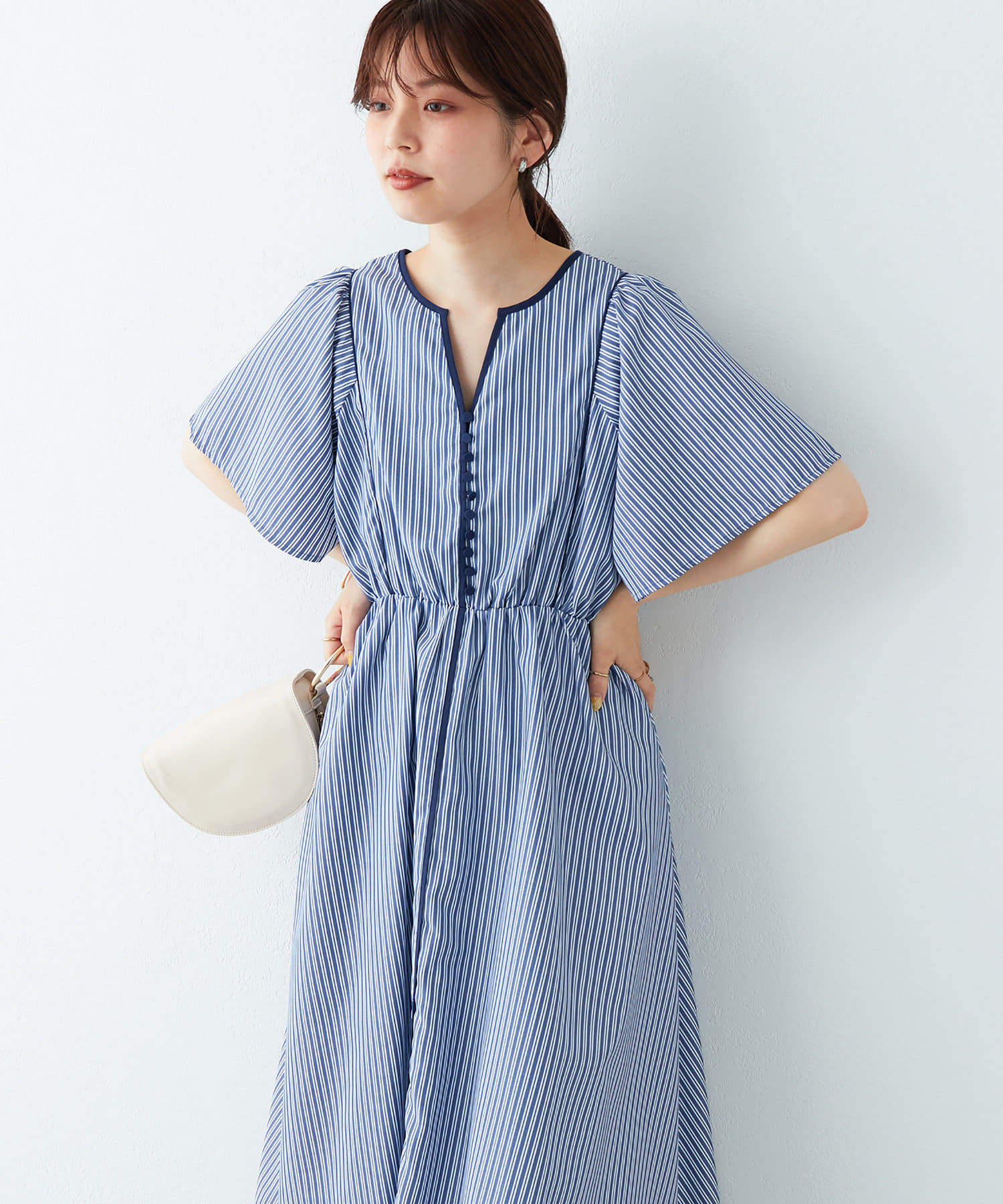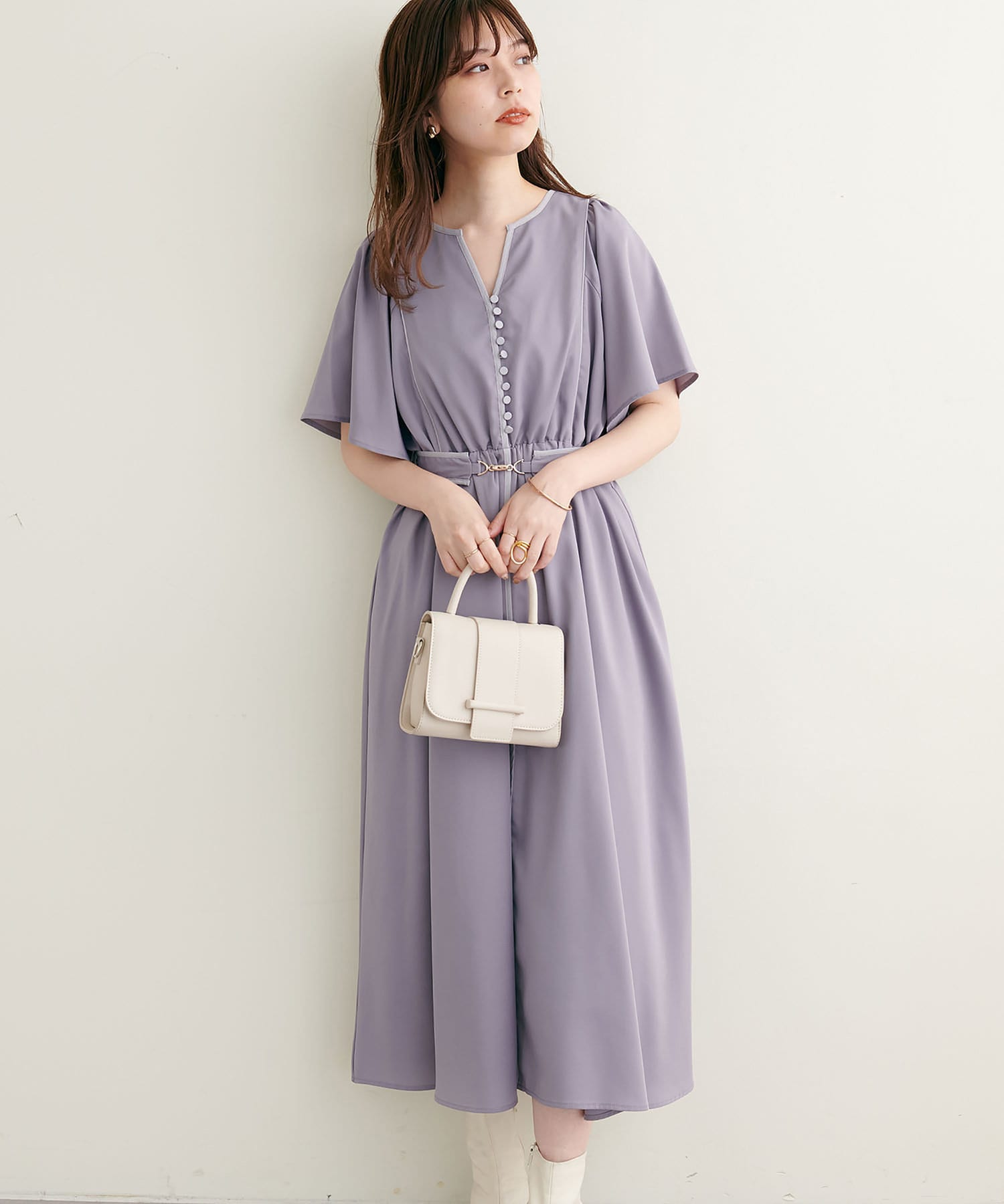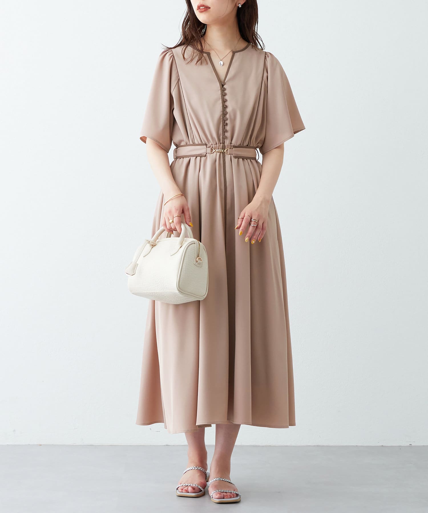 美しいラインが魅力 フレアスリーブパイピングワンピース