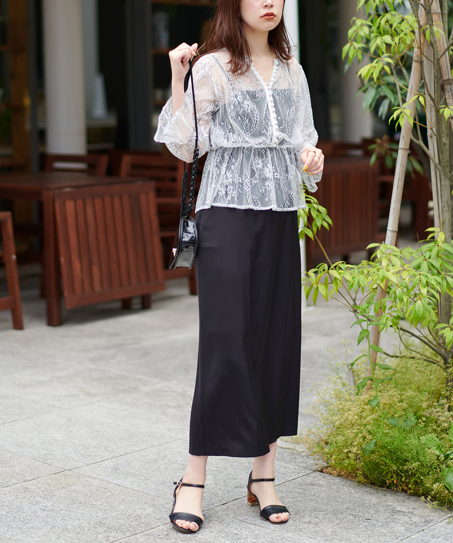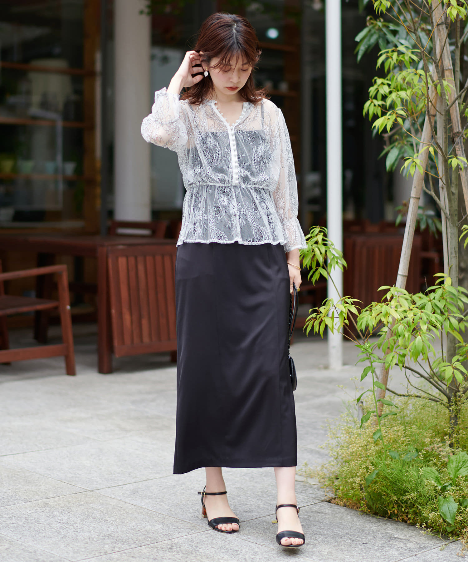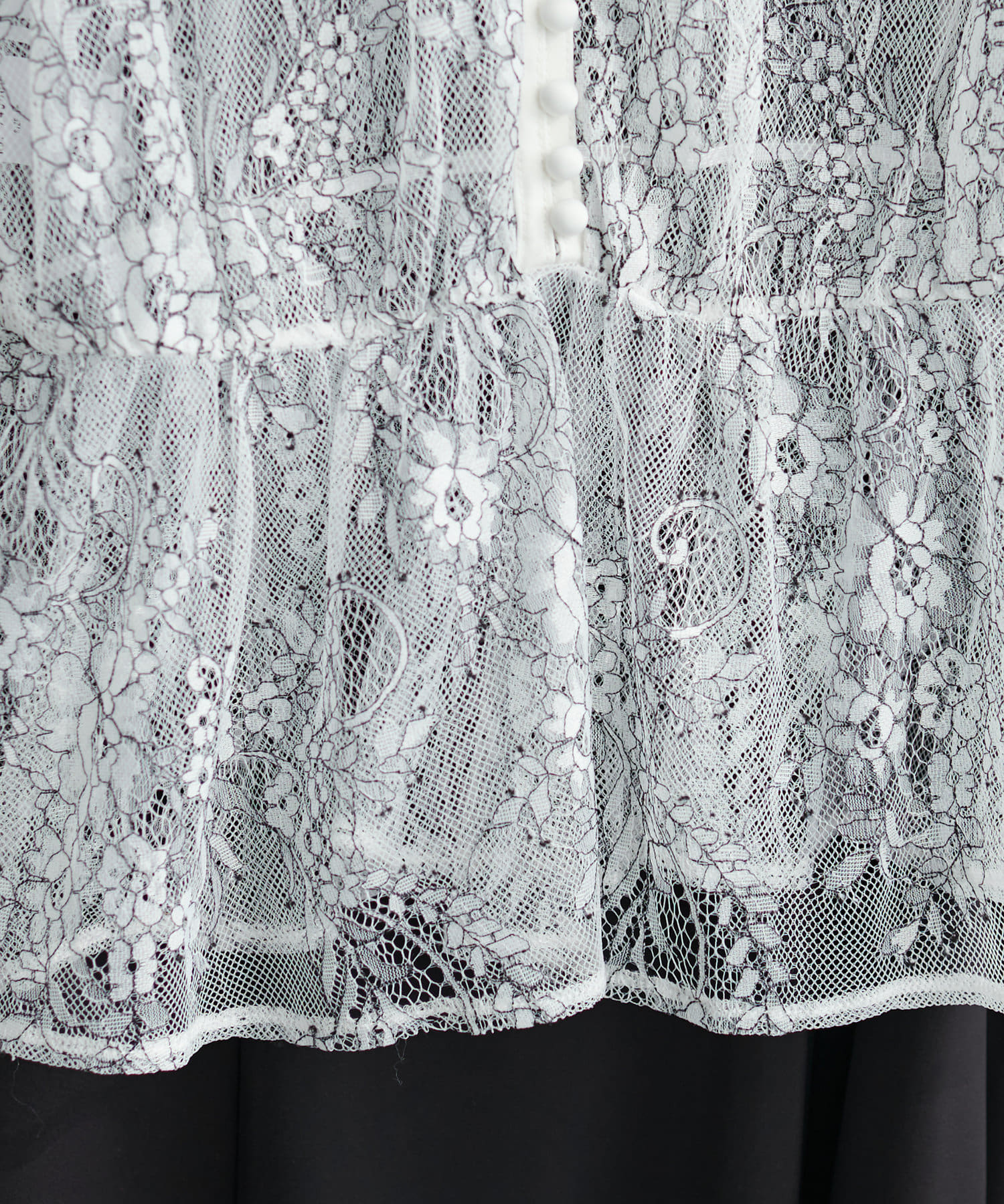 生地感 :[ブラウス]アイボリーの薄手のレース地、ミント・チャコール・ブラックはさらっとしたシアー素材