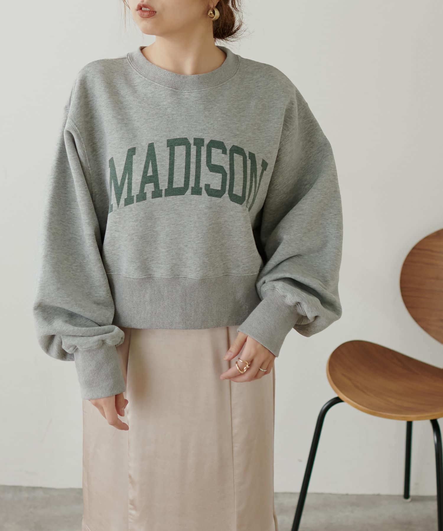 短い丈感にドロップショルダー、長めの袖丈が着るだけでオシャレなシルエットに。