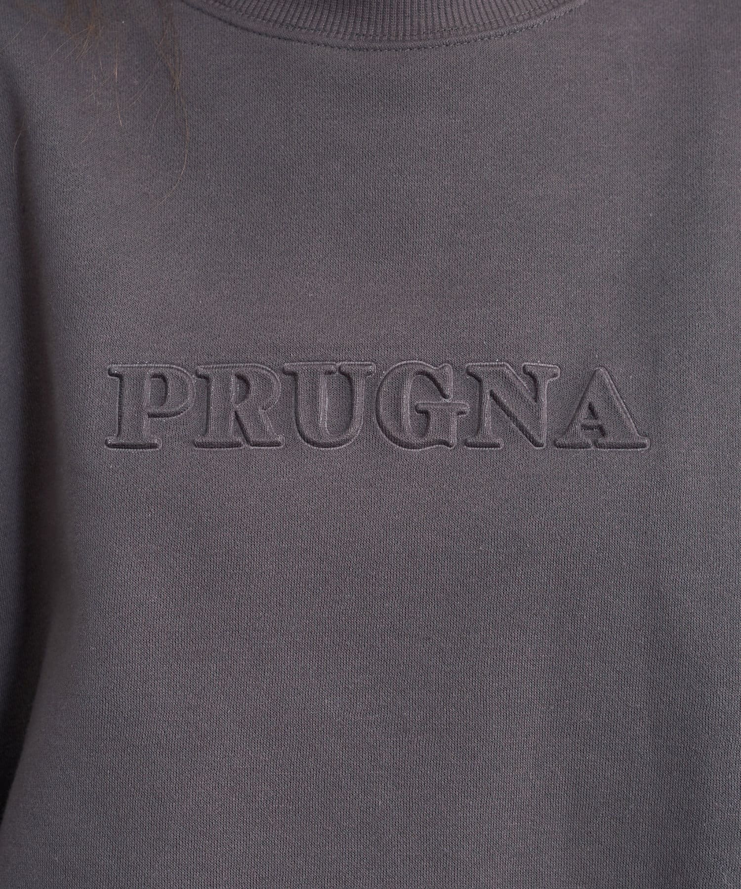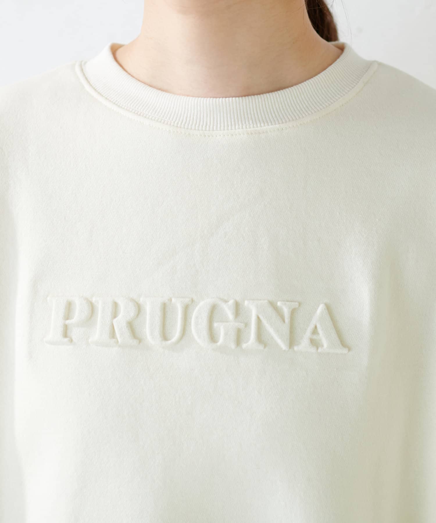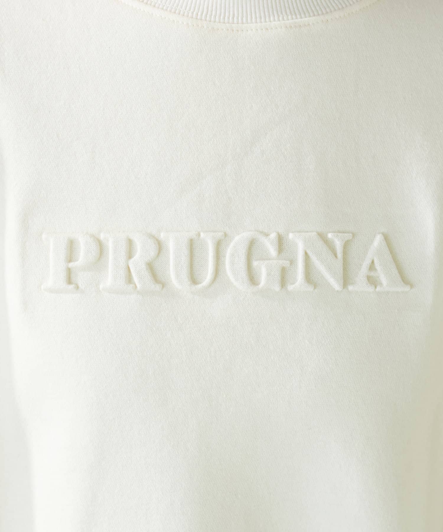 「PURUGNA」”すもも”の意味を持つ胸元のロゴは、エンボス加工のデザインに仕上げ、