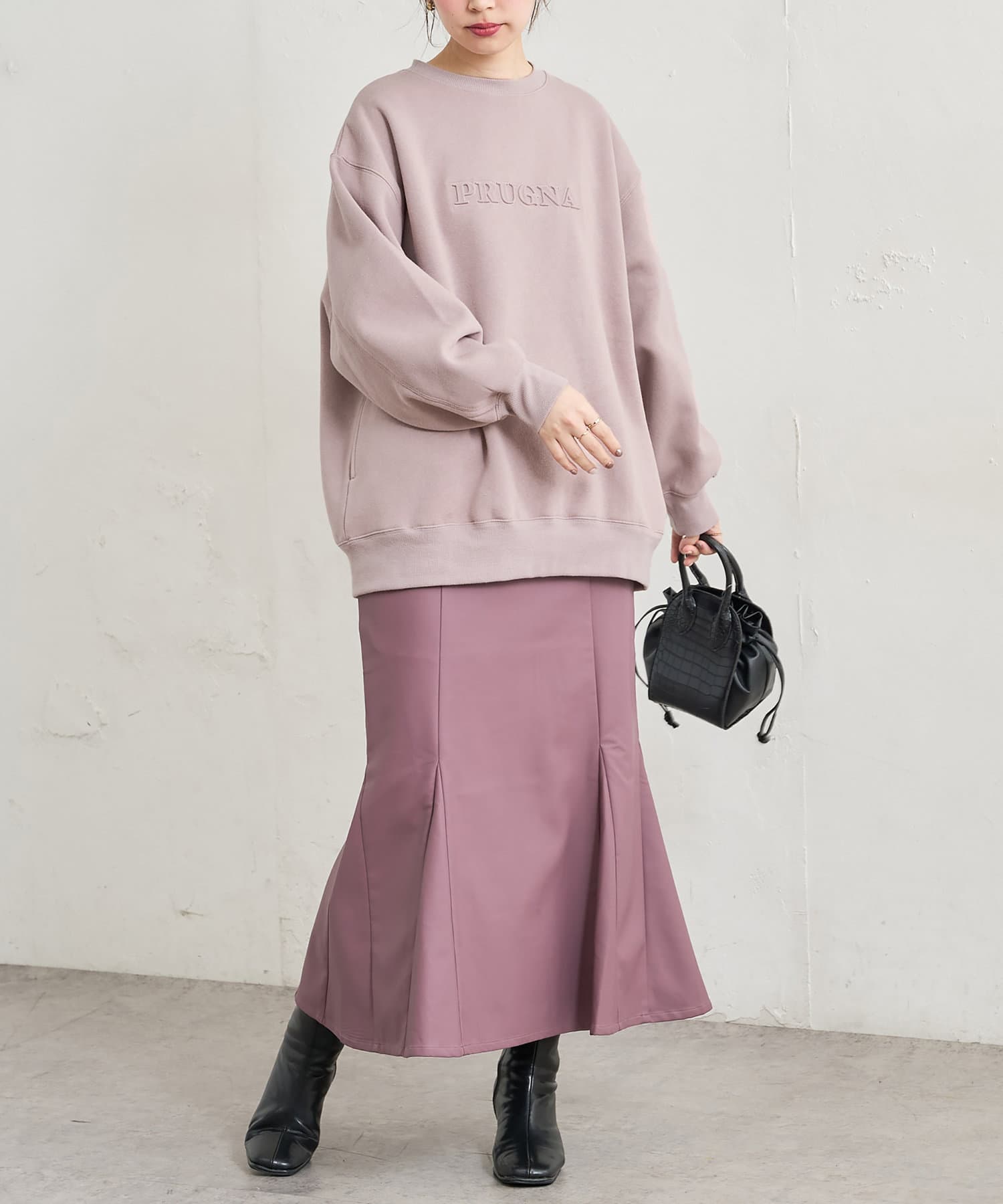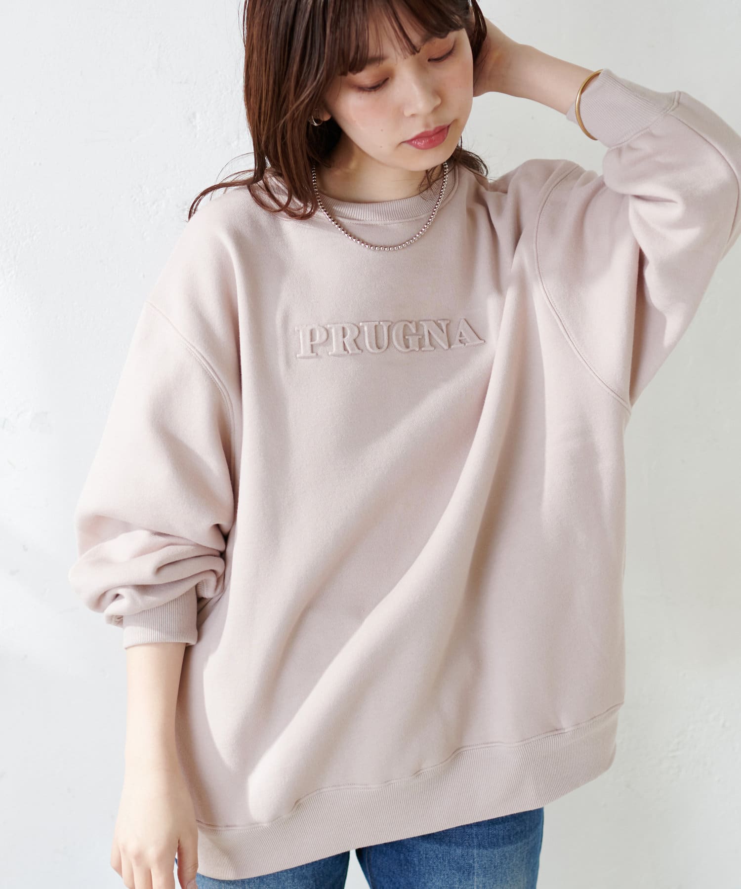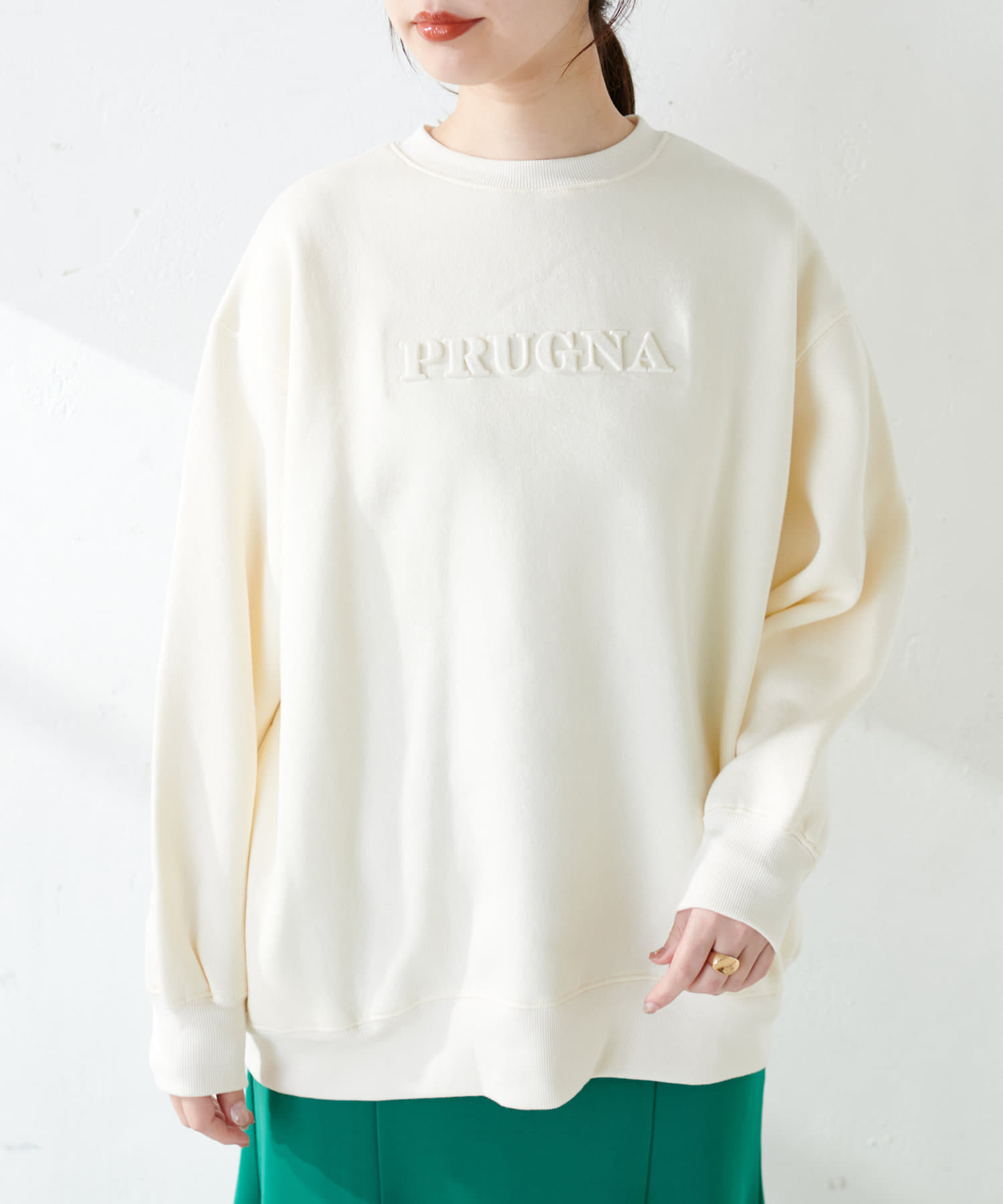 「PURUGNA」”すもも”の意味を持つ胸元のロゴは、エンボス加工のデザインに仕上げ、