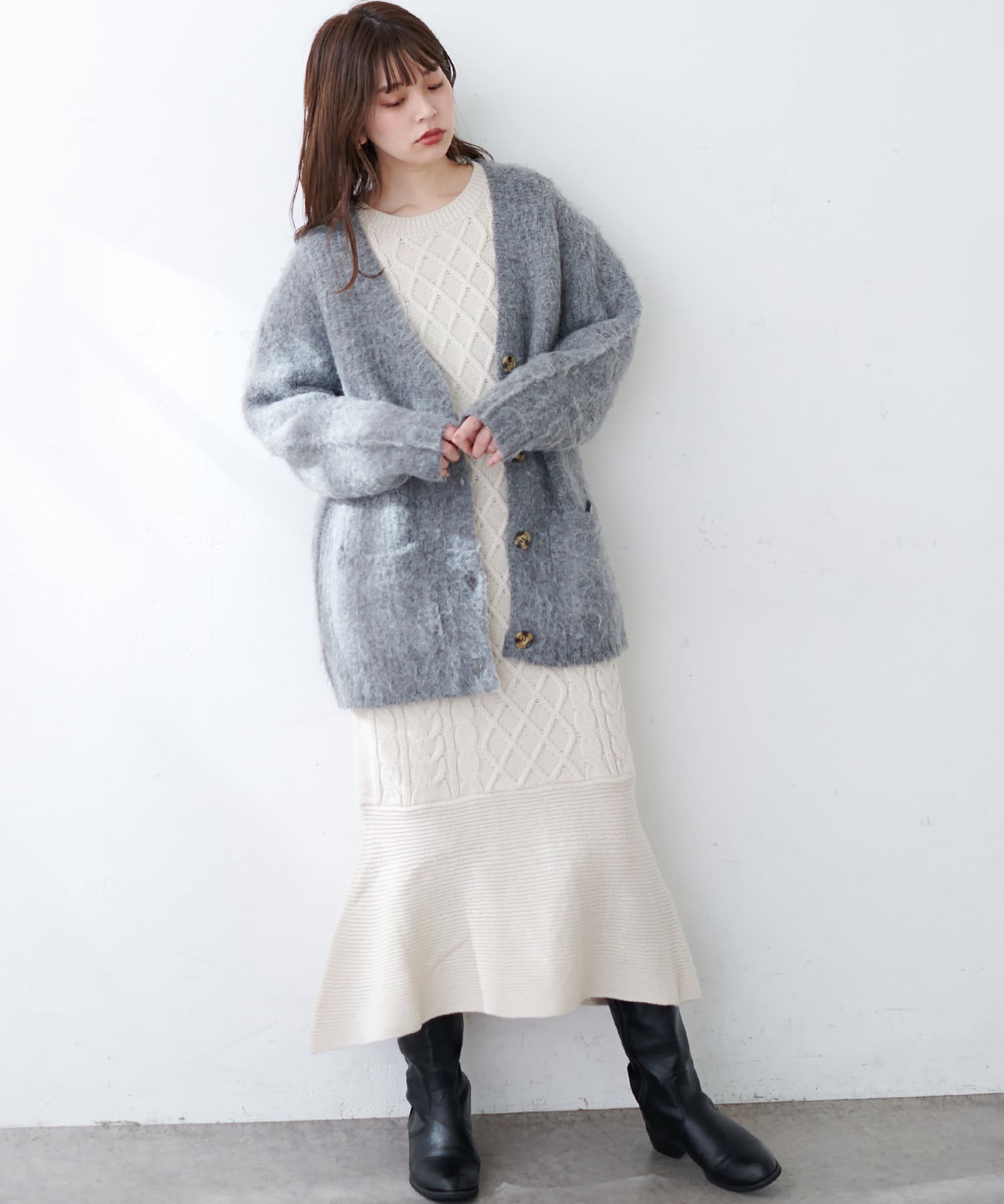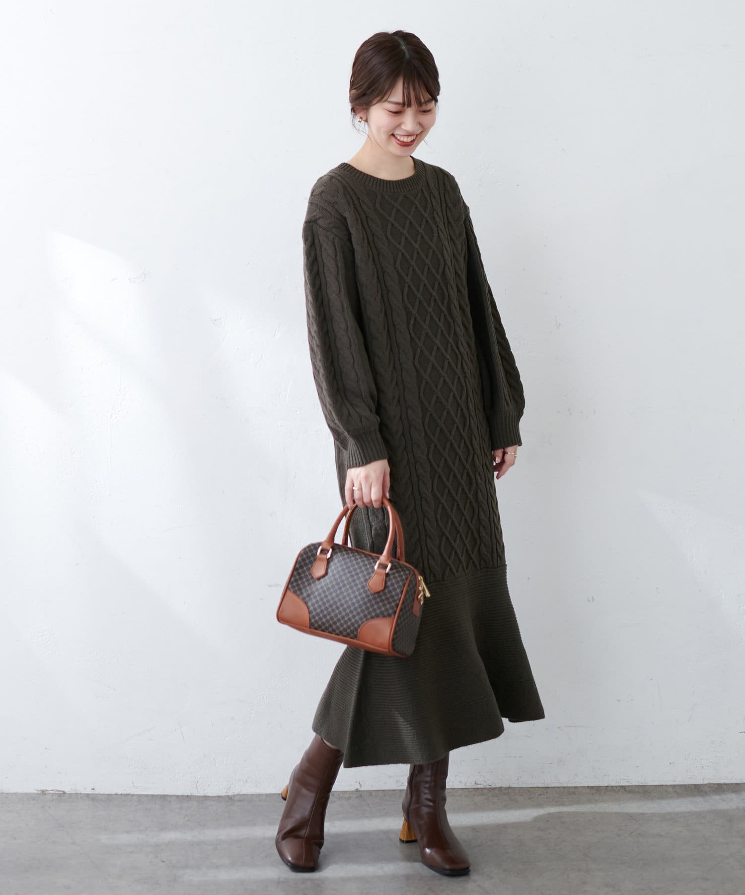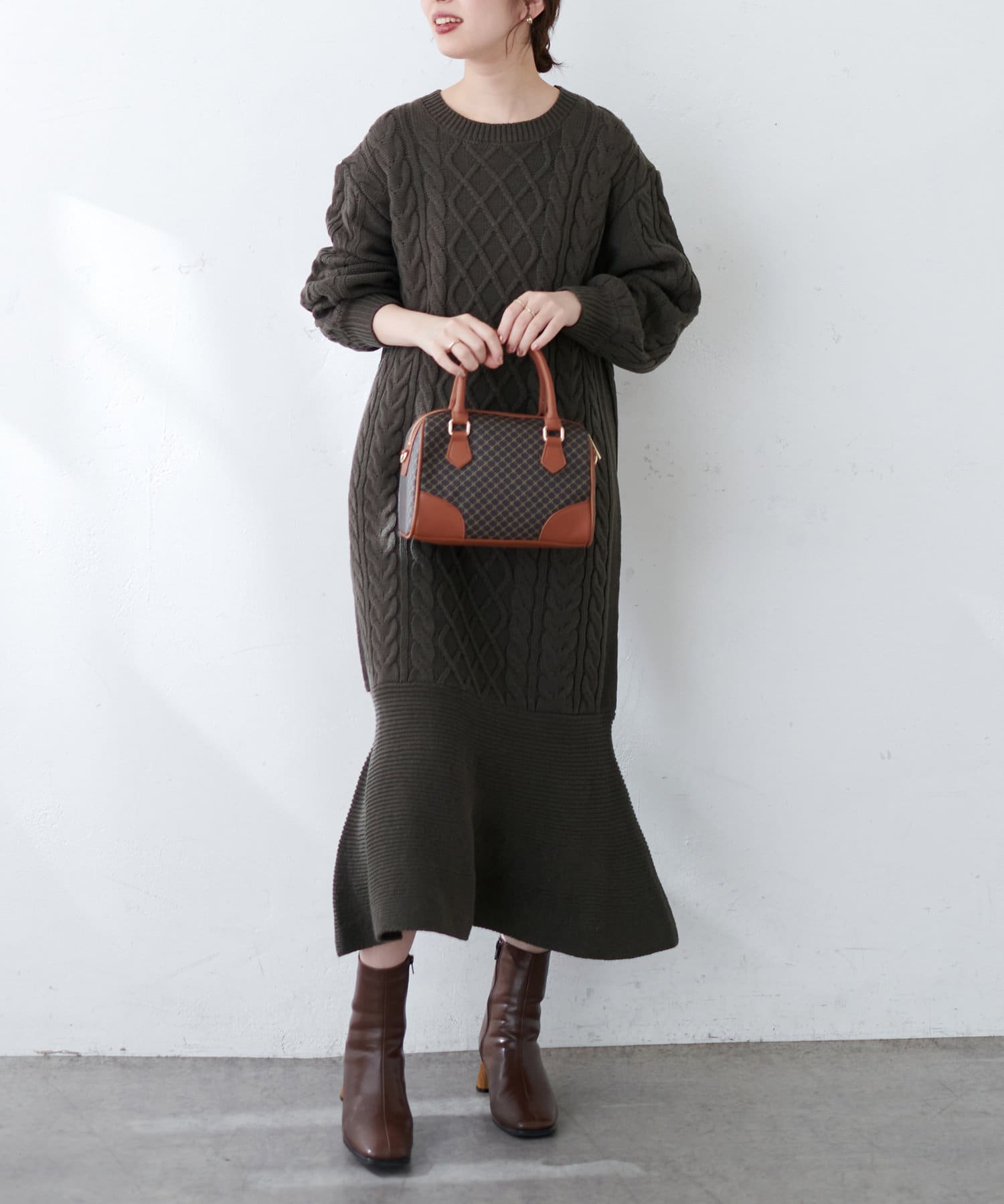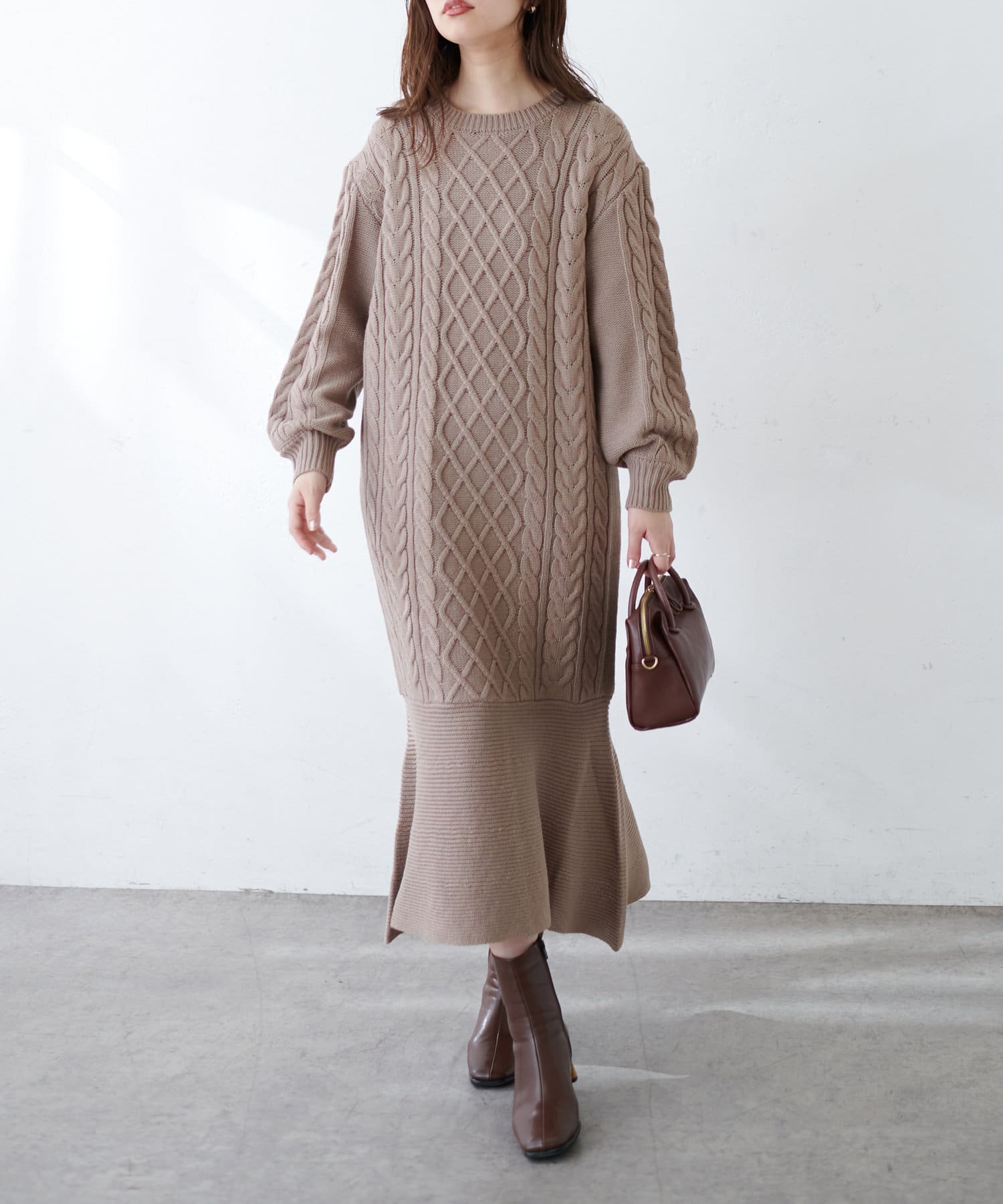 裾フレアケーブルニットワンピース